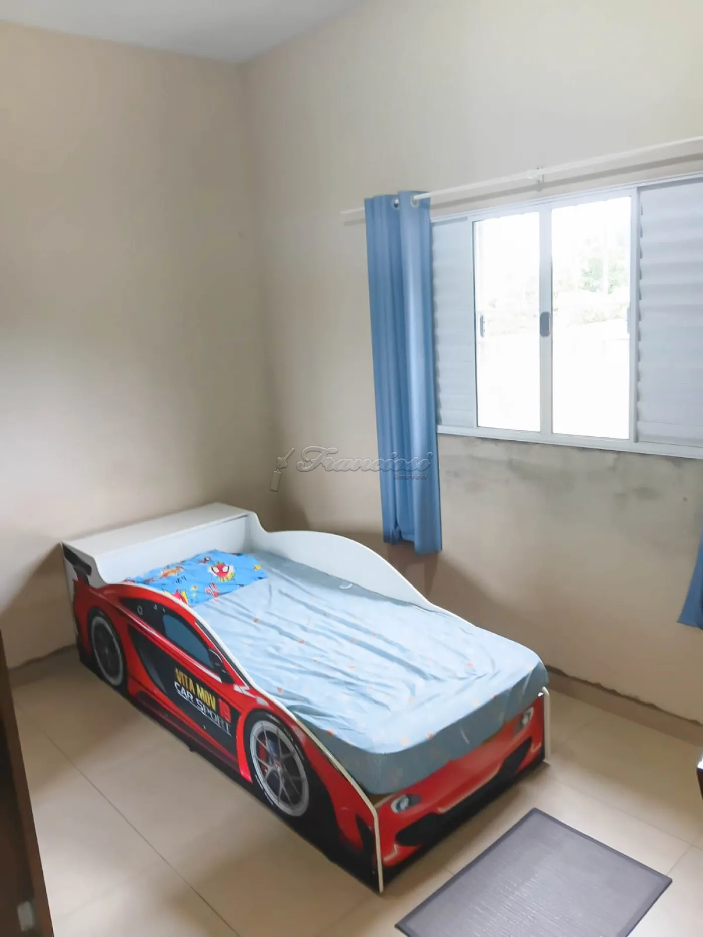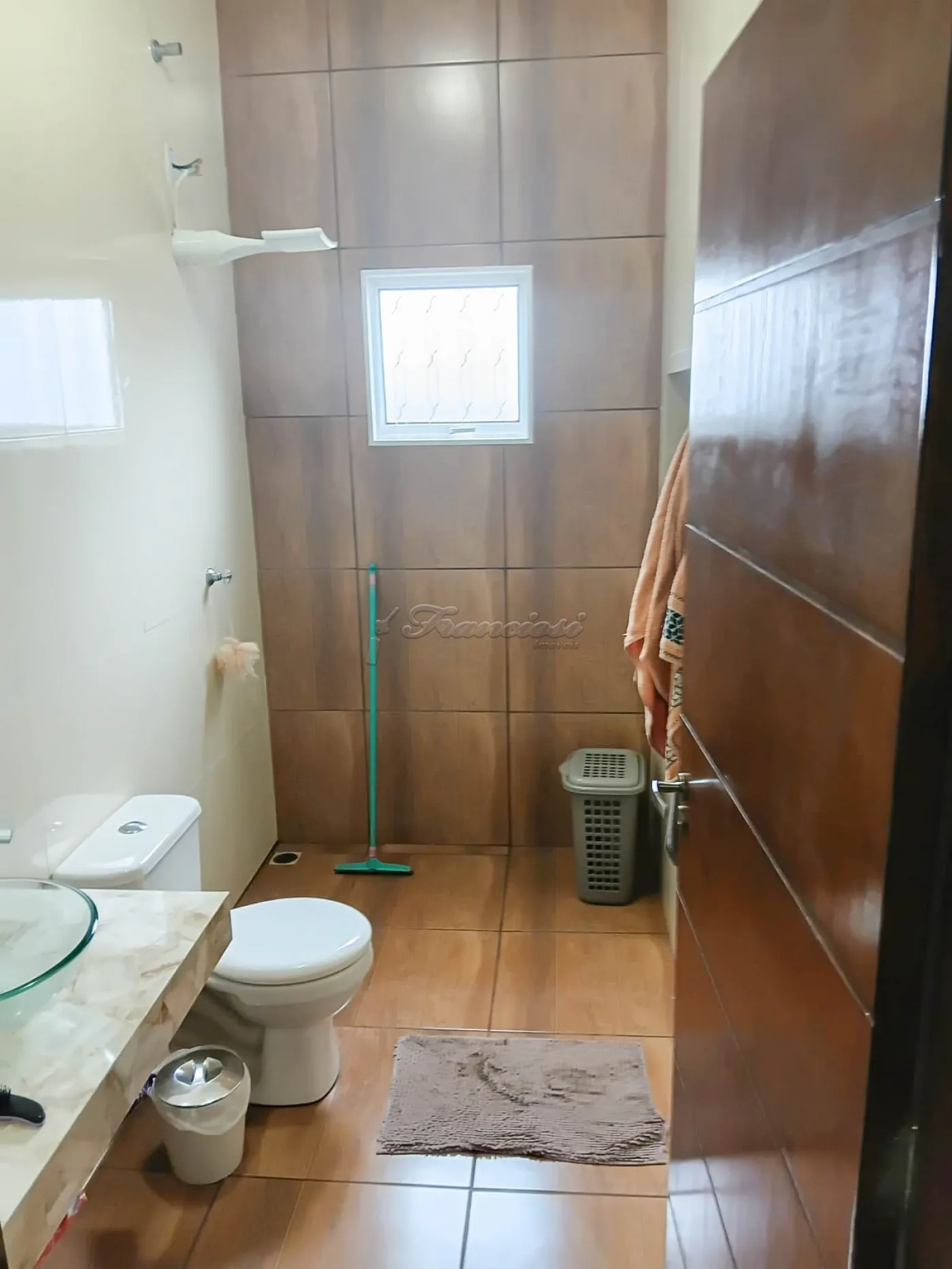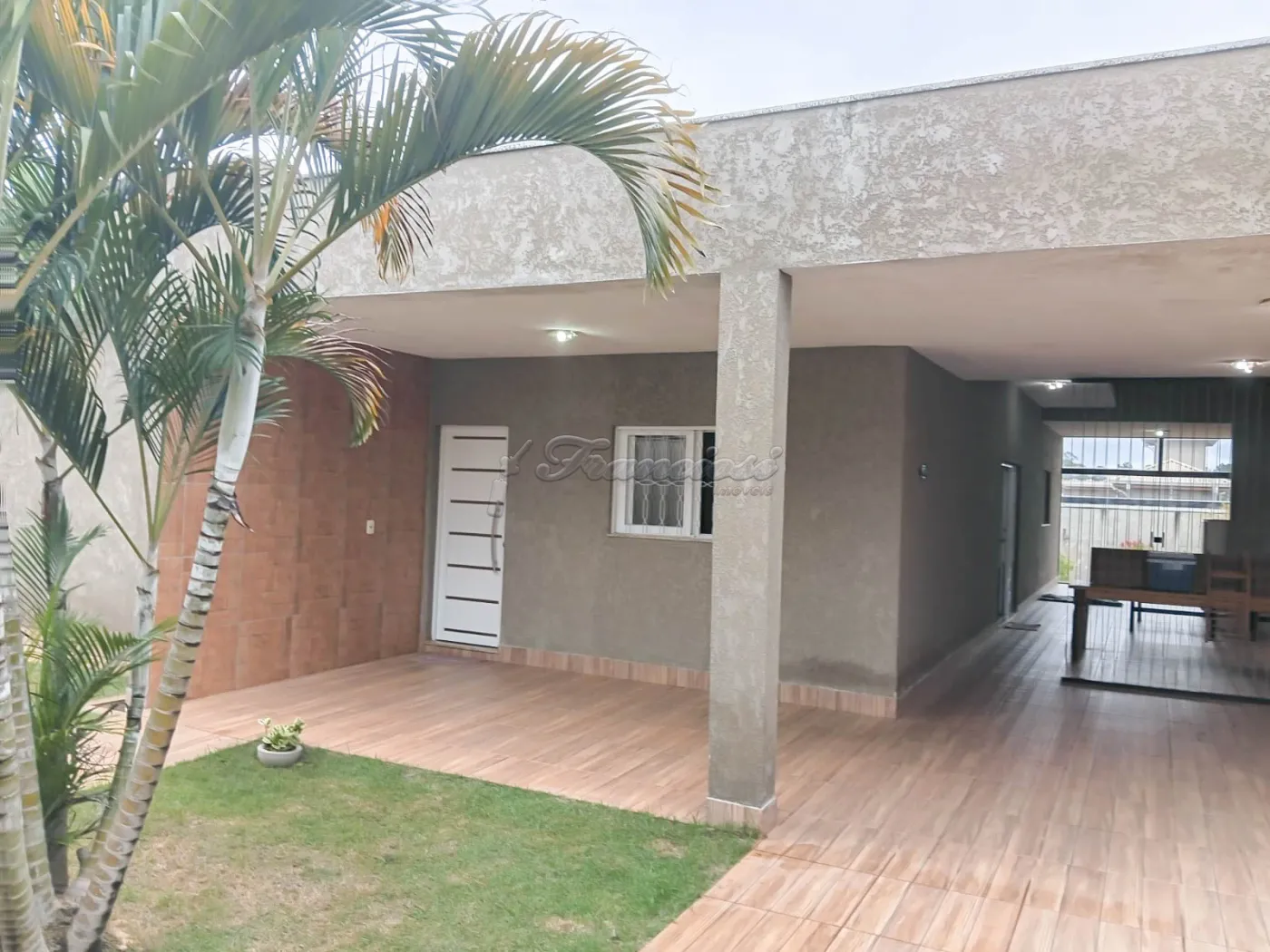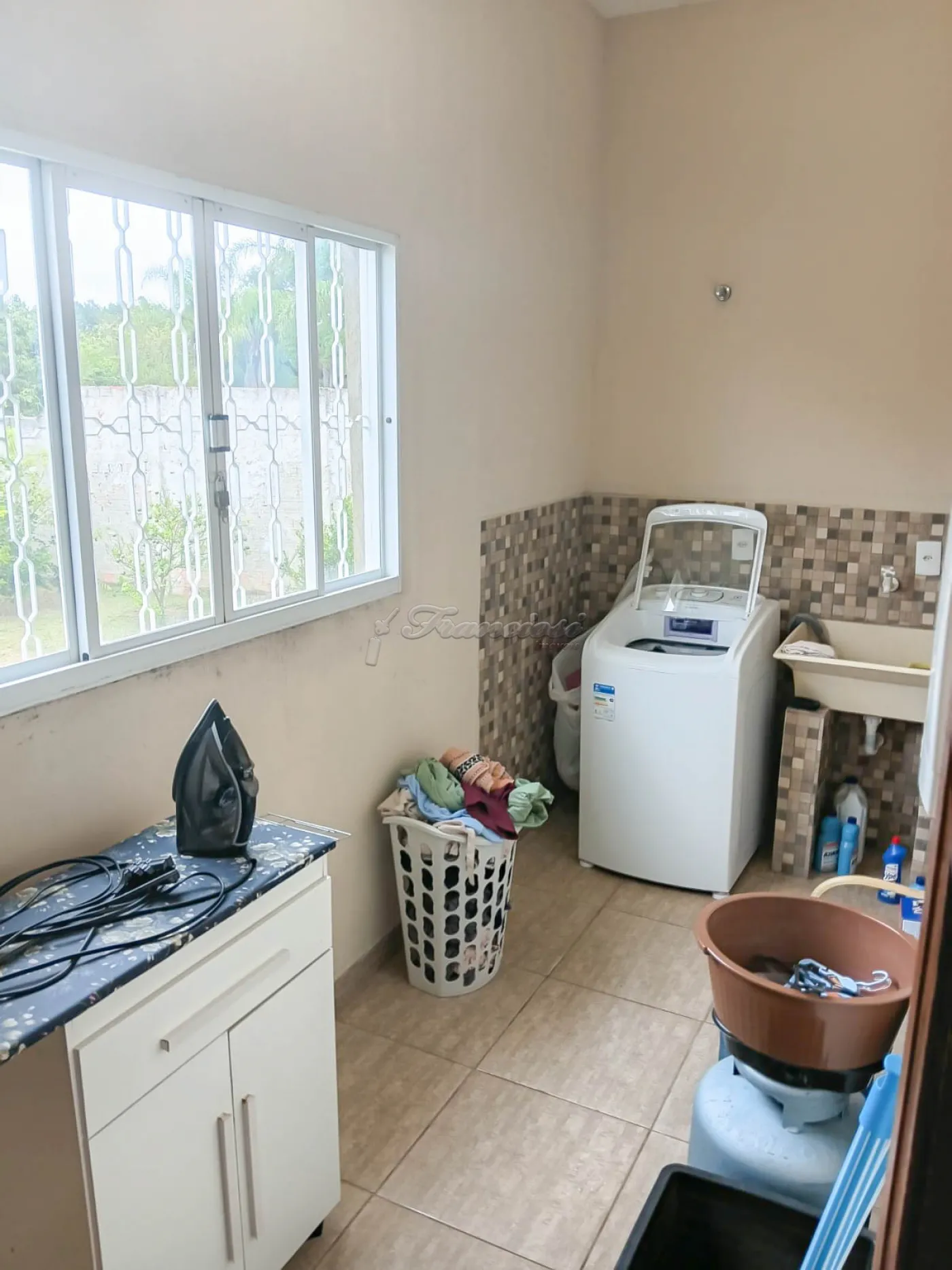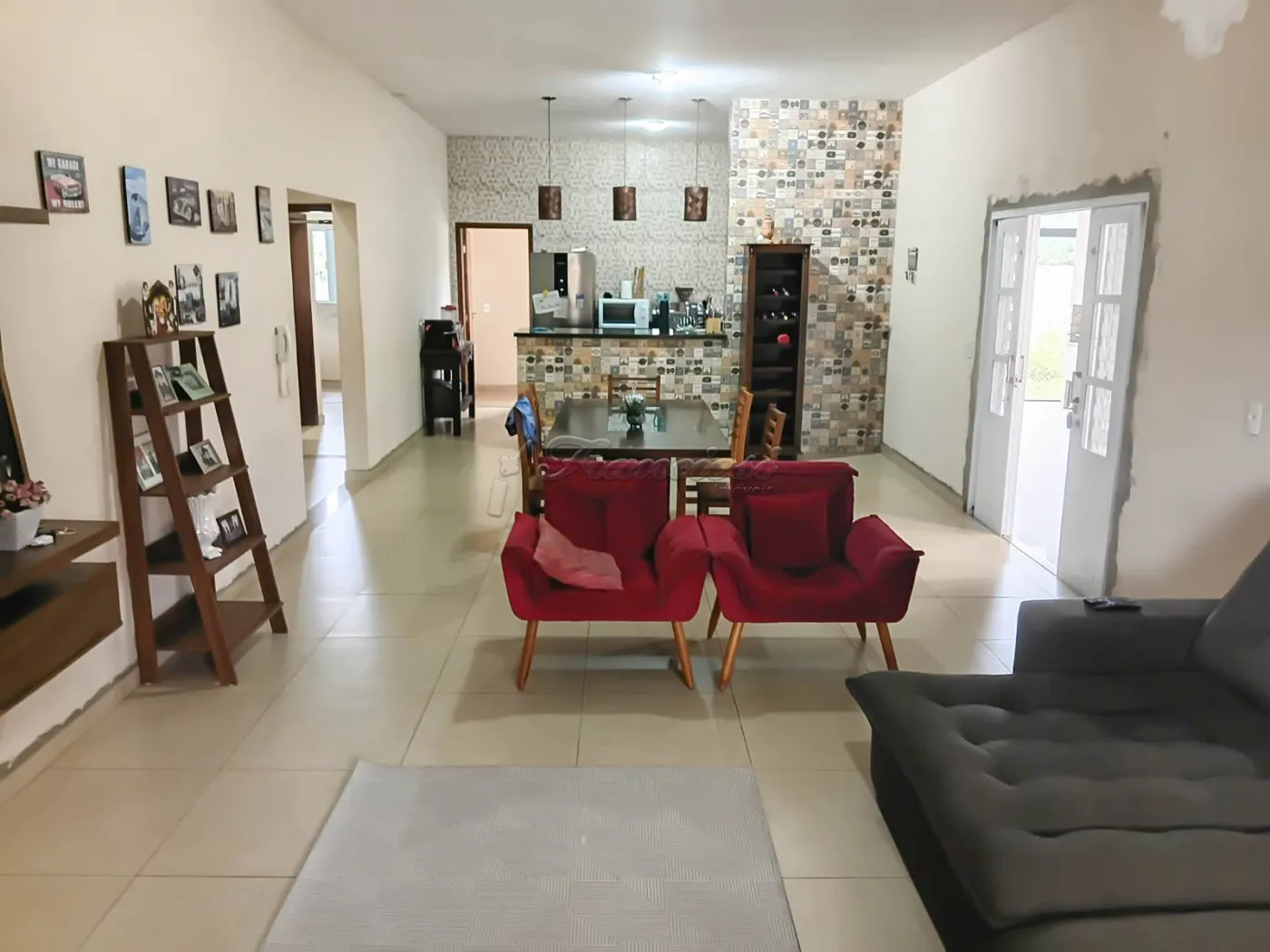 Chácara com 3 dormitórios sendo 1 suíte, sala de estar, cozinha, 1 banheiro social, lavanderia, área de lazer com churrasqueira, quintal com grama, pomar, 1 banheiro externo e garagem coberta para 2 carros.