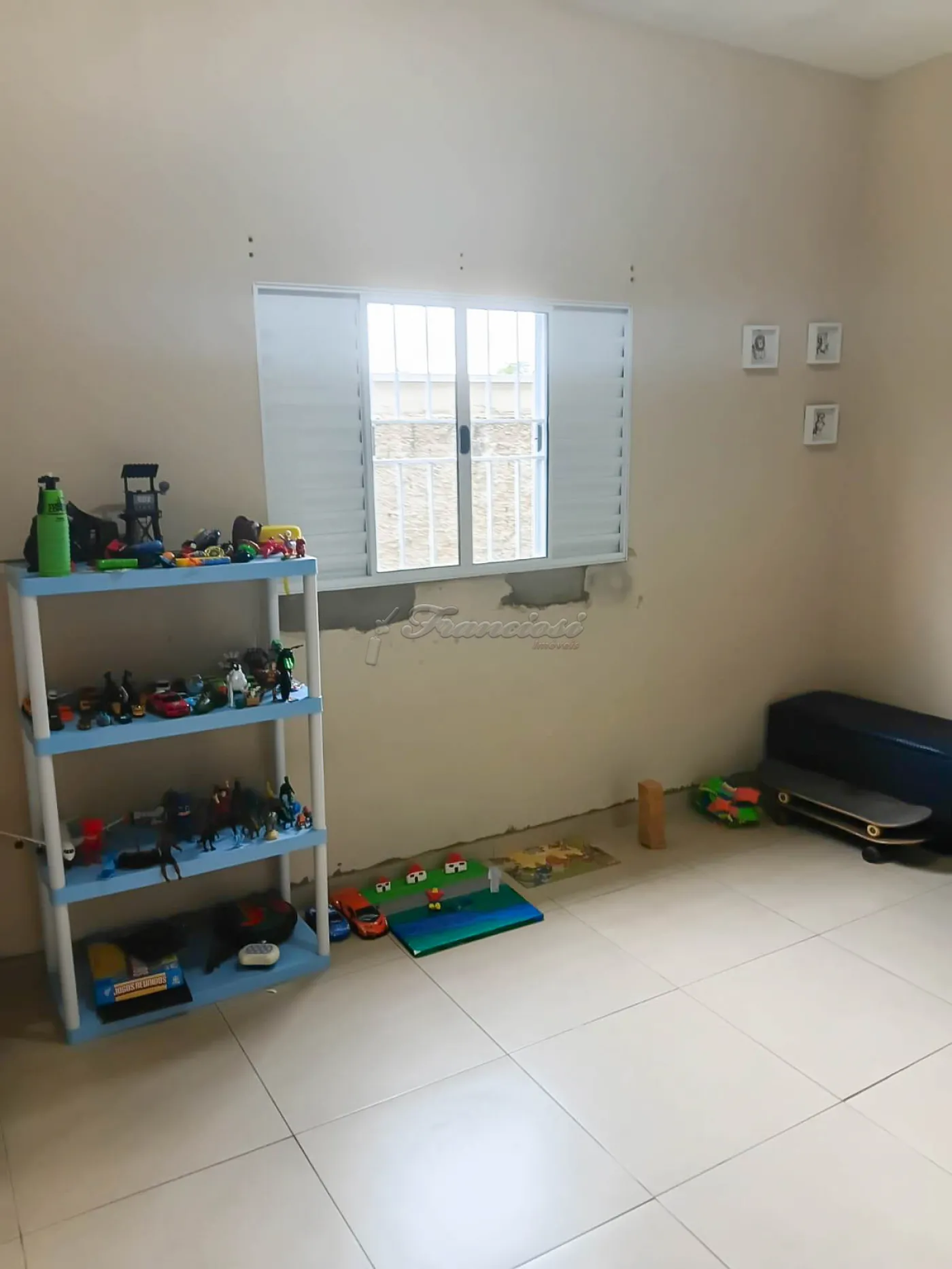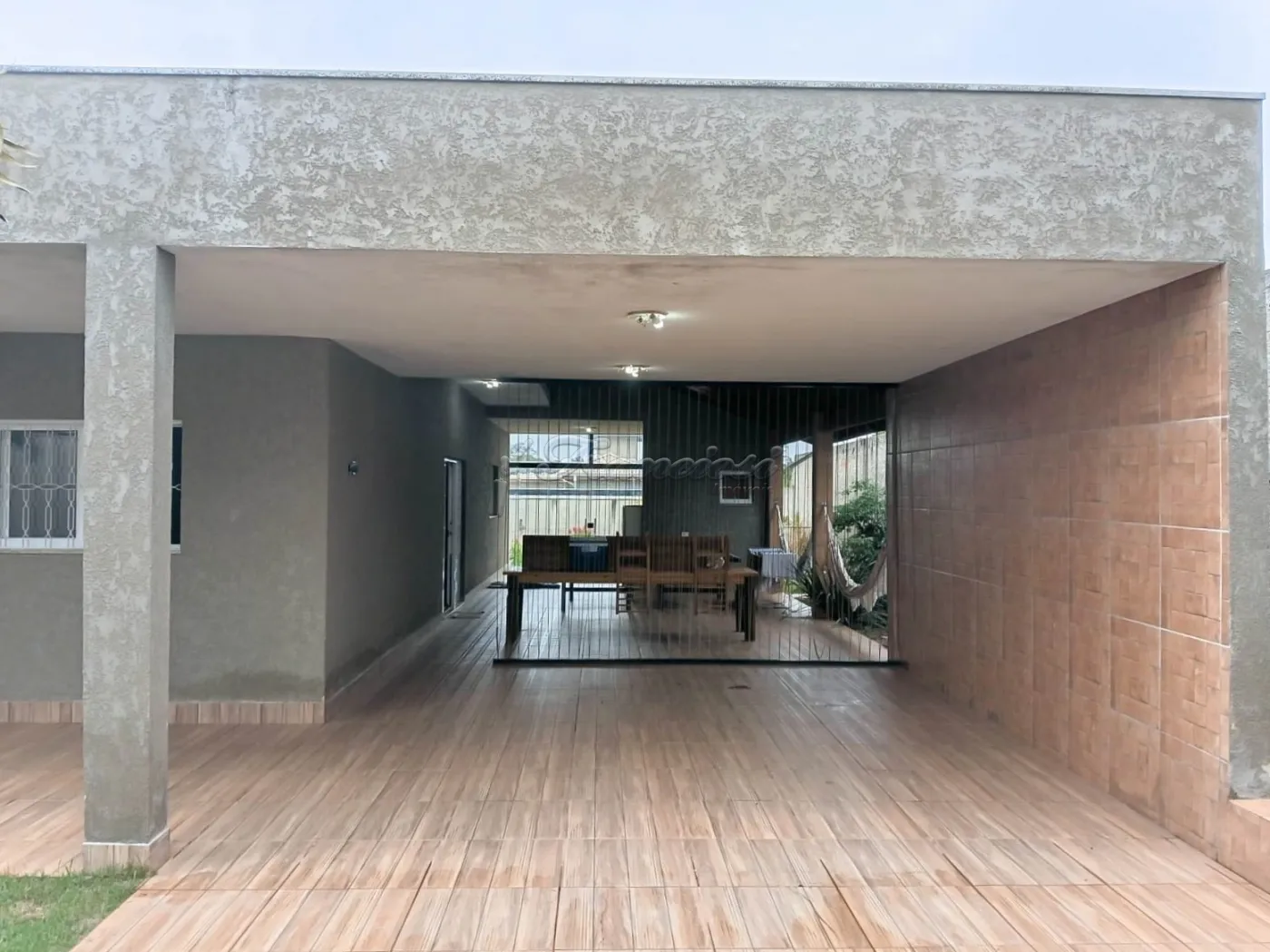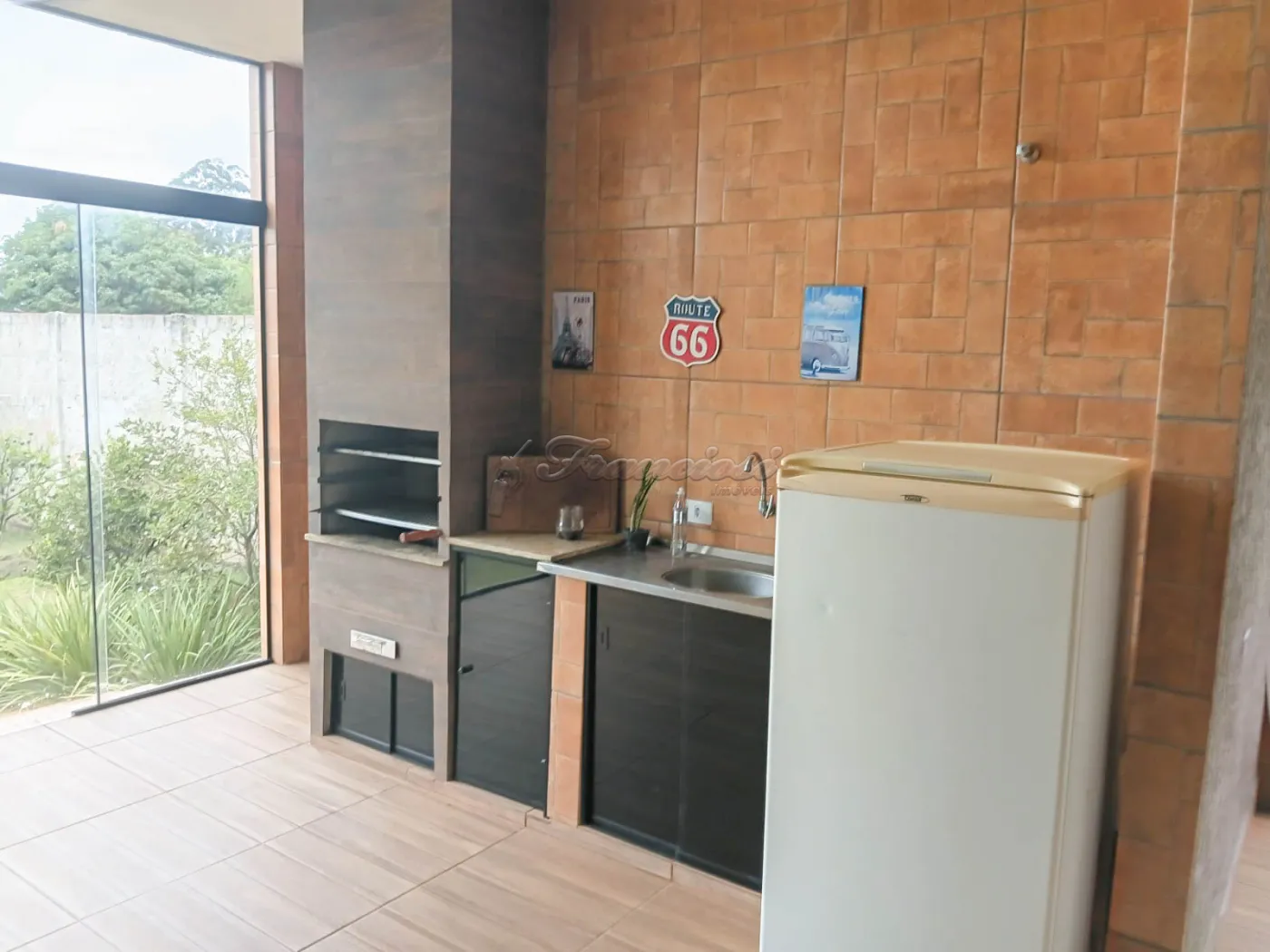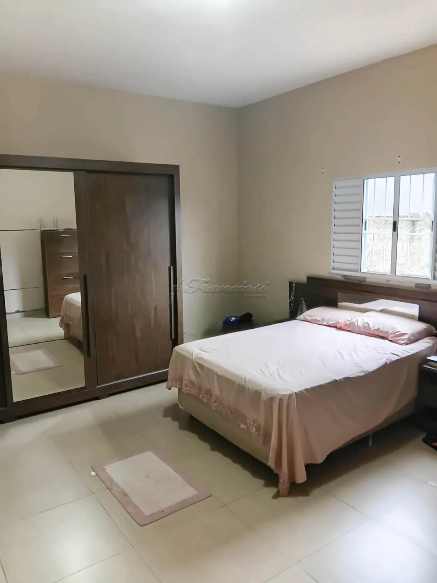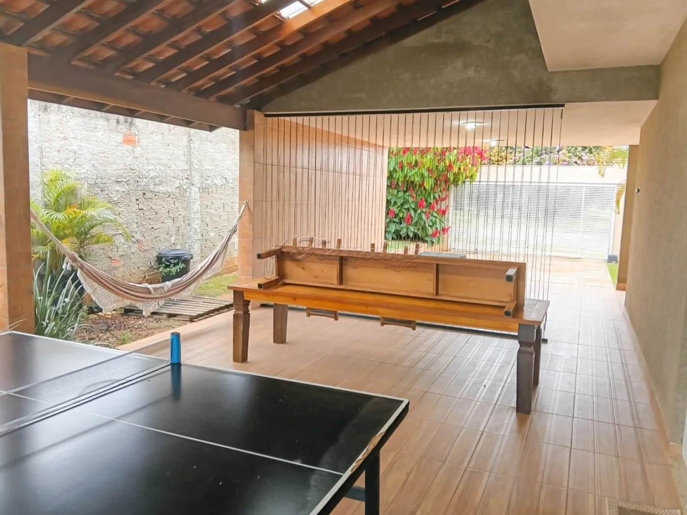 Chácara com 3 dormitórios sendo 1 suíte, sala de estar, cozinha, 1 banheiro social, lavanderia, área de lazer com churrasqueira, quintal com grama, pomar, 1 banheiro externo e garagem coberta para 2 carros.