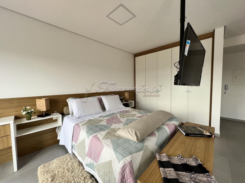 Studio mobiliado com cama de casal, tv, cômoda e armário embutido, sofá e rack, 1 banheiro com box blindex e gabinete, área de serviço, cozinha com armário modulado, fogão cooktop indução, forno, coifa e balcão com 2 banquetas.