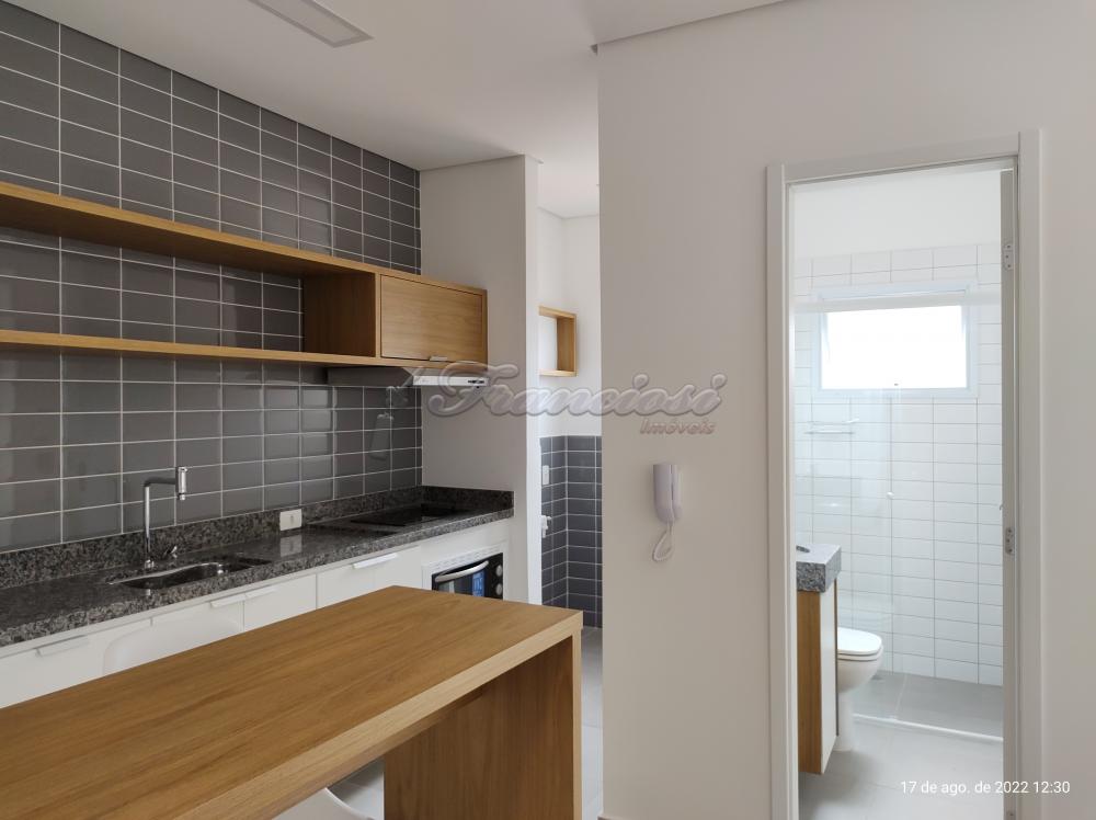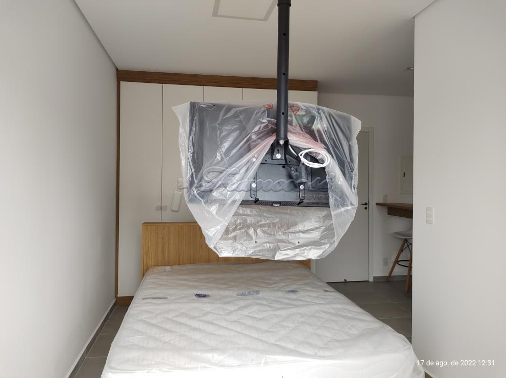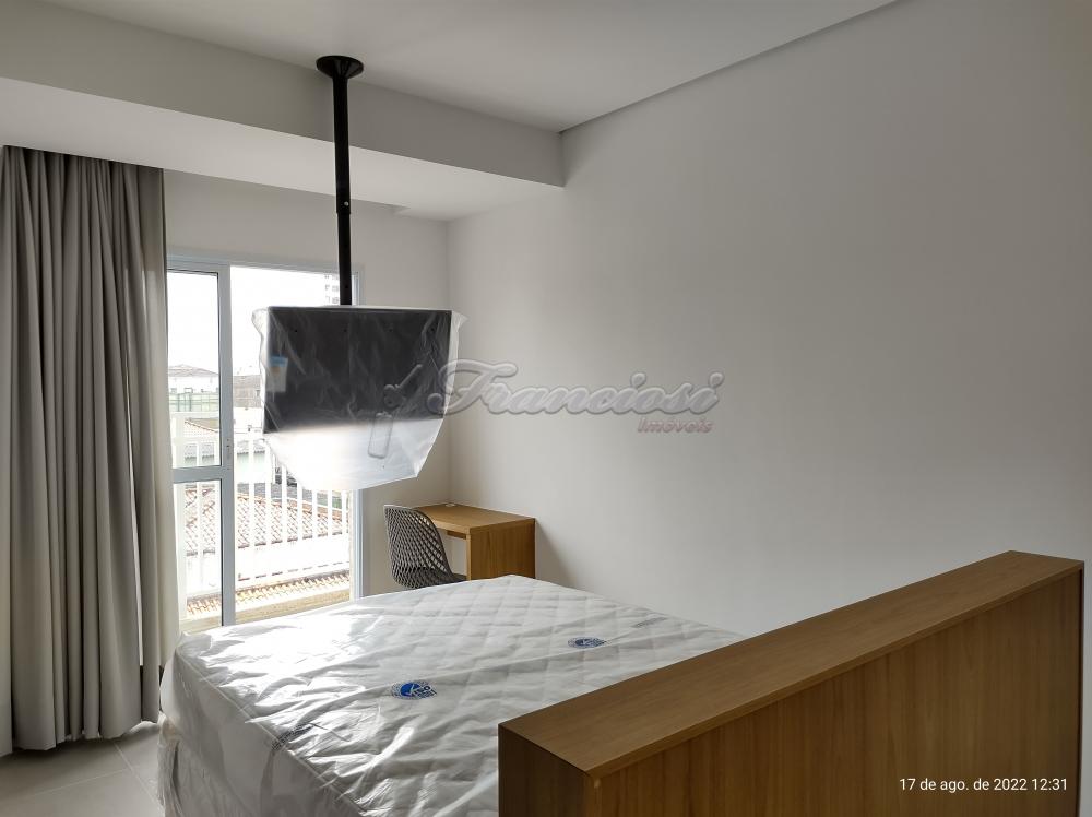 Studio mobiliado com cama de casal, tv, cômoda e armário embutido, 1 banheiro com box blindex e gabinete, área de serviço, cozinha com armário modulado, fogão cooktop indução, forno, coifa e balcão com 2 banquetas.