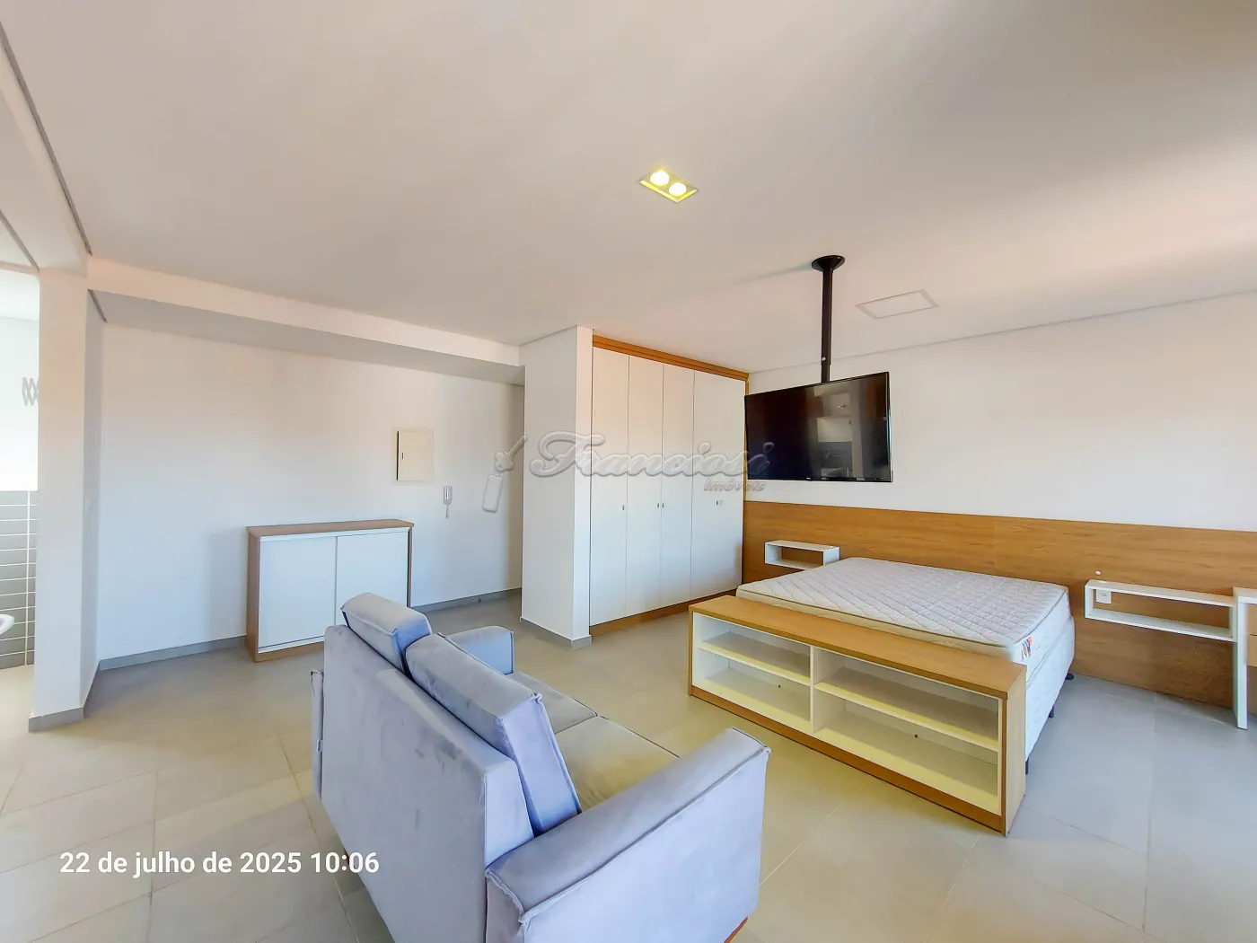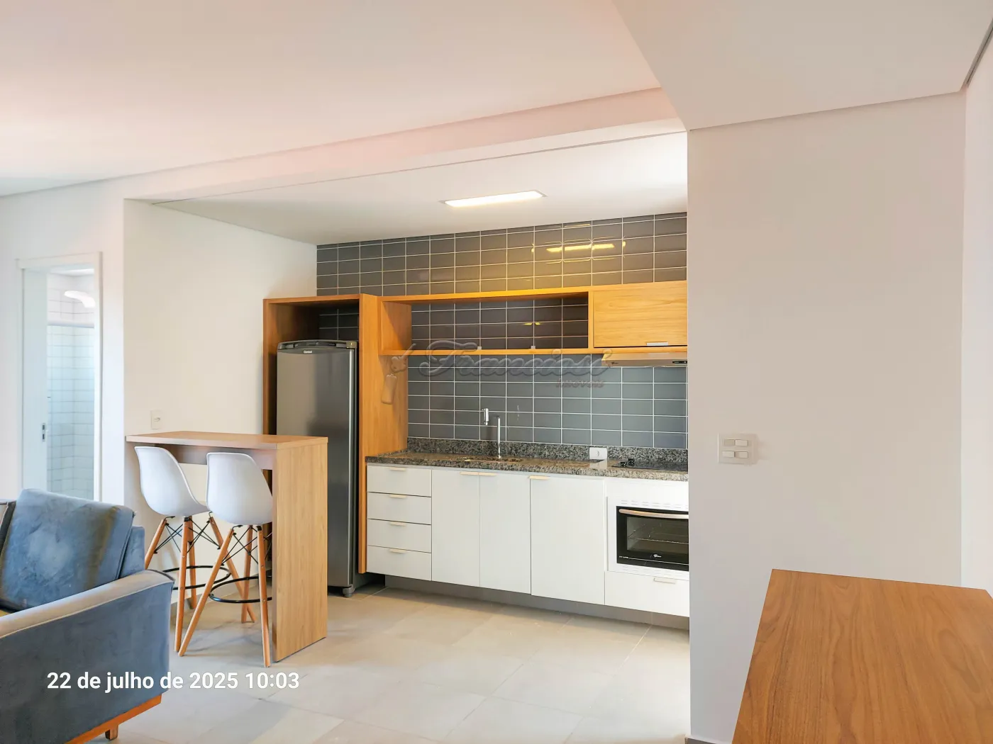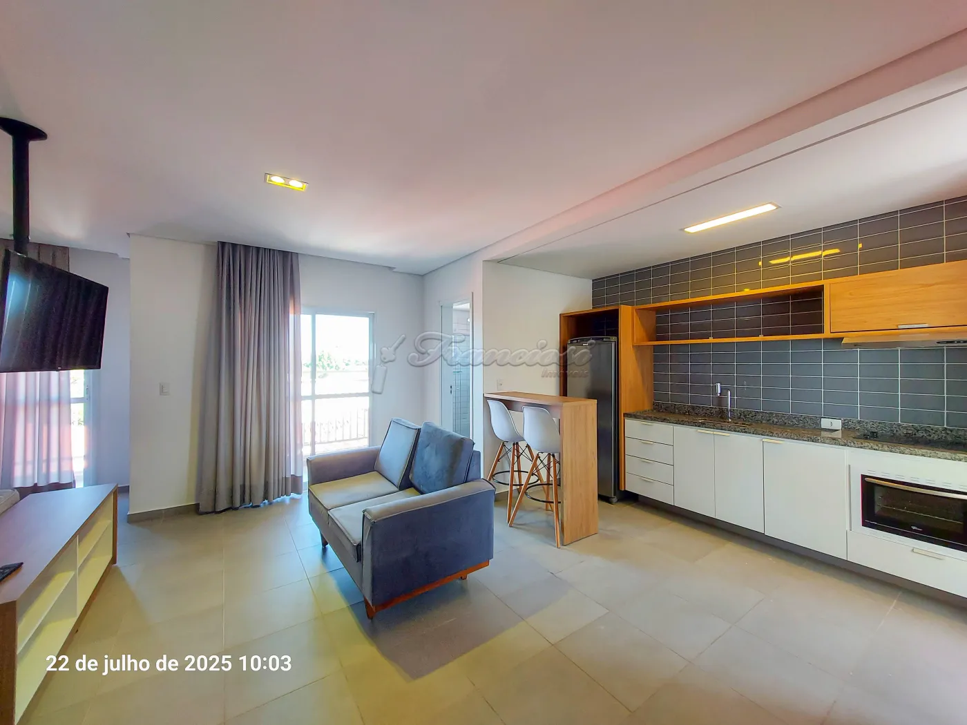 Studio mobiliado com cama de casal, tv, cômoda e armário embutido, sofá e rack, 1 banheiro com box blindex e gabinete, área de serviço, cozinha com armário modulado, fogão cooktop indução, forno, coifa e balcão com 2 banquetas.