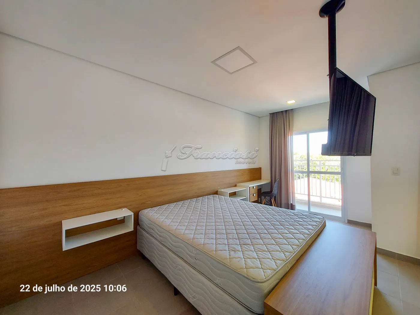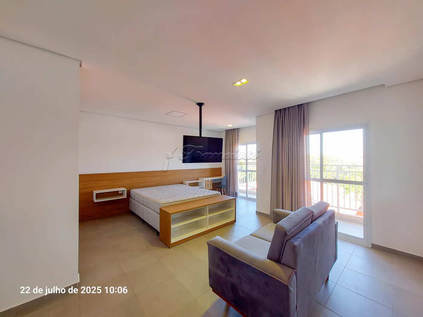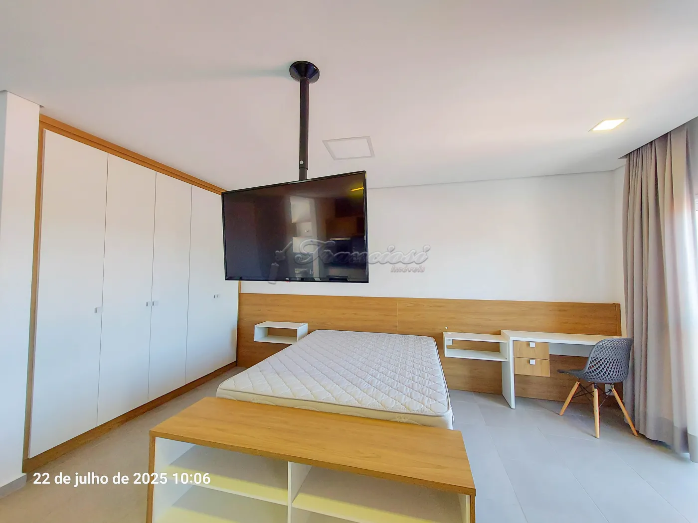 Studio mobiliado com cama de casal, tv, cômoda e armário embutido, sofá e rack, 1 banheiro com box blindex e gabinete, área de serviço, cozinha com armário modulado, fogão cooktop indução, forno, coifa e balcão com 2 banquetas.