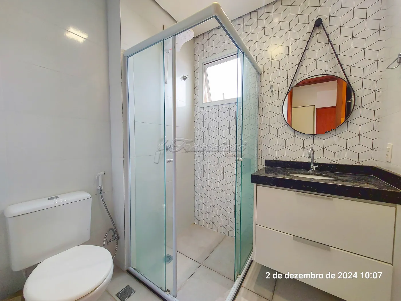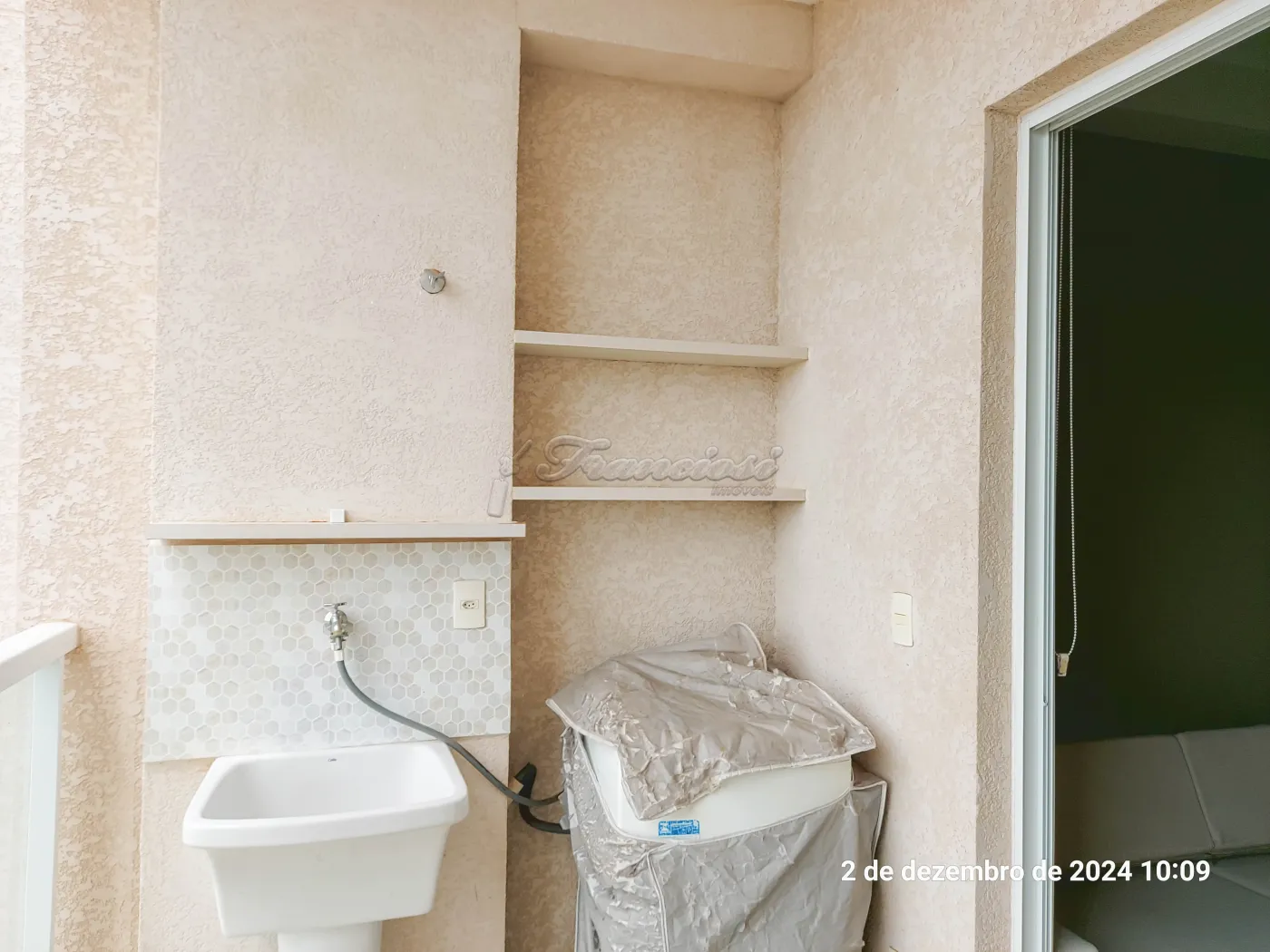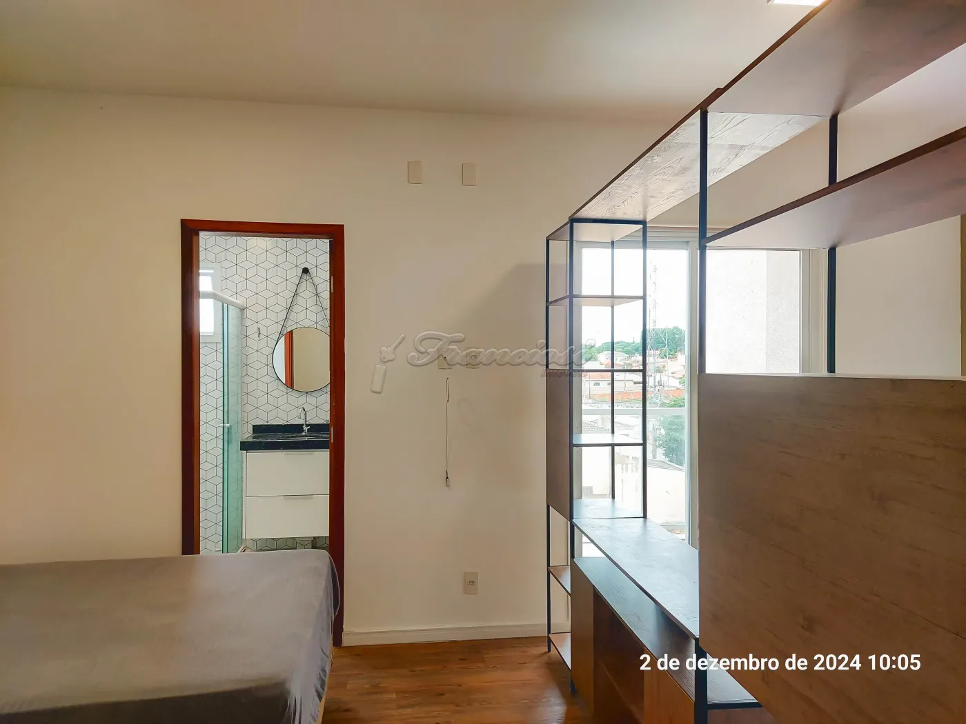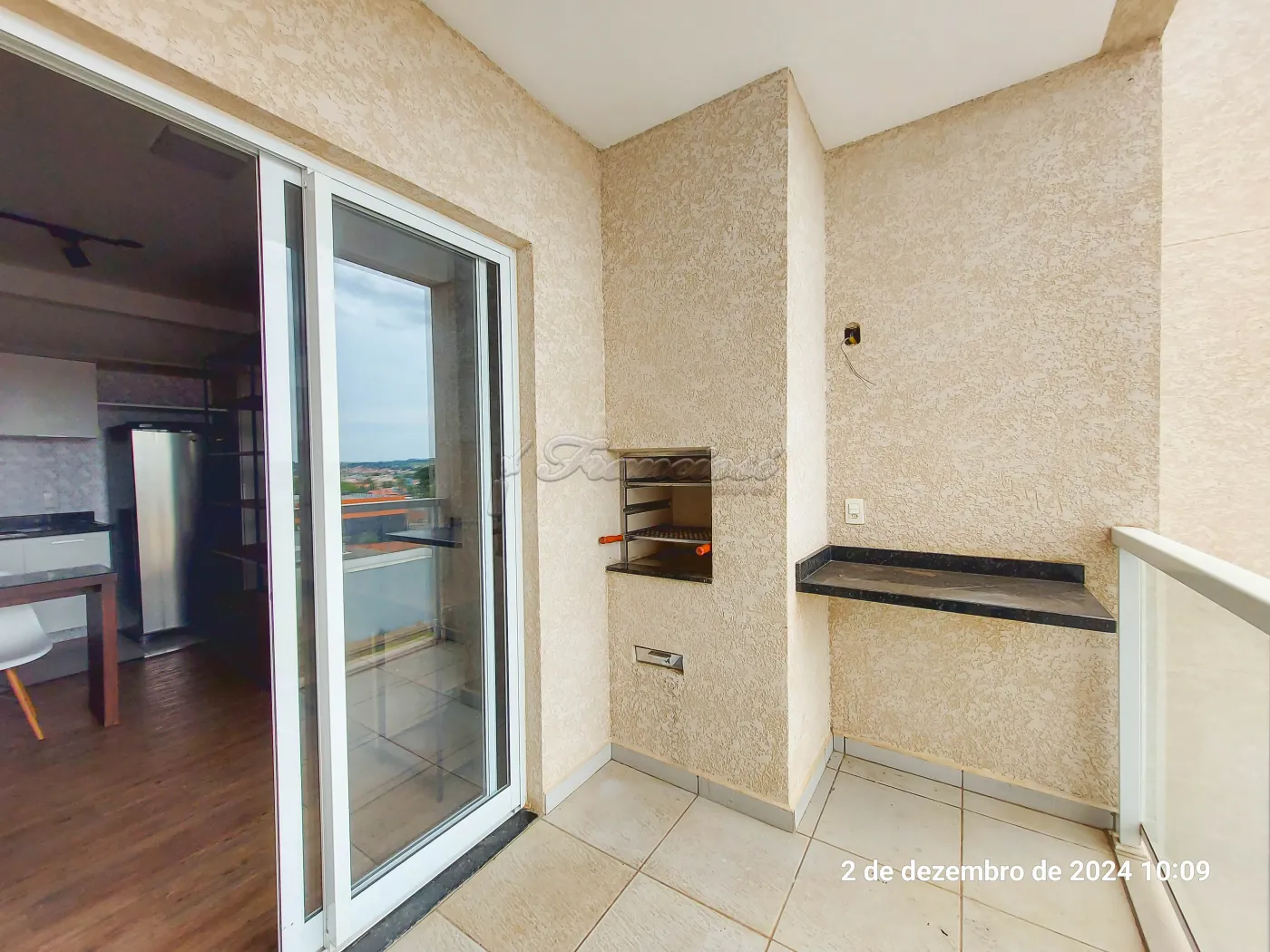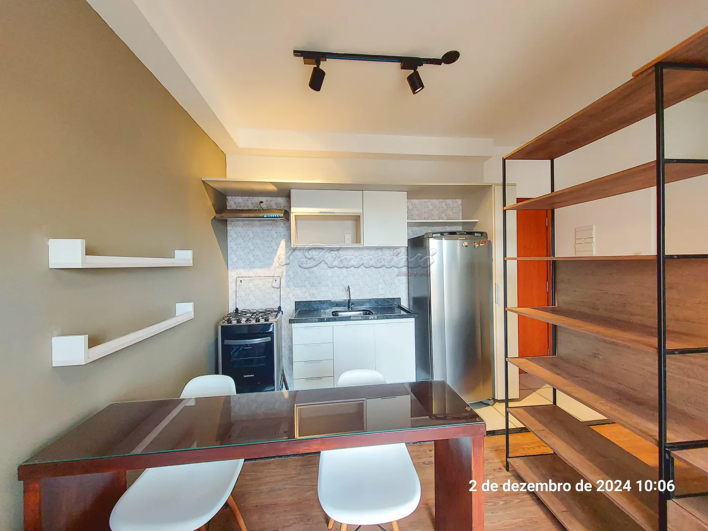 Studio mobiliado com cama, sofá, geladeira, fogão, 1 banheiro social com box blindex, varanda com churrasqueira e máquina de lavar roupa, vaga para 1 carro.