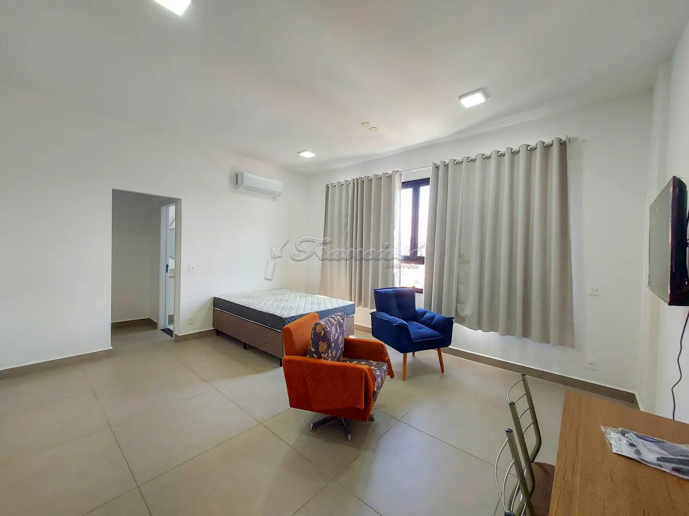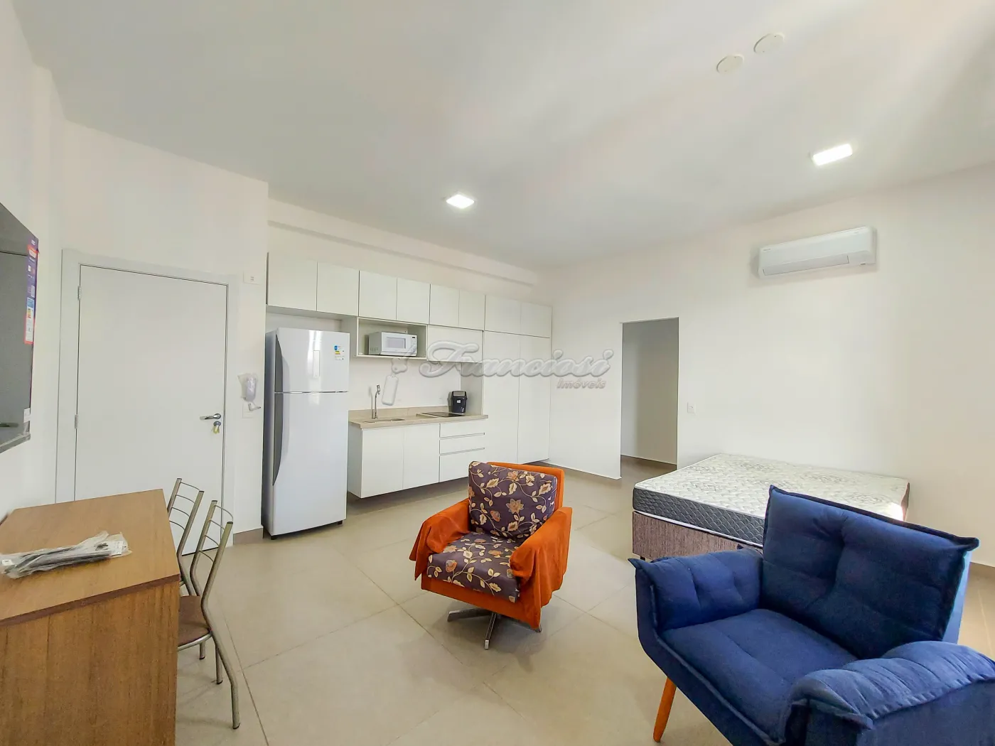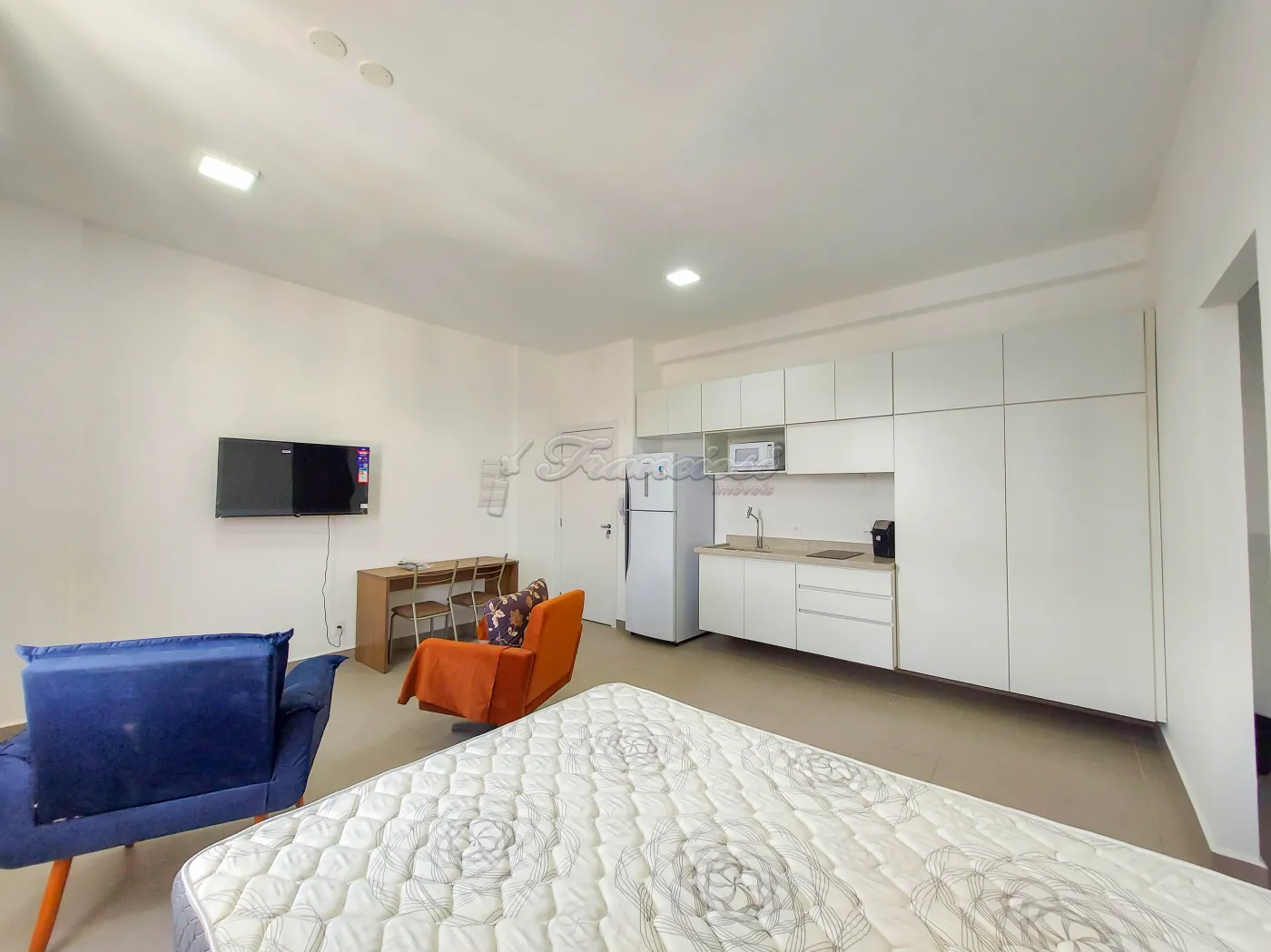 Studio mobiliado com sala, 2 poltronas, cozinha com armário modulado, mesa com 2 cadeiras, TV, geladeira, micro-ondas, 1 cama de casal, ar condicionado., 1 banheiro social com box blindex e com gabinete; área de serviço com armário.