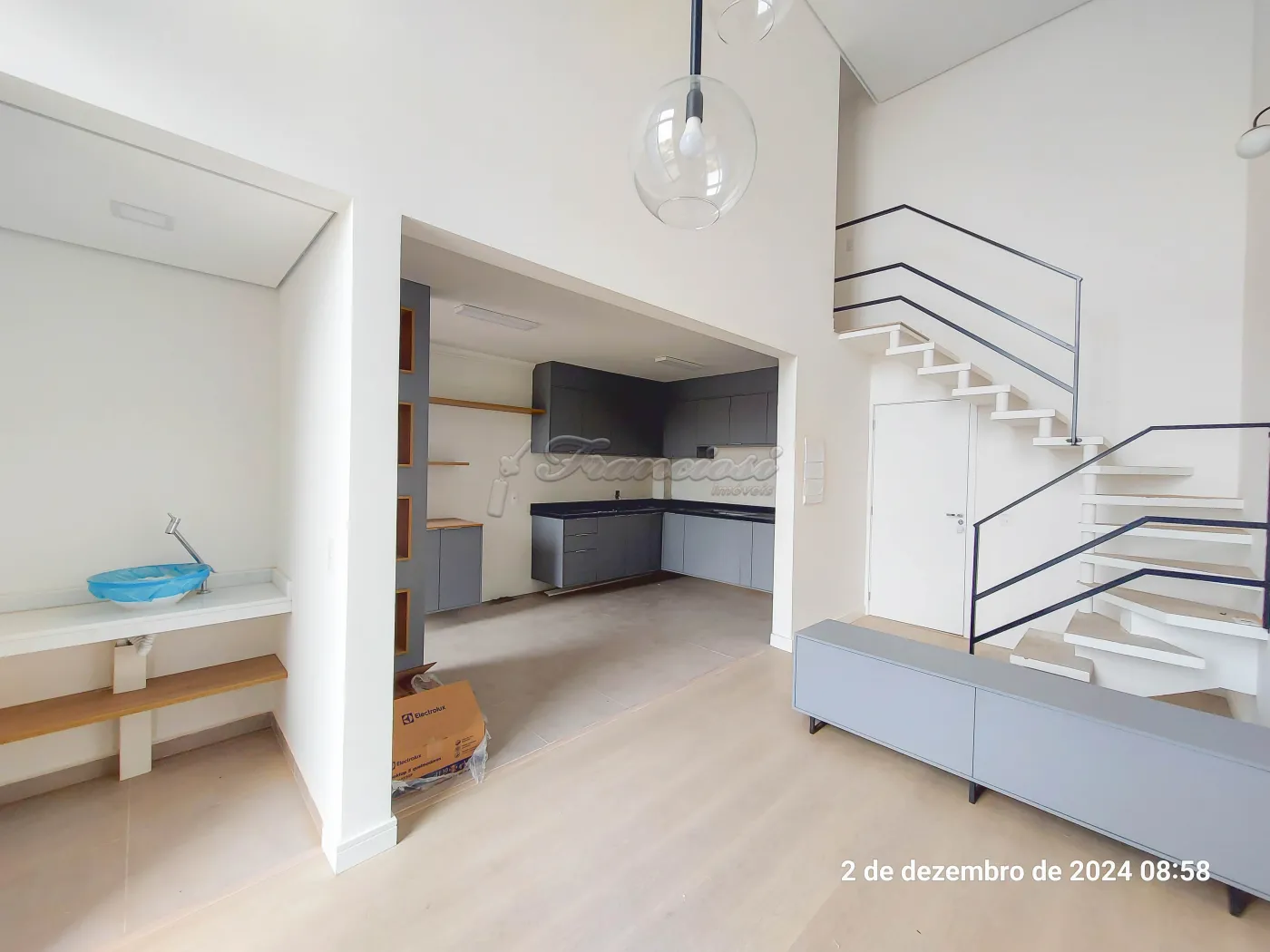 Piso inferior: sala de estar, cozinha com área de serviço integrada, lavabo, varanda gourmet com churrasqueira e vaga para 2 carros. Com armário planejados nas suítes, banheiros, cozinha e área de serviço.