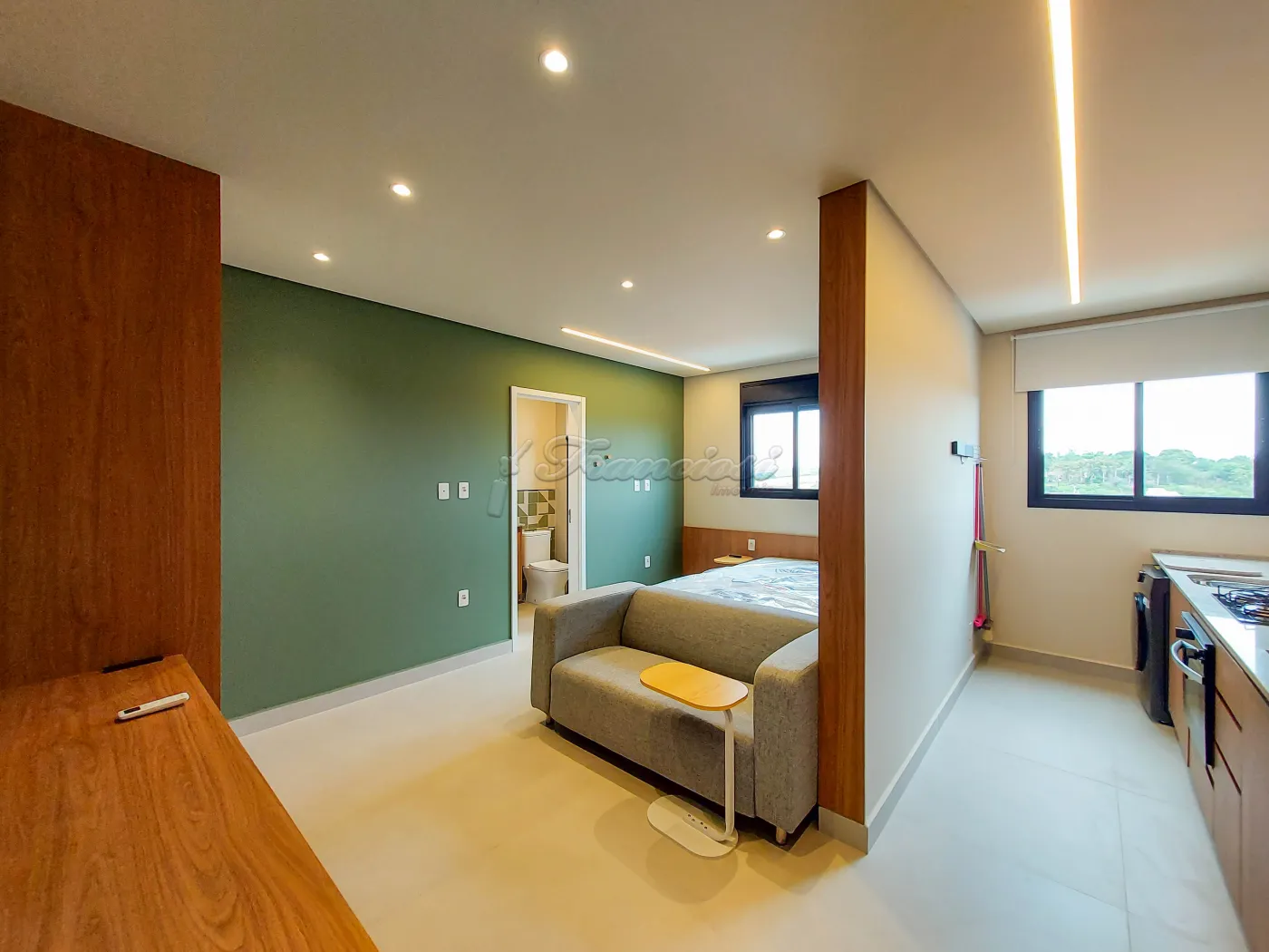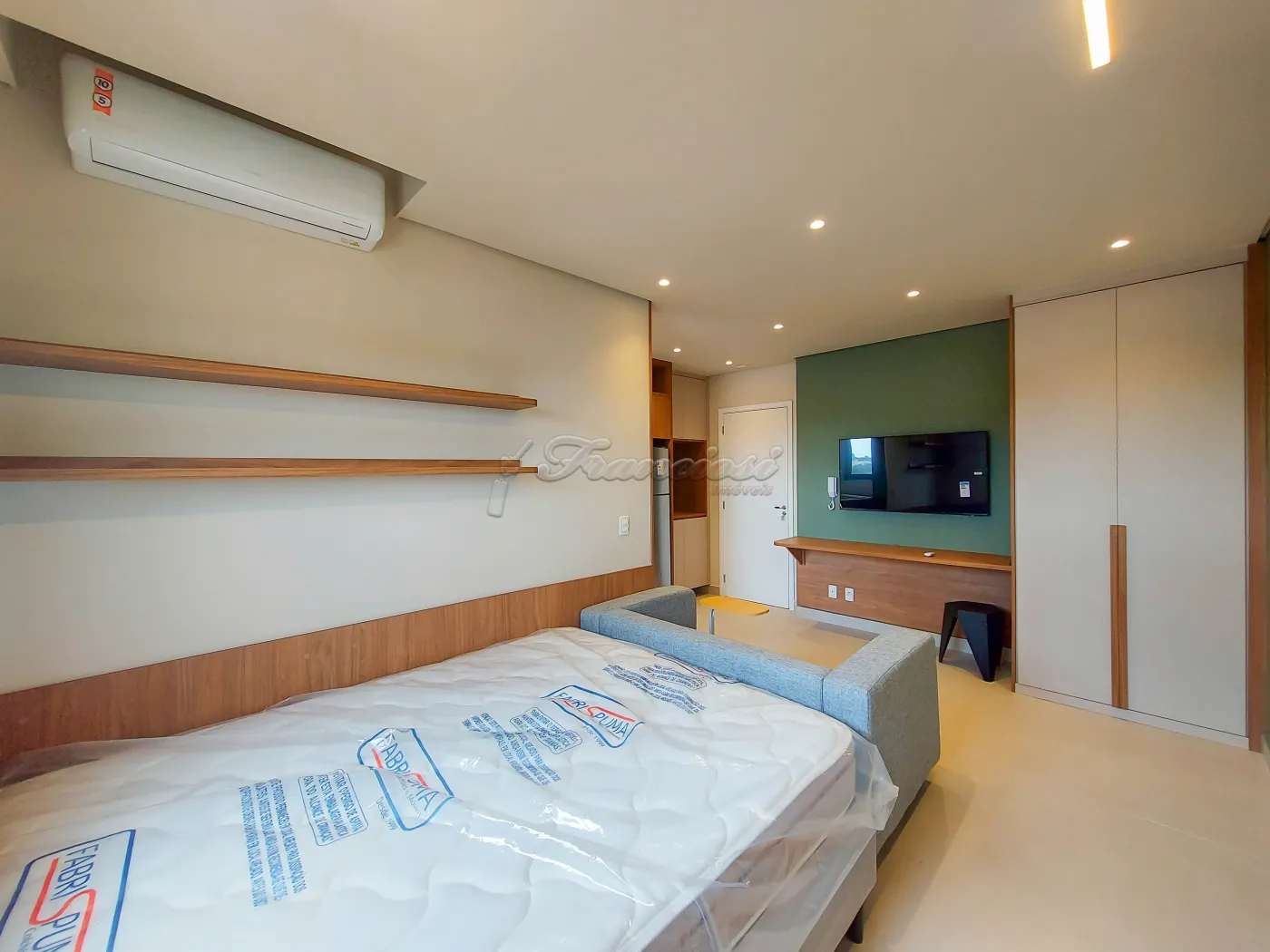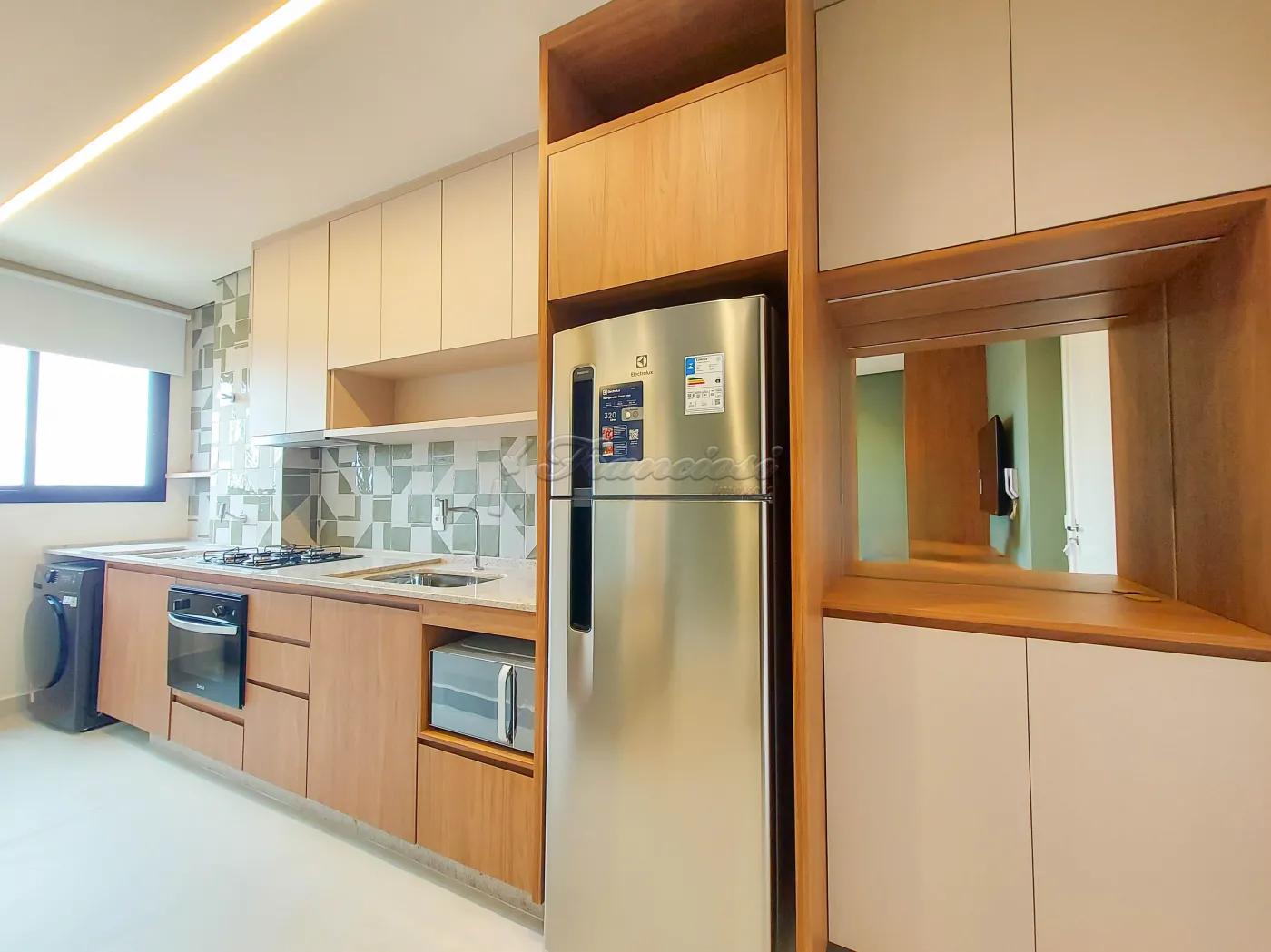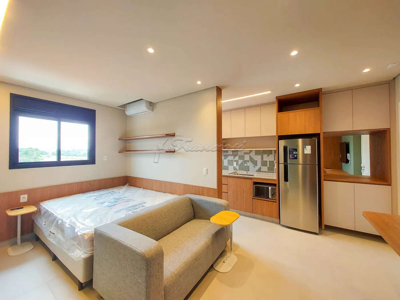 Apartamento com 1 suite com cama de casal e armário planejado, box blindex e gabinete, cozinha mobiliada com cooktop, forno e geladeira, sala com rack de TV e sofá, ar condicionado no quarto, área de serviço com armário planejado e maquina de lavar roupa, e vaga para 1 carro.