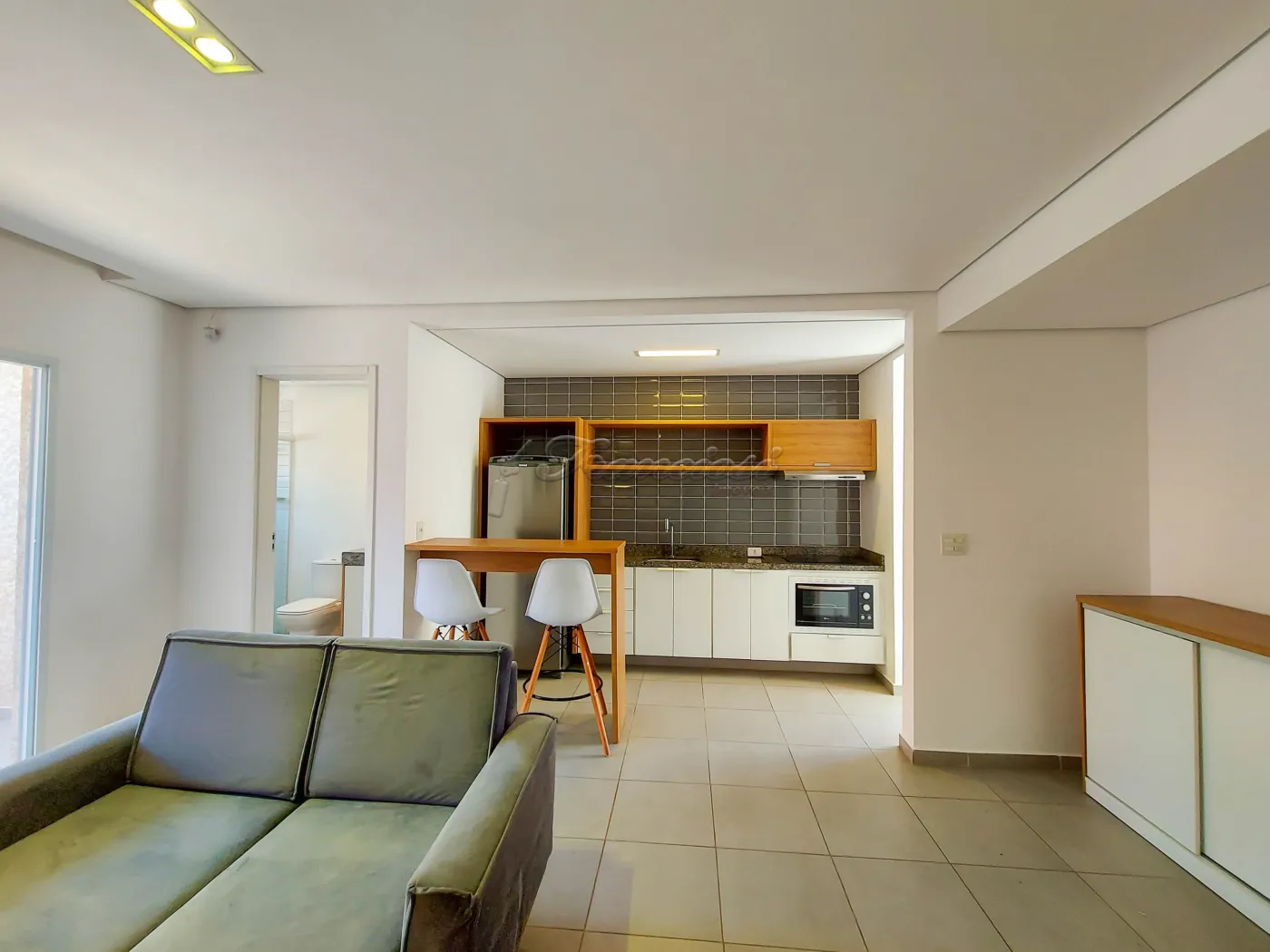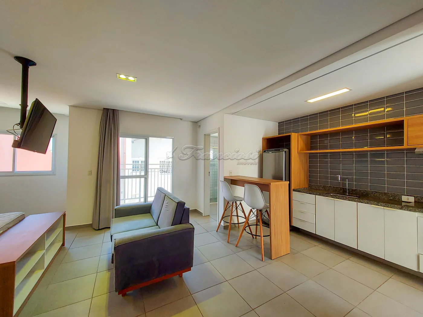 Studio mobiliado com cama de casal, tv, cômoda e armário embutido, sofá e rack, 1 banheiro com box blindex e gabinete, área de serviço, cozinha com armário modulado, fogão cooktop indução, forno, coifa e balcão com 2 banquetas.