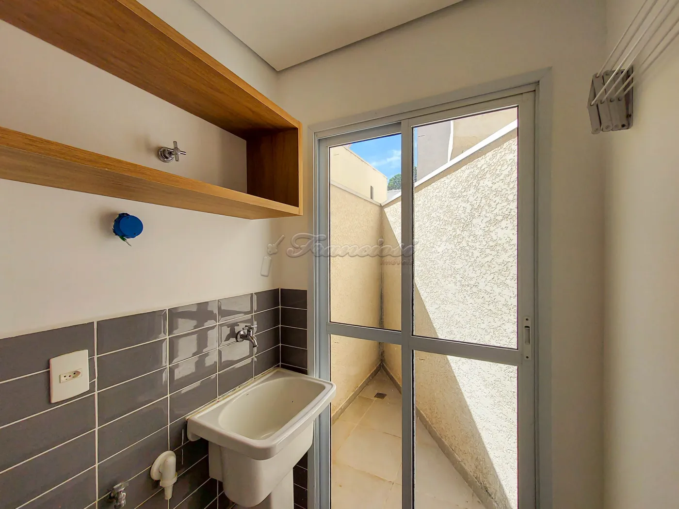 Com varanda e cortina.