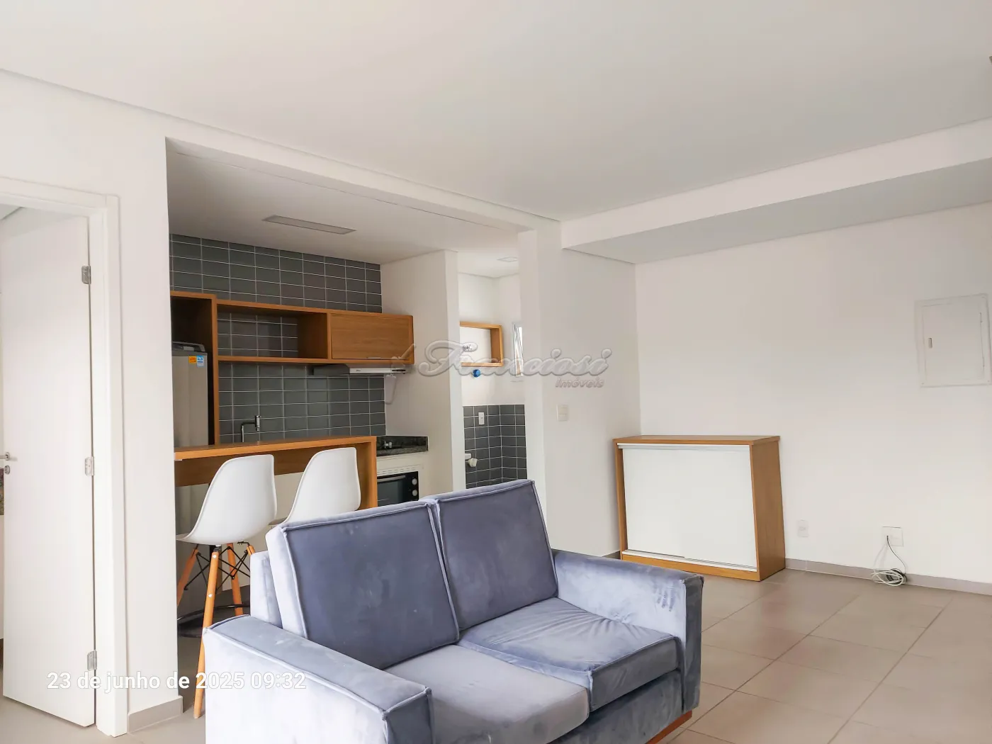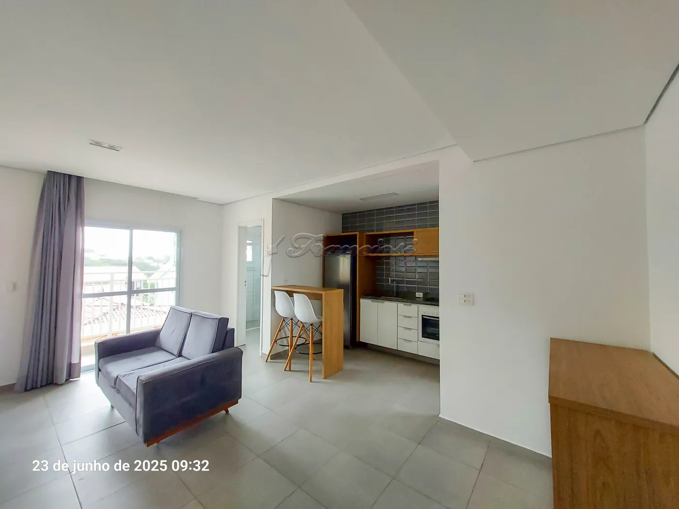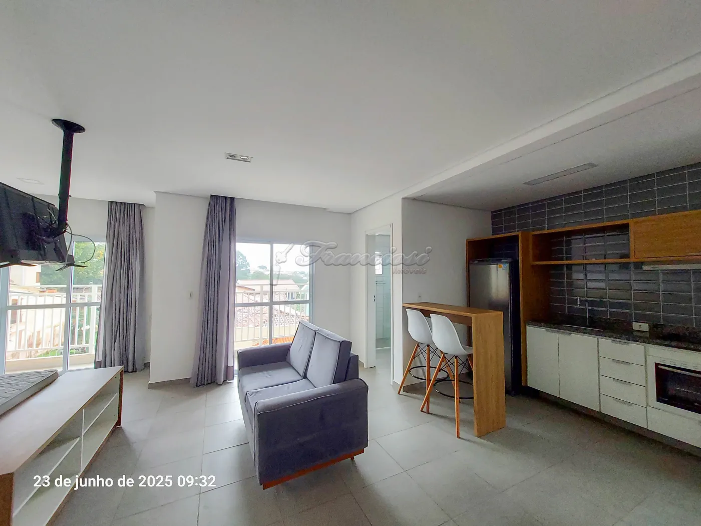 Studio mobiliado com cama de casal, tv, cômoda e armário embutido, sofá e rack, 1 banheiro com box blindex e gabinete, área de serviço, cozinha com armário modulado, fogão cooktop indução, forno, coifa e balcão com 2 banquetas.