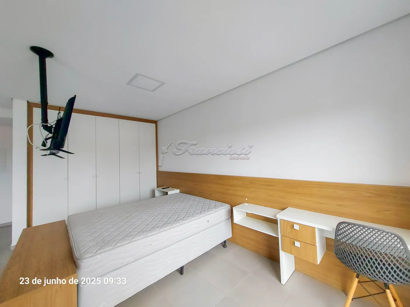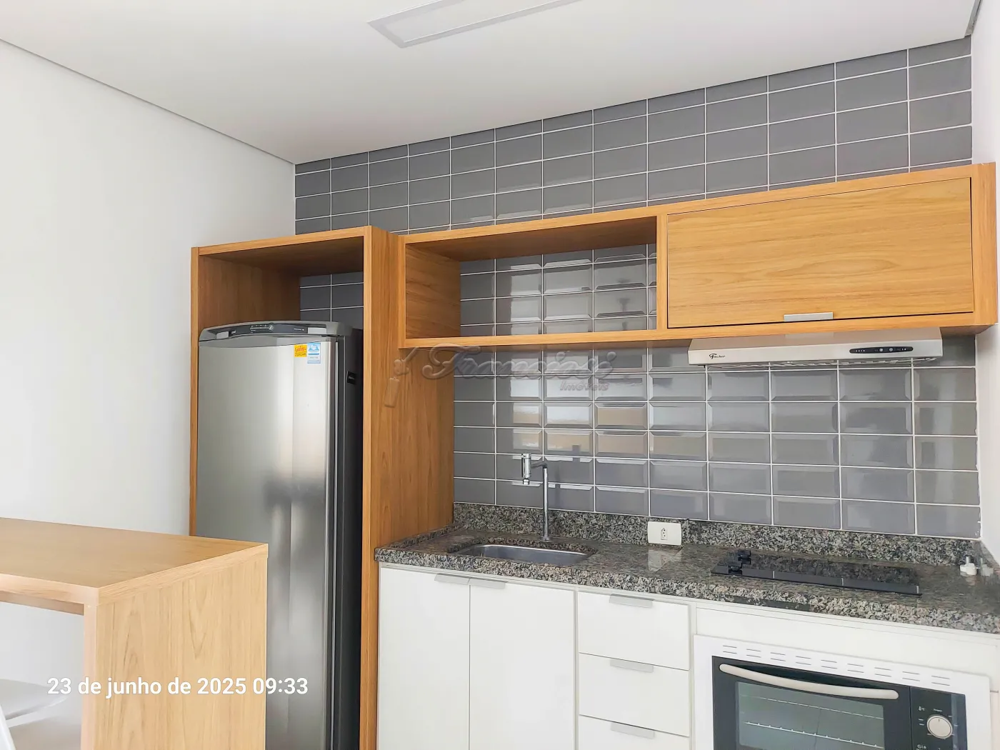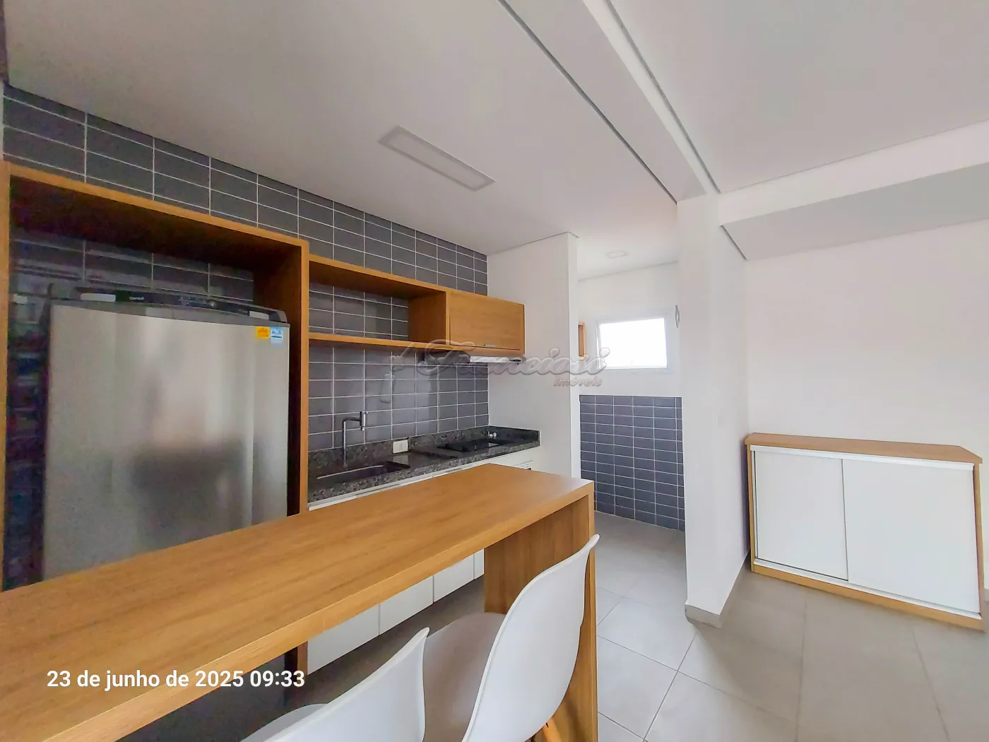 Studio mobiliado com cama de casal, tv, cômoda e armário embutido, sofá e rack, 1 banheiro com box blindex e gabinete, área de serviço, cozinha com armário modulado, fogão cooktop indução, forno, coifa e balcão com 2 banquetas.