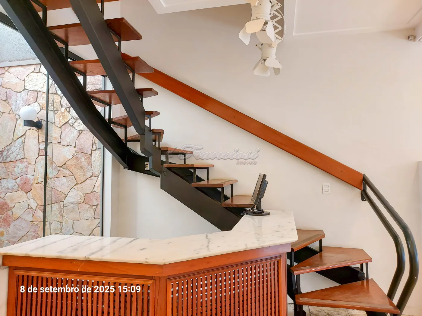 Acabamento: laminado (parte superior), laje, azulejos, gesso com led, pedra mineira polida, ardósia (parte externa), escada de madeira.