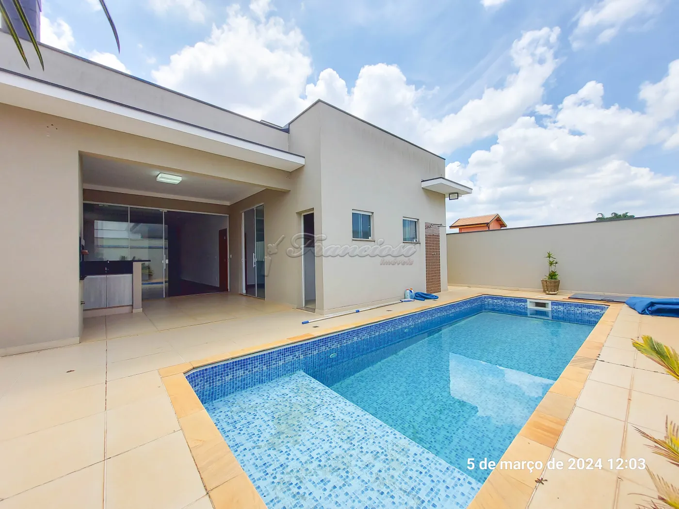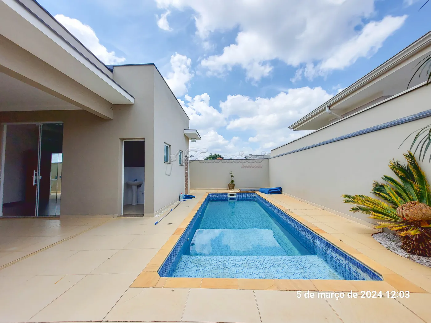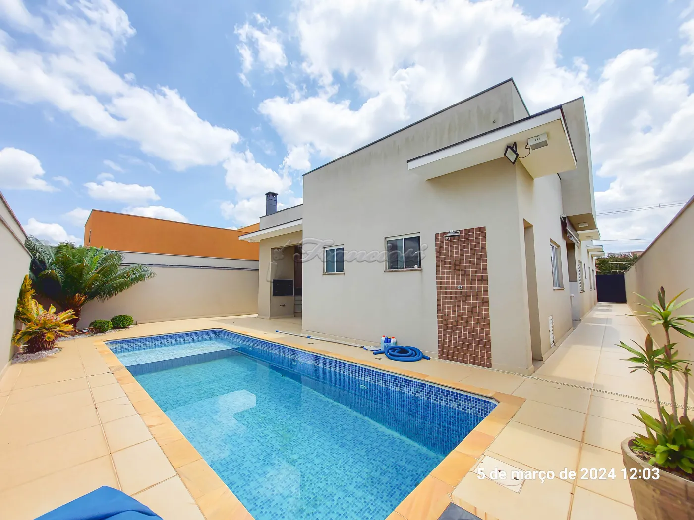 Casa em condomínio com 3 suítes, sala 2 ambientes, cozinha, 1 lavabo, escritório, lavanderia coberta, área gourmet com churrasqueira e armário, 1 banheiro externo, piscina e garagem coberta para 2 carros.