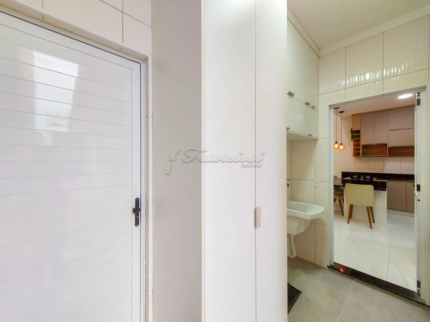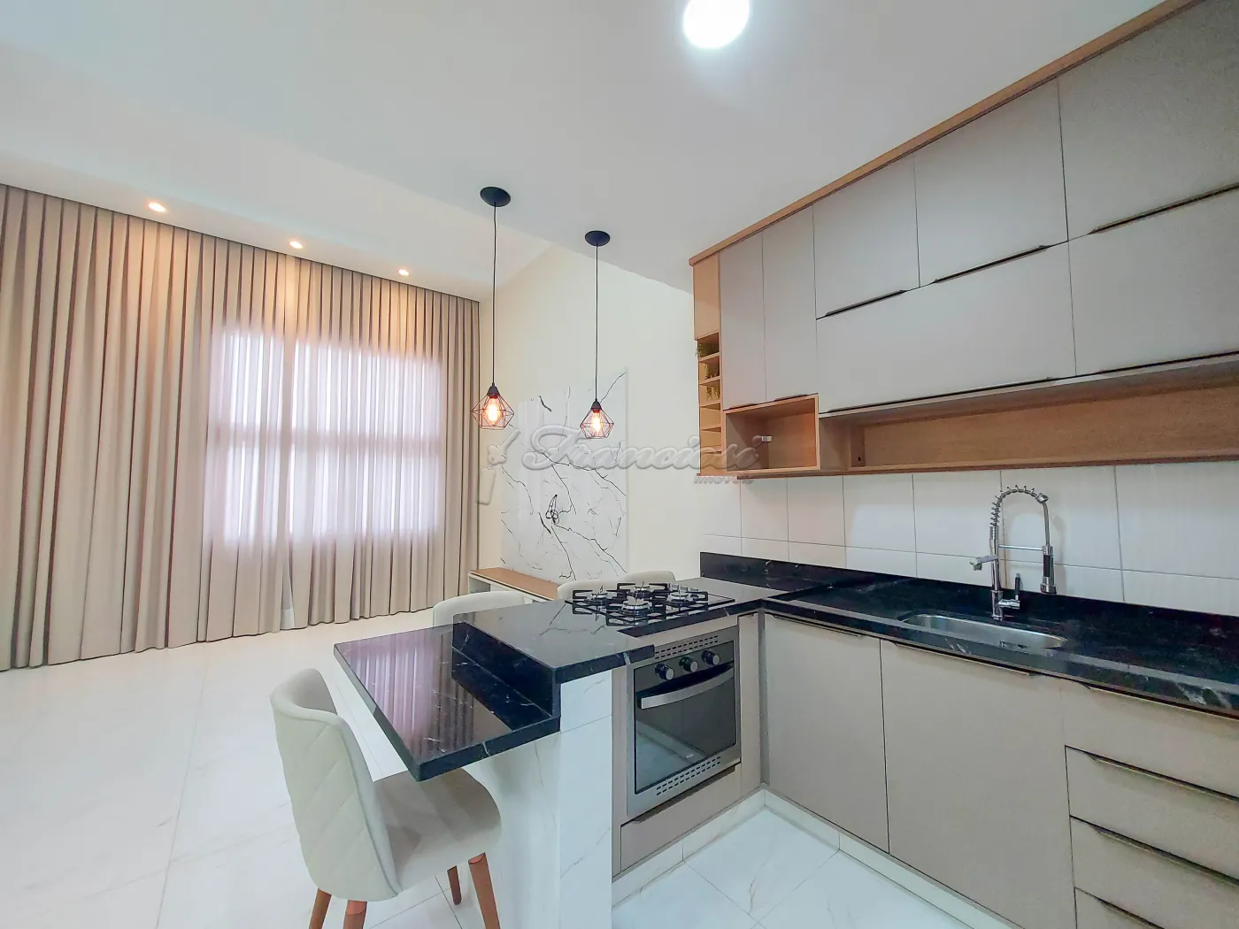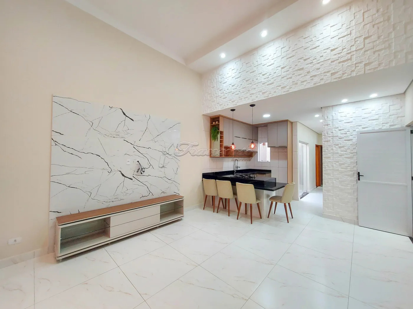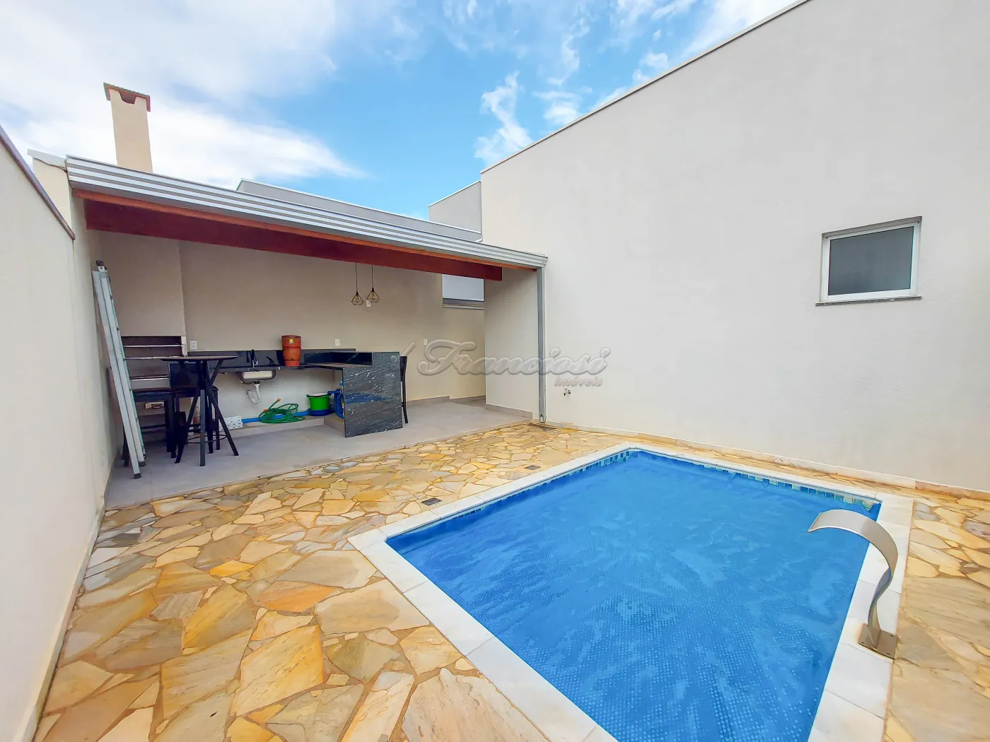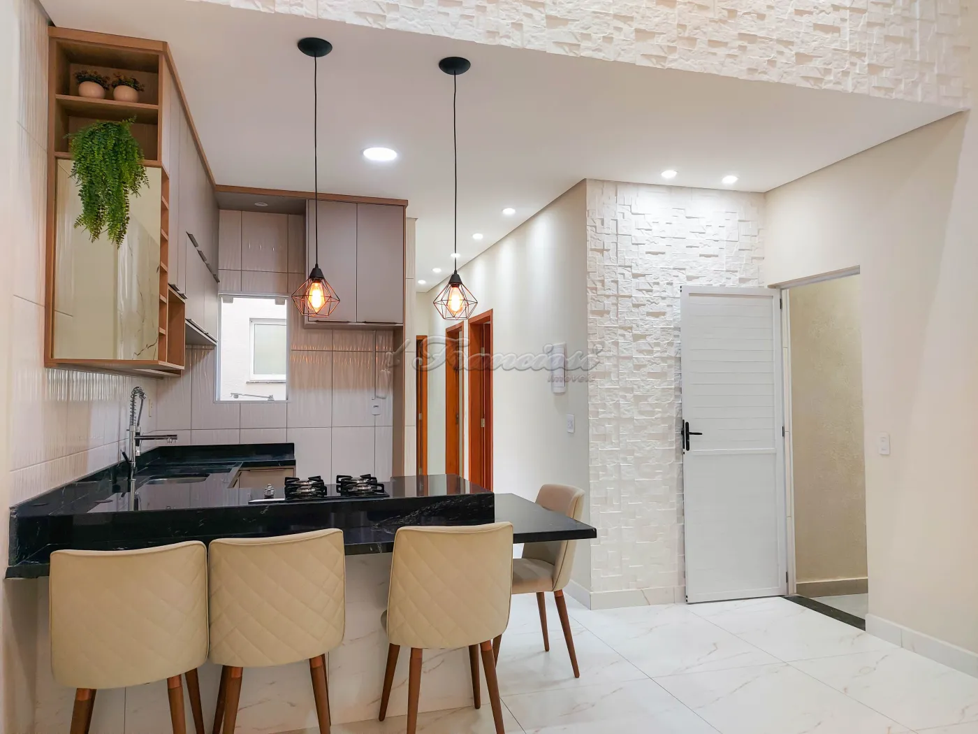 Casa em condomínio com 3 dormitórios sendo 1 suíte com closet e box blindex, sala de estar com hack, cozinha com balcão, 4 cadeiras, armários planejados e cooktop, área de luz, 1 banheiro social com box blindex, lavanderia com armários planejados, quintal, piscina, área de lazer com churrasqueira, bistrô com banquetas e garagem para 1 carro.