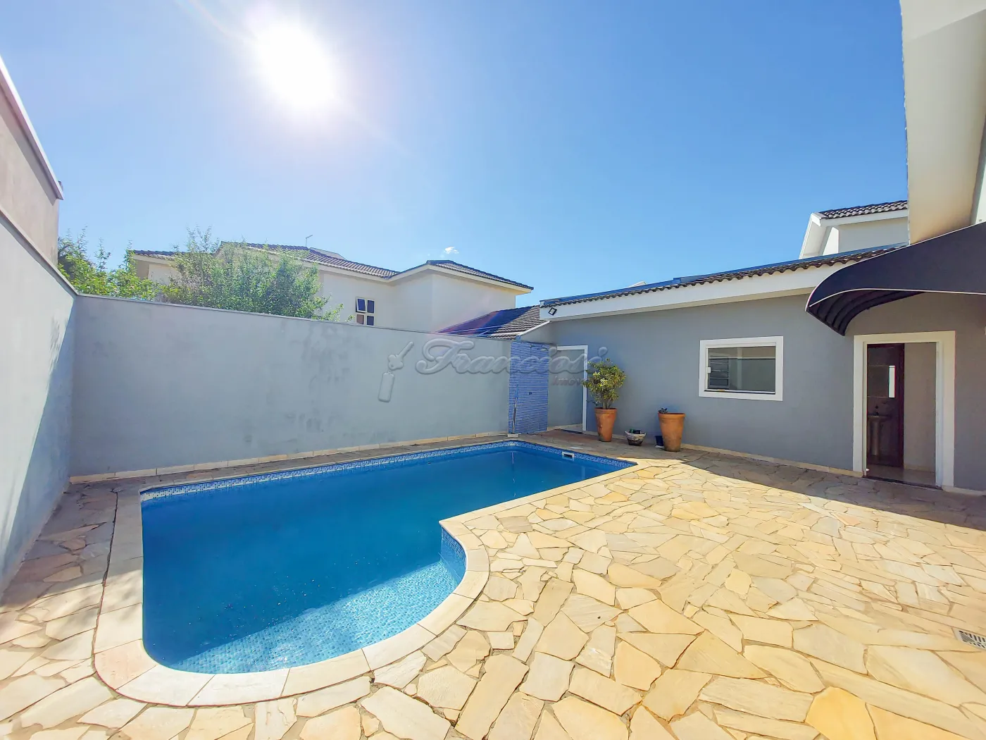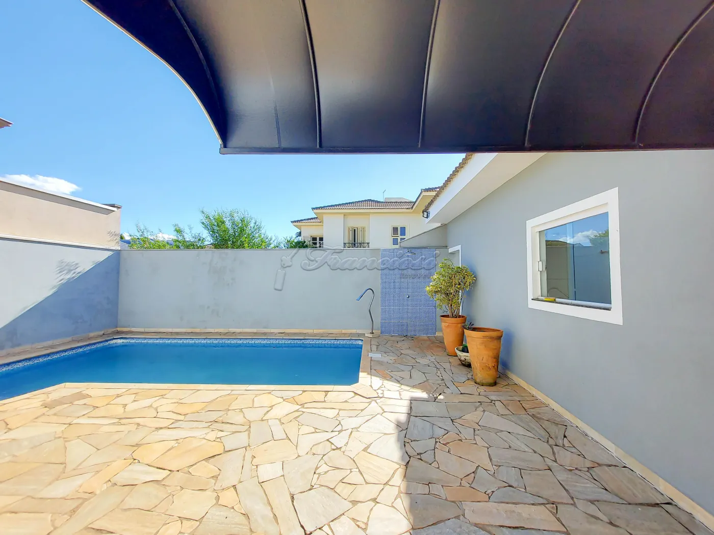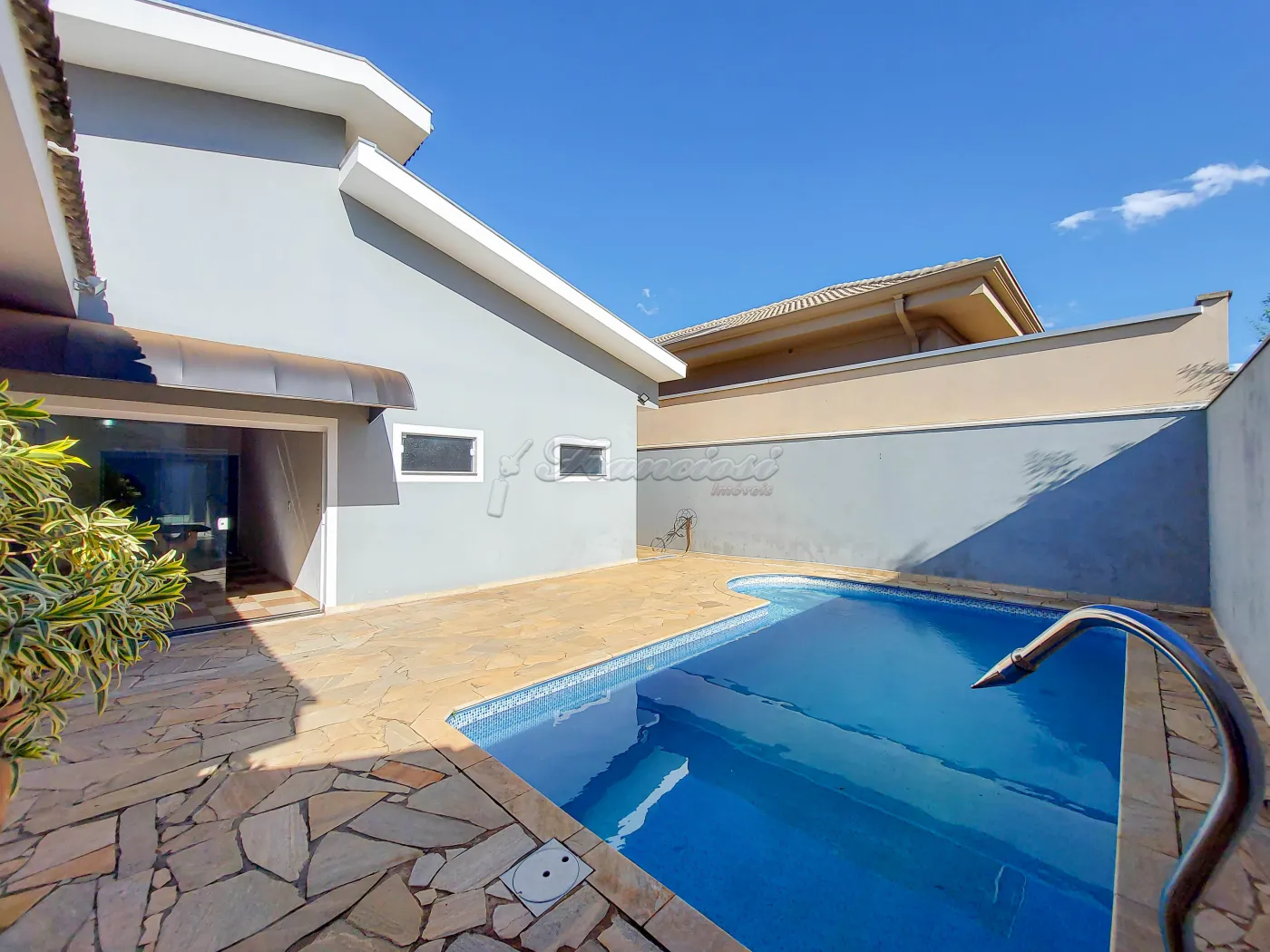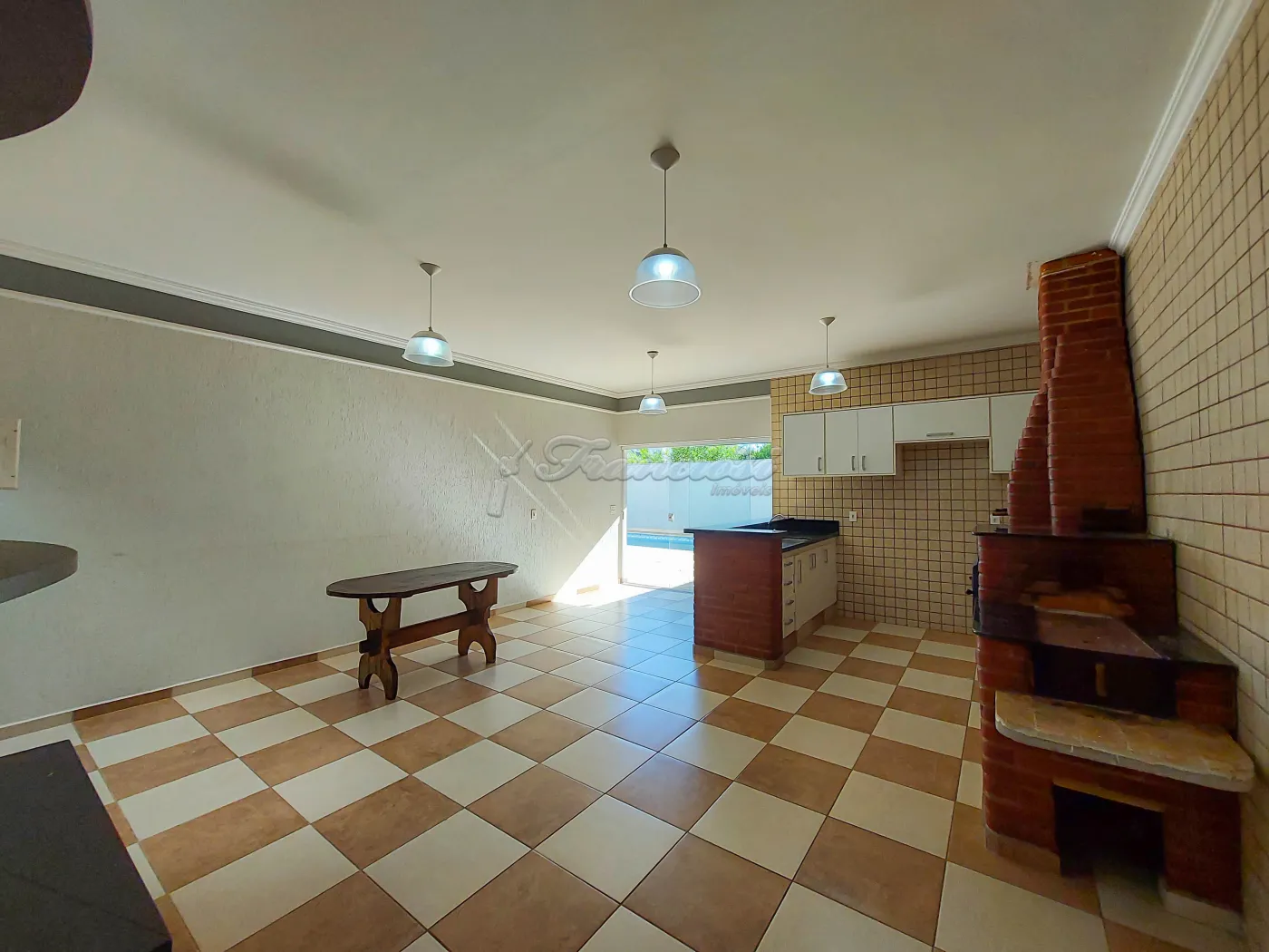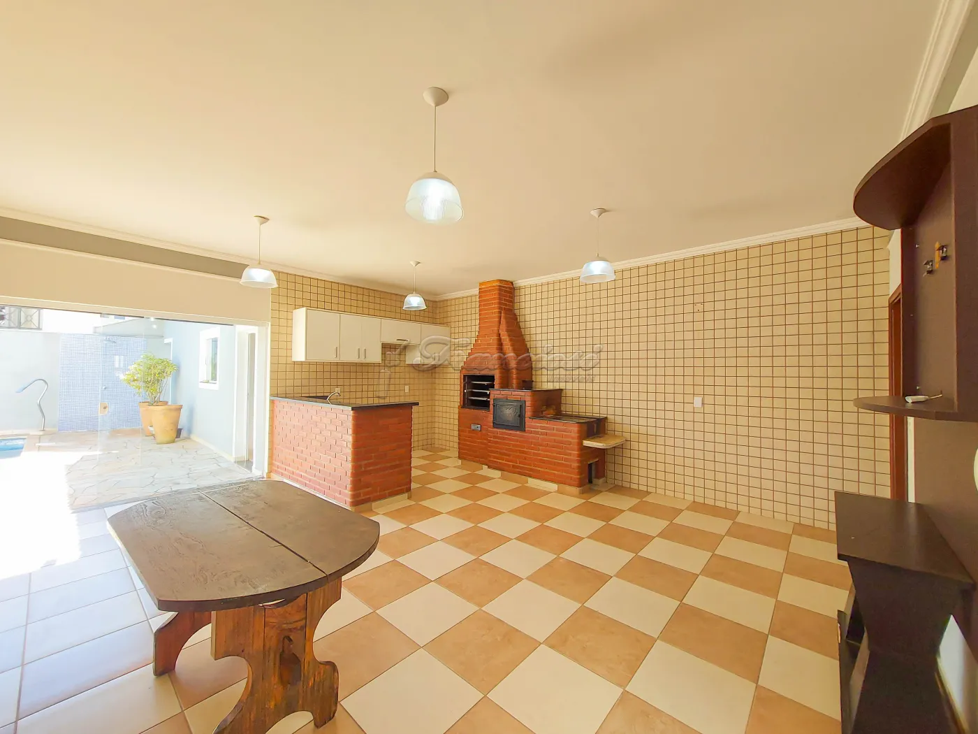 Casa em condomínio com 3 dormitórios sendo 2 suítes com box blindex, closet com guarda roupa, sala 2 ambientes com lareira, área de luz, 1 lavabo, cozinha com armário modulado, quintal, piscina grande, garagem coberta para 2 carros.