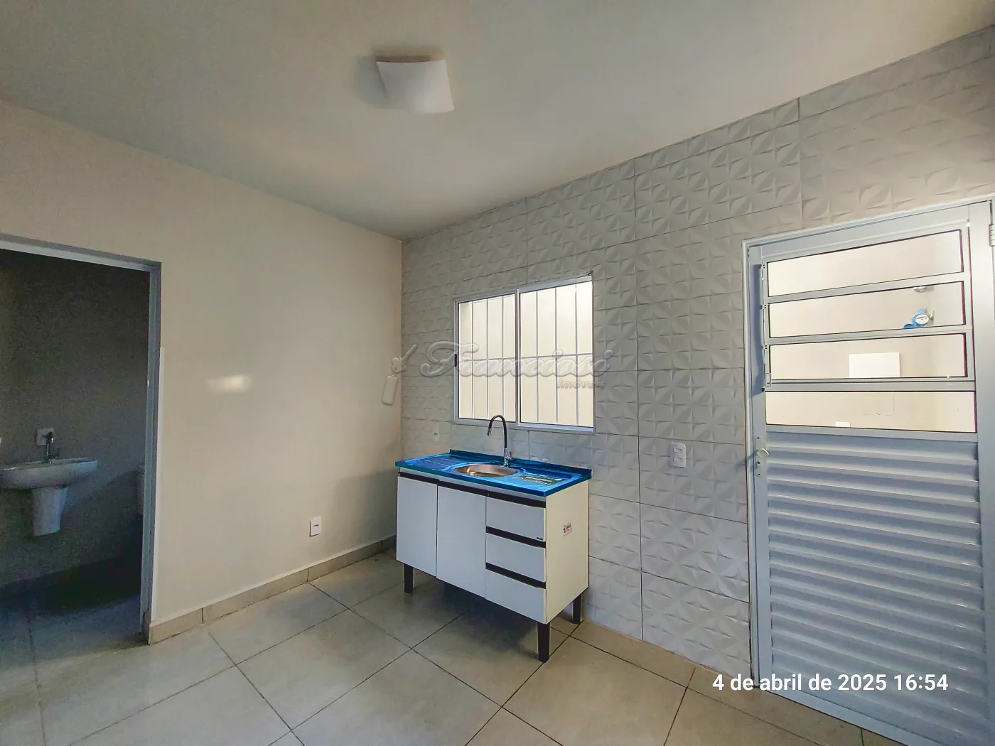 Kitnet com 1 dormitório, sala e cozinha integrada, 1 banheiro social, quintal pequeno e área de serviço.