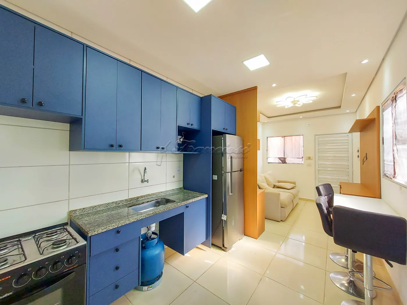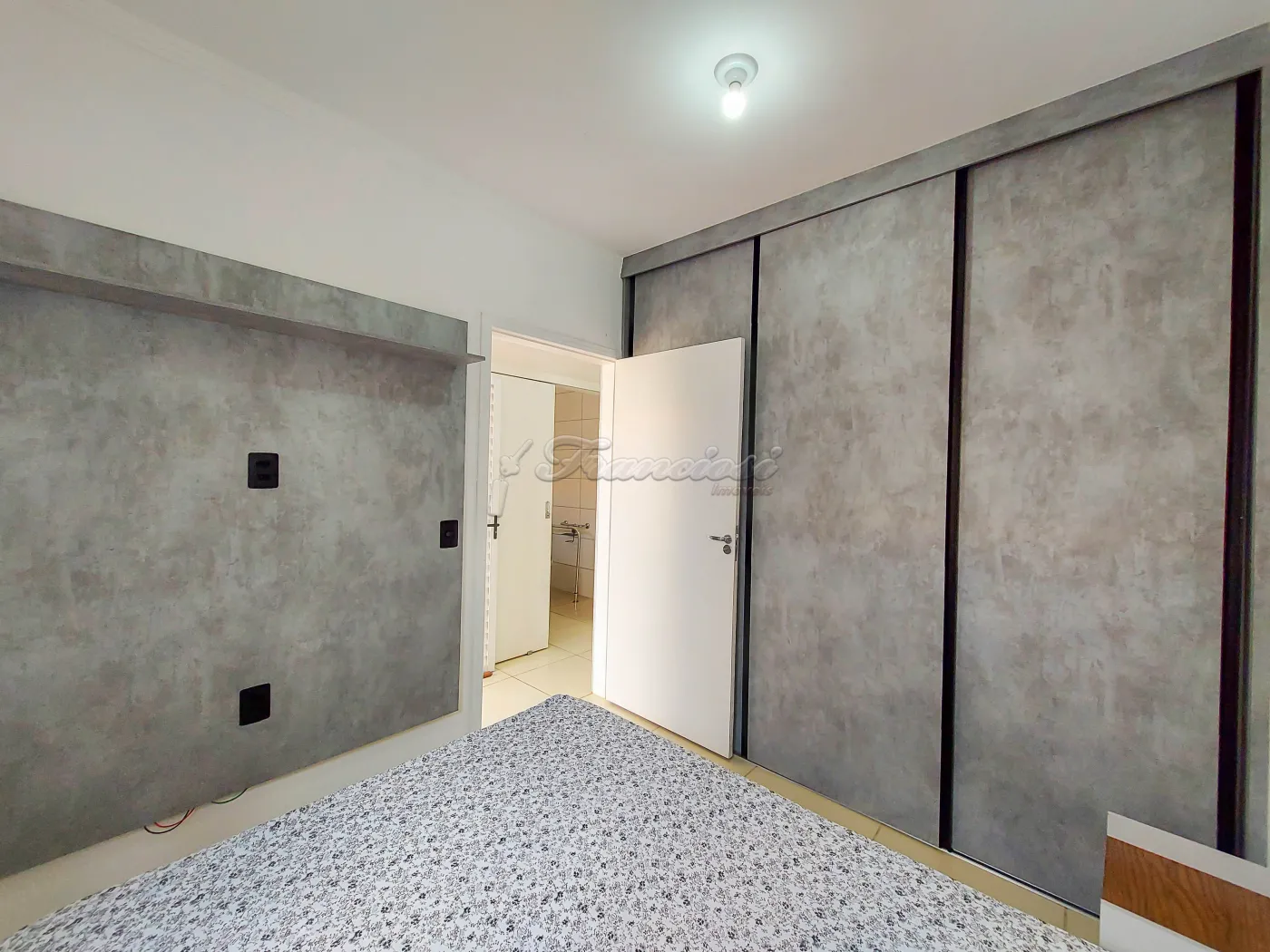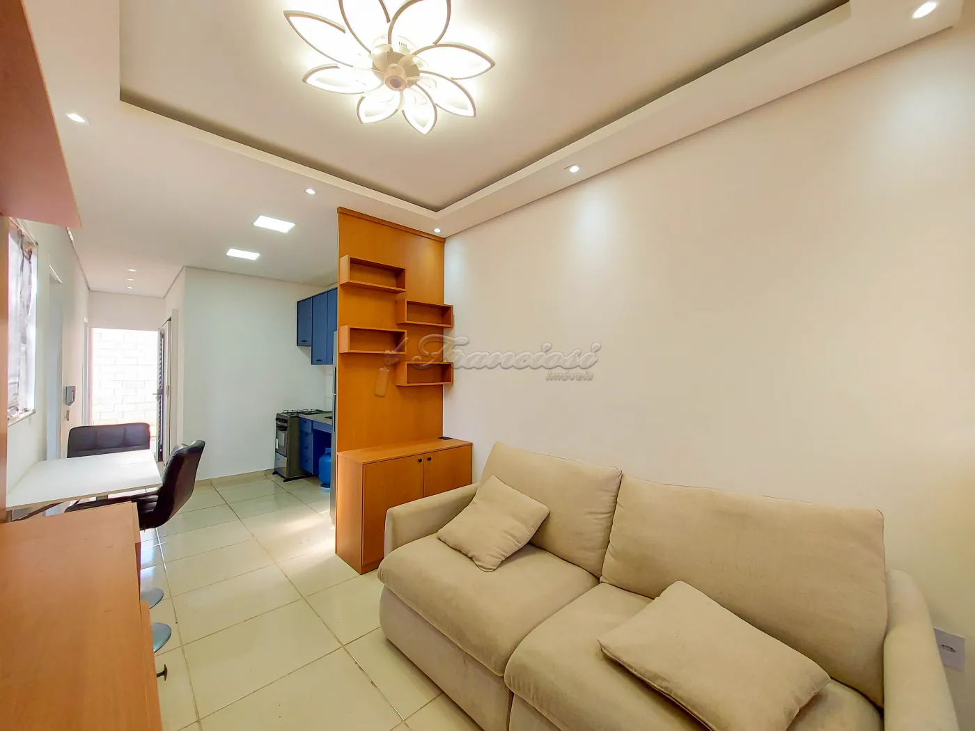 Mobiliado com cama, sofá, geladeira e fogão. Com painel de TV na sala, armários planejados na cozinha e nos dormitórios.