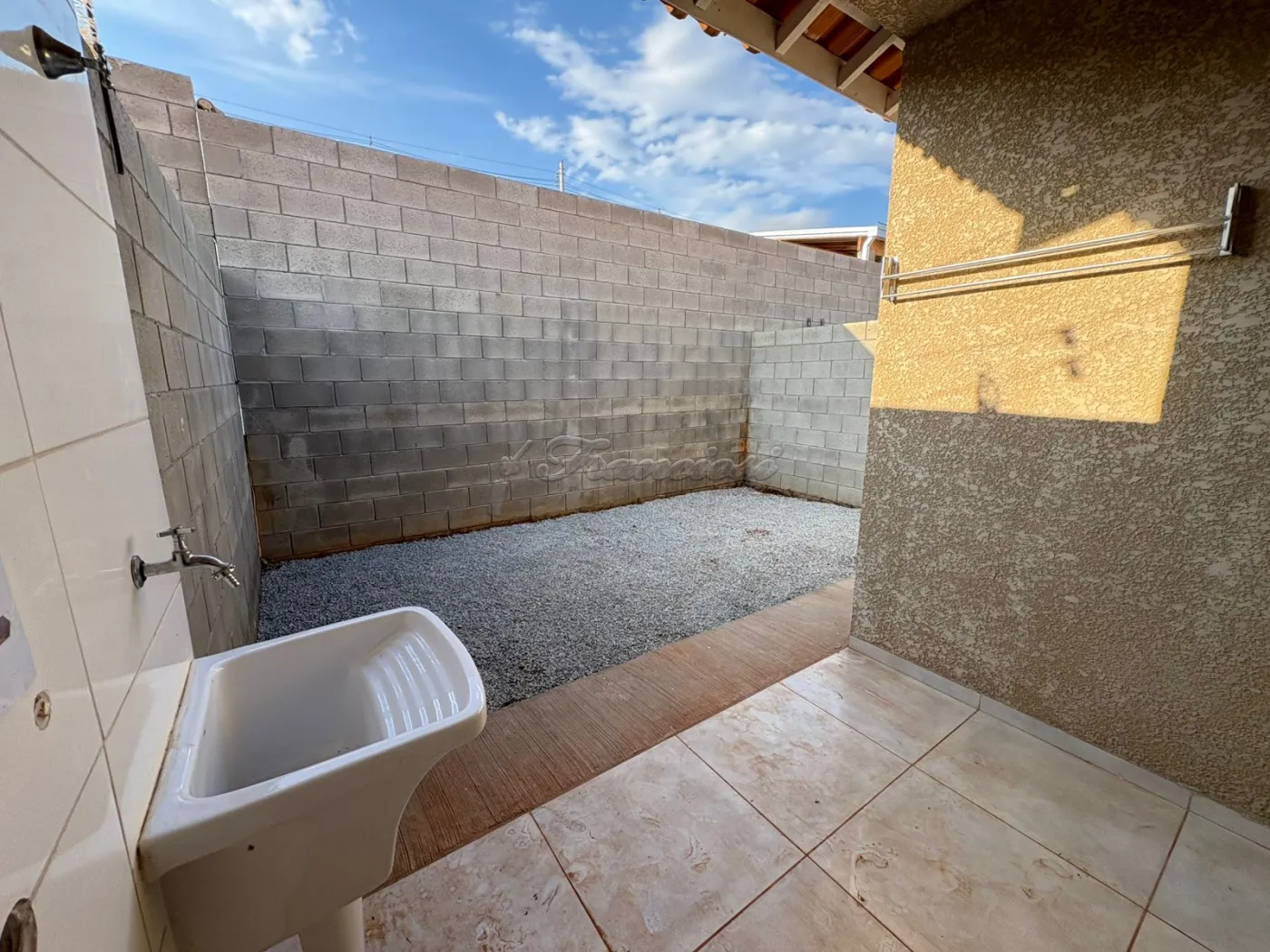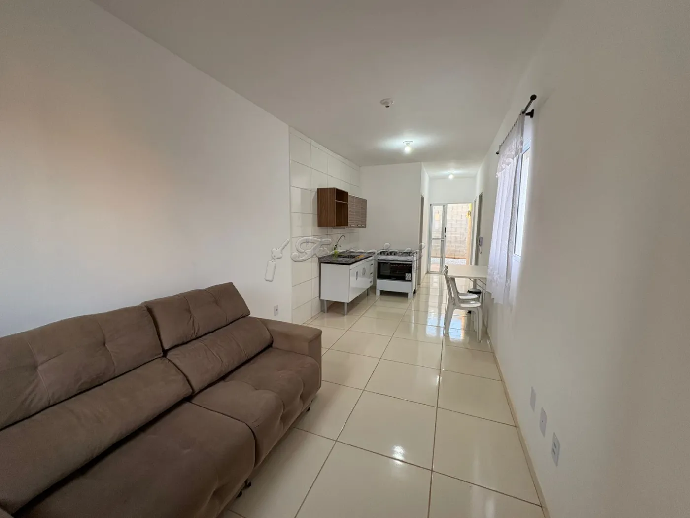 Casa em condomínio com 2 dormitórios, sala e cozinha conjugada, 1 banheiro social, área de serviço coberta, quintal com grama e entrada para 1 carro.