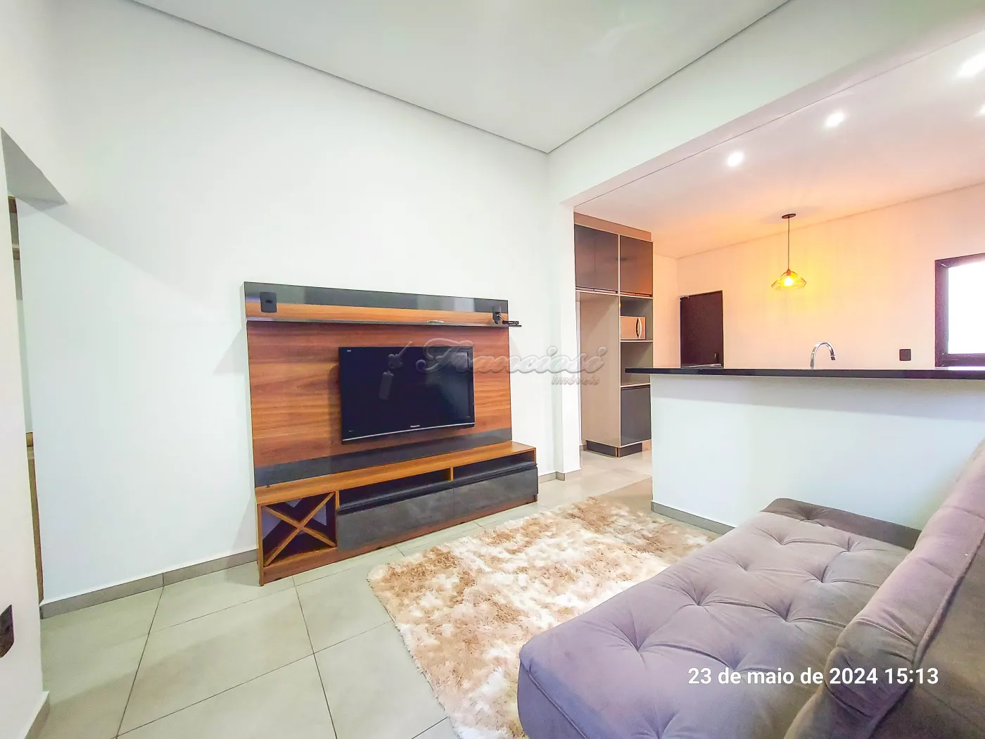 Mobiliada com cama (faz massagem), guarda roupa, chuveiro, mesa, fogão, geladeira, microondas, sofá e televisão.