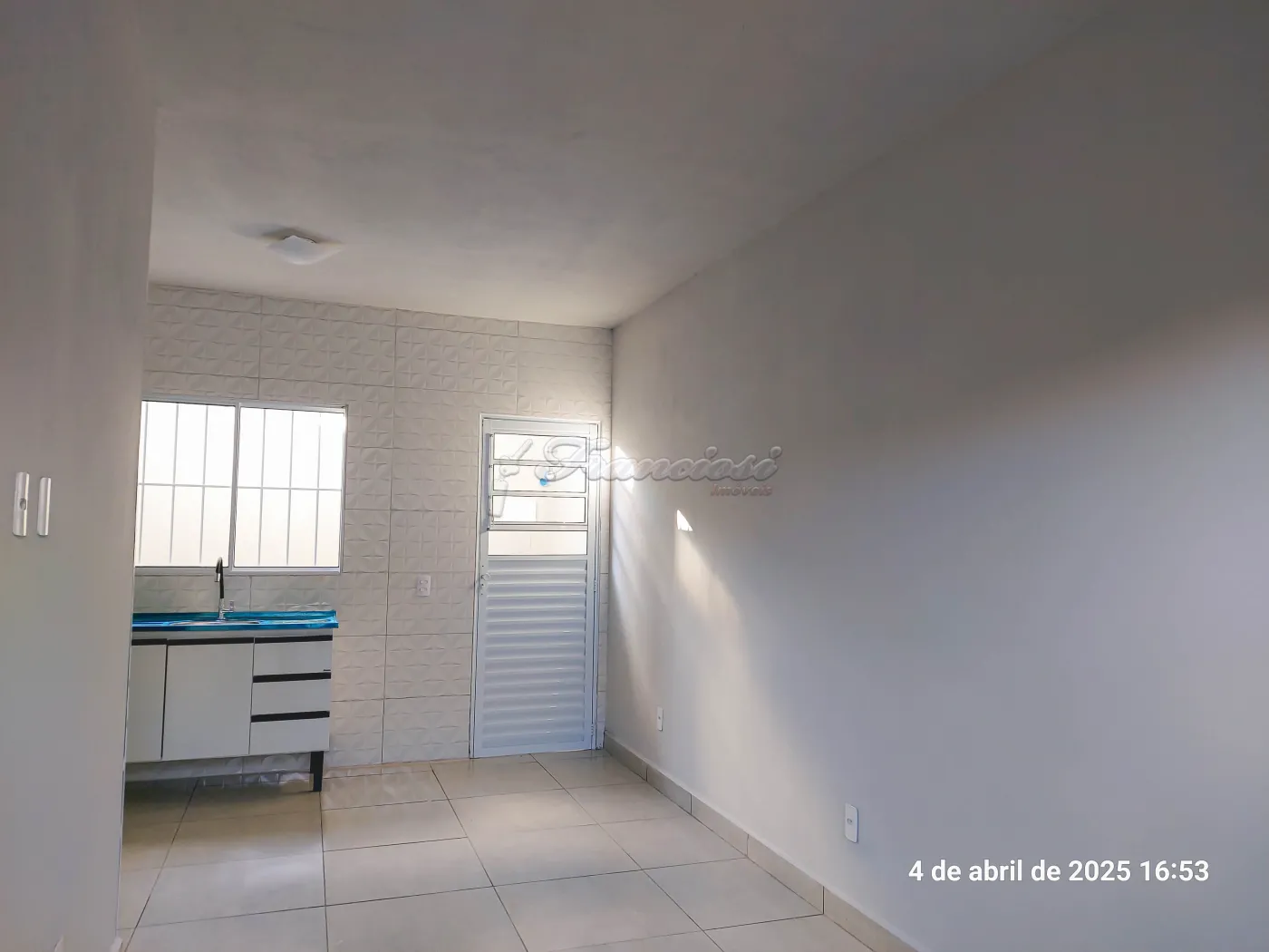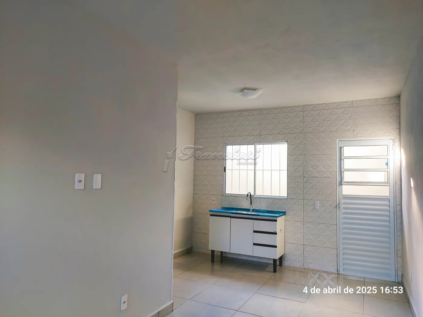 Kitnet com 1 dormitório, sala e cozinha integrada, 1 banheiro social, quintal pequeno e área de serviço.