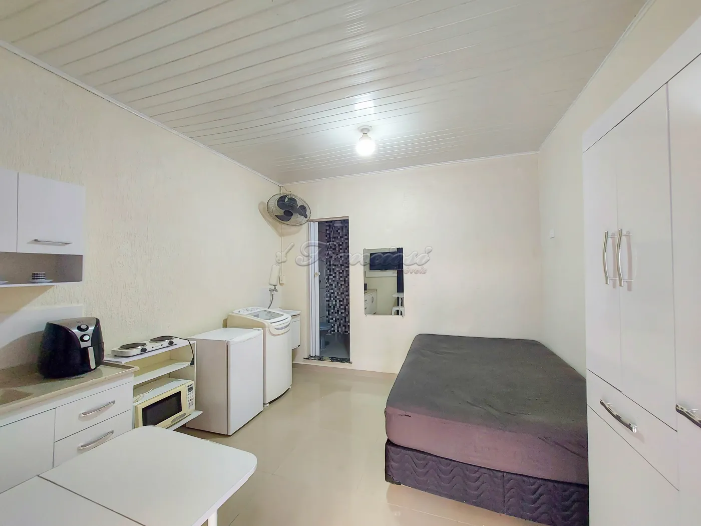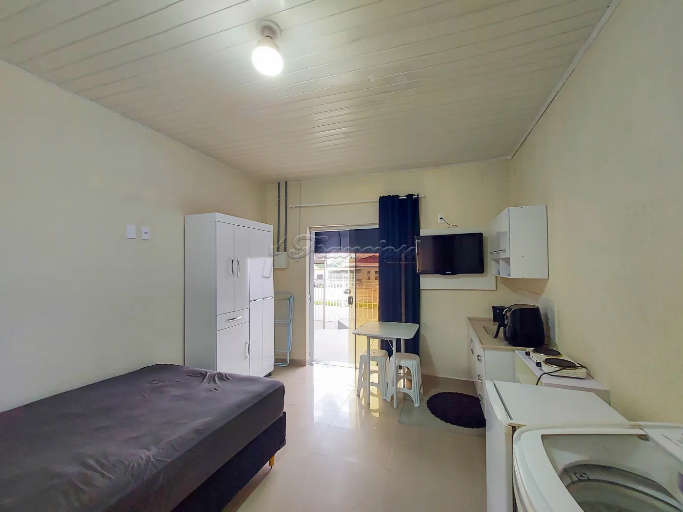 Kitnet mobiliada com cama, guarda roupa, TV, mesa com 2 banquetas, fogão elétrico 2 bocas, microondas, frigobar, máquina de lavar roupa, ventilador de parede, 1 banheiro, área de serviço e vaga para 1 carro.