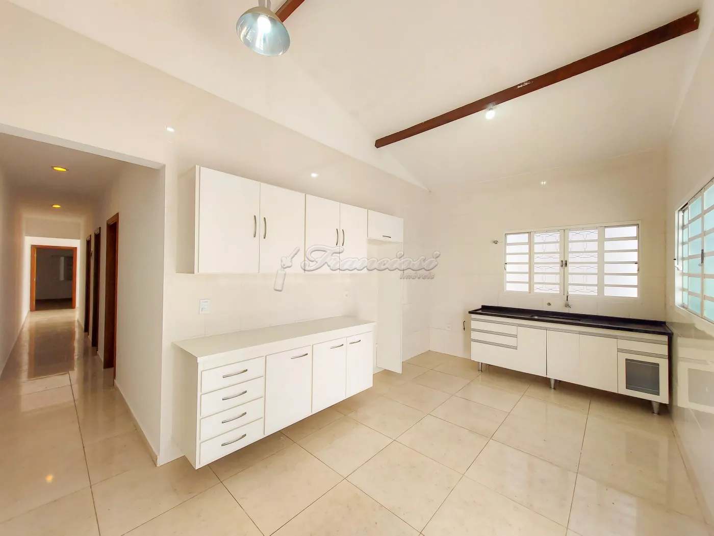Casa com 3 dormitórios sendo 1 suíte com armário, sala de estar, 1 banheiro social com box blindex, cozinha com armário modulado, quintal com piso, lavanderia fechada com 1 banheiro e garagem coberta para 1 carro.