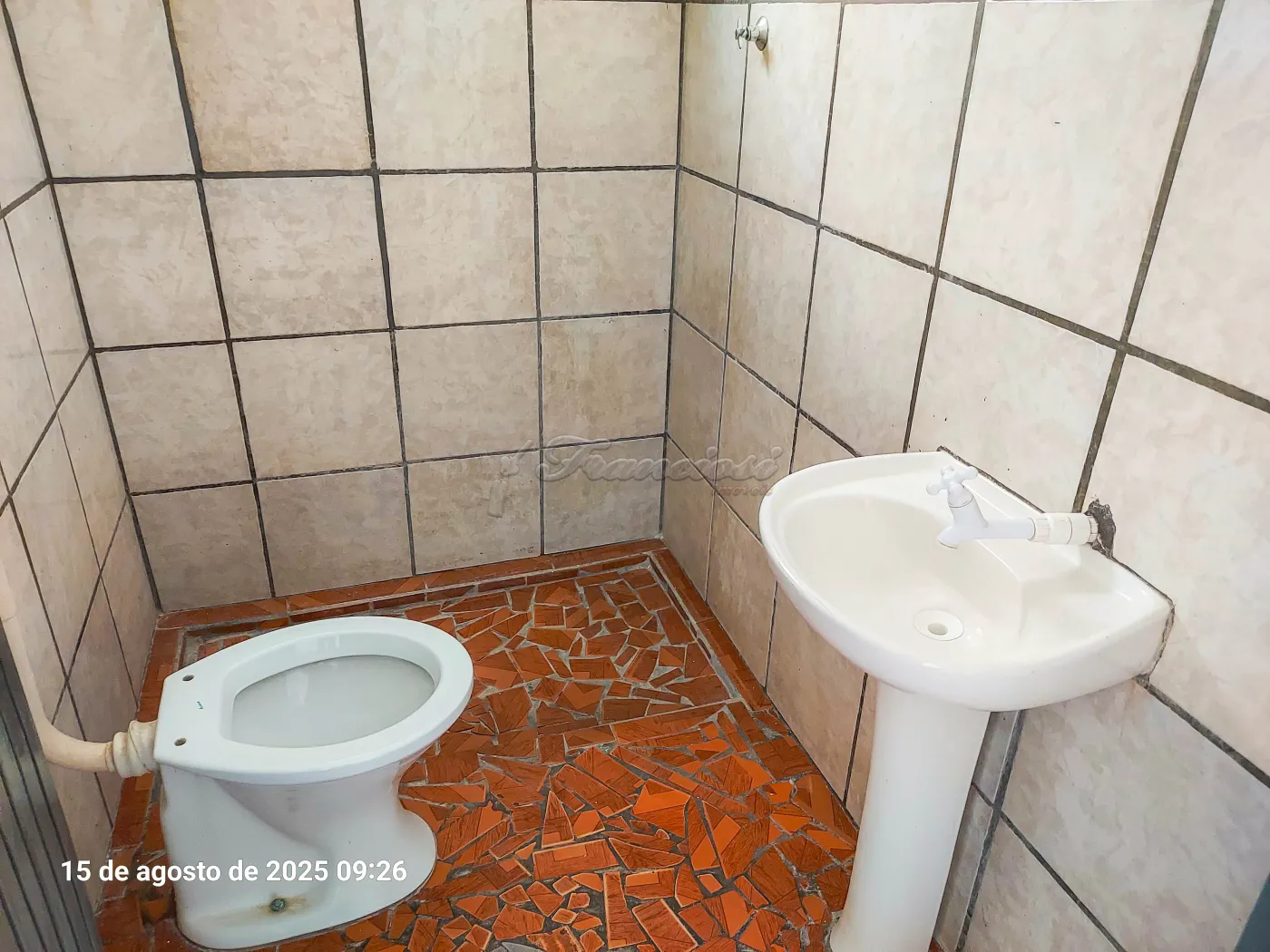 Acabamento: piso frio e azulejo do banheiro pela metade.