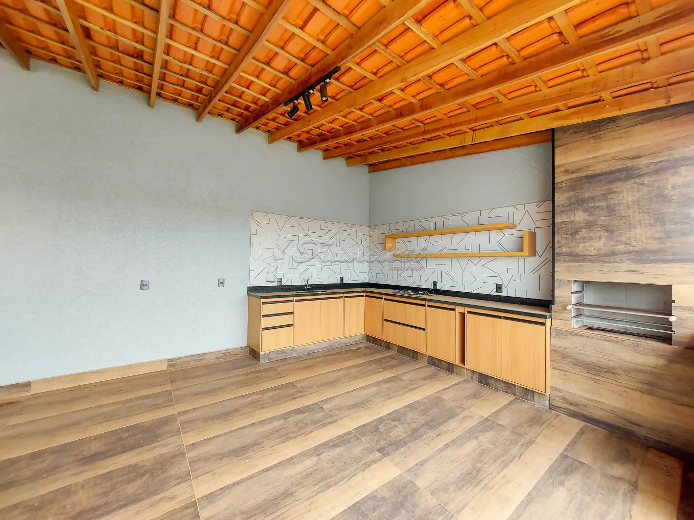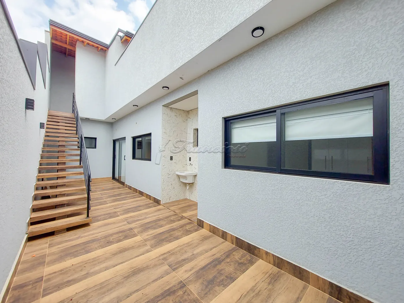 Casa com 3 dormitórios sendo 1 suíte com box acrílico, 1 banheiro social com box acrílico, sala de estar ampla, cozinha, lavabo, área de serviço, quintal grande cimentado, churrasqueira, 1 banheiro externo e garagem coberta para 2 carros. Acabamento: laje, piso frio, cozinha e banheiro com azulejo pela metade.