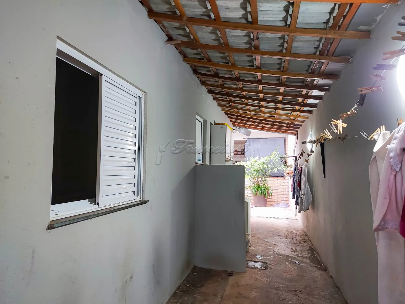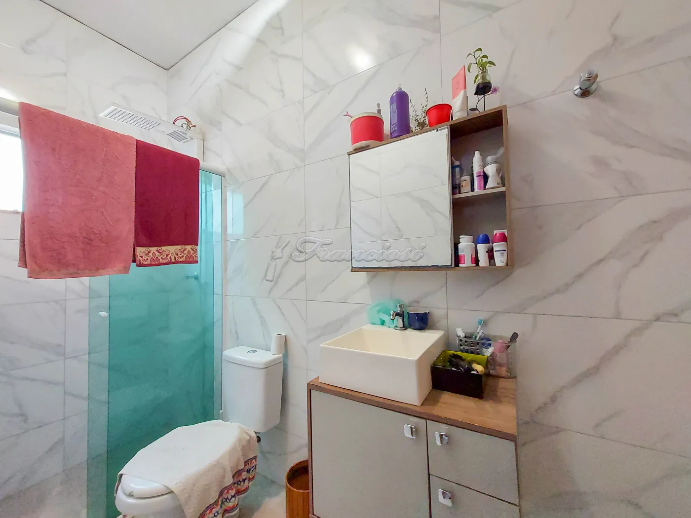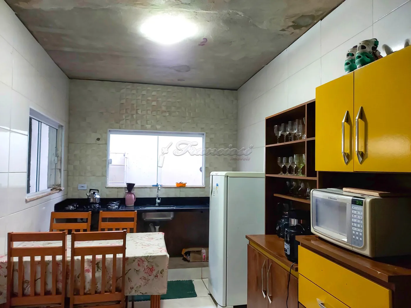 Casa com 3 dormitórios sendo 1 suíte, sala, cozinha, 1 banheiro social com box acrílico, área de serviço coberta, 1 banheiro externo e garagem coberta para 2 carros. Acabamento: laje, piso frio, cozinha e banheiro azulejados até o teto.