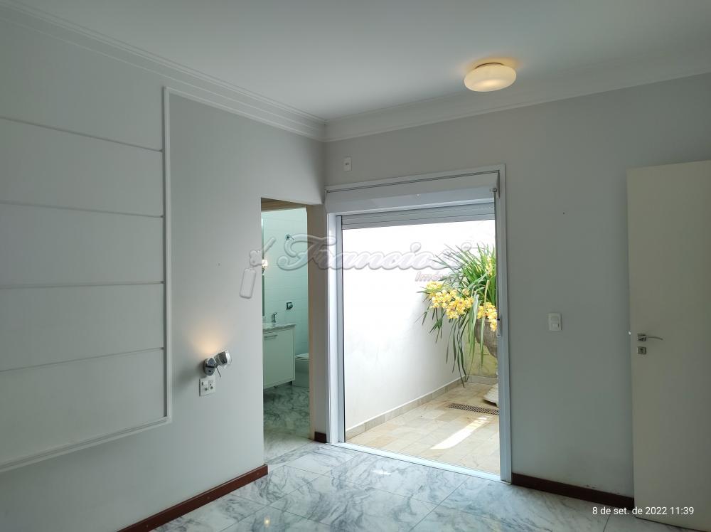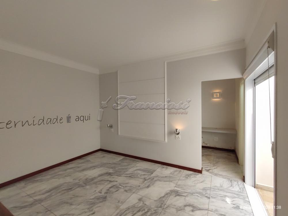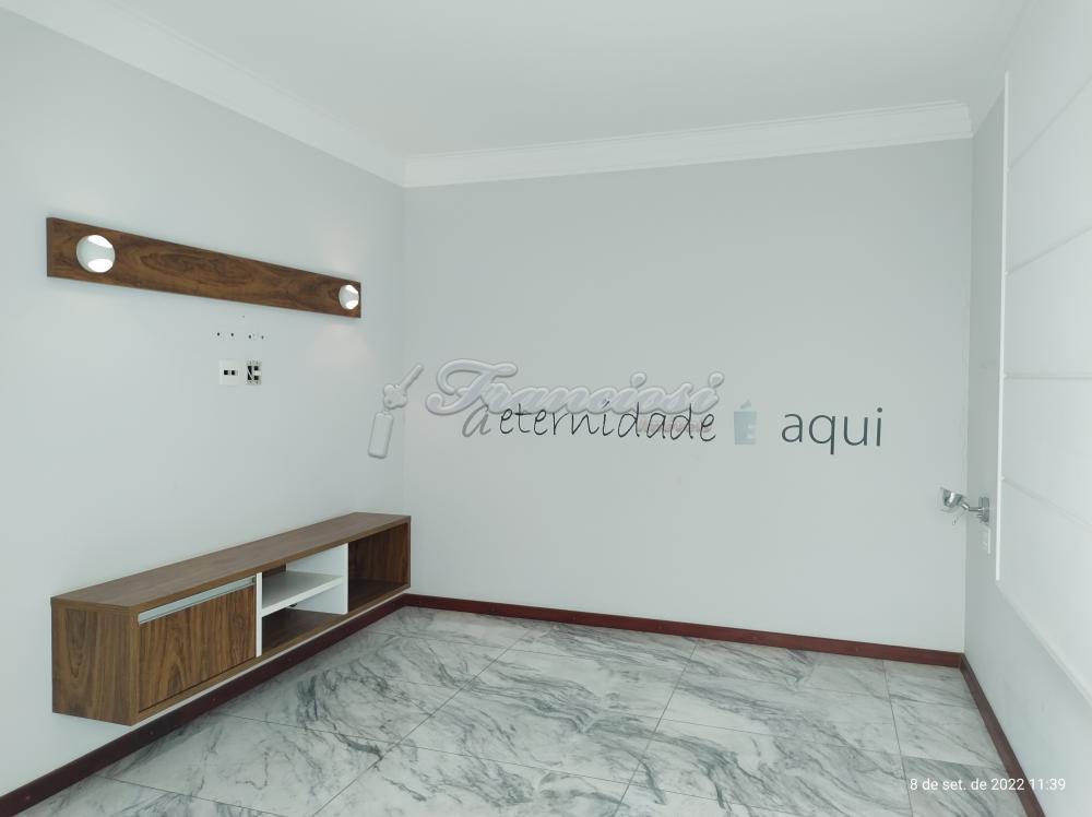 1 Dormitório com acabamento em gesso de cabeceira de cama, chão de mármore, rodapé em madeira, porta basculante em alumínio com pintura branca, luminárias de cabeceira, rack planejado com luminárias.