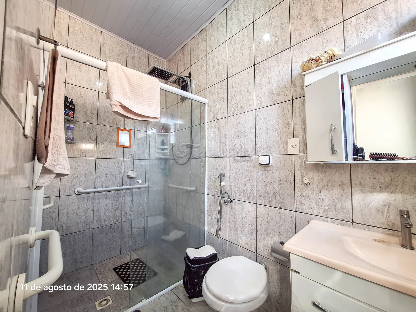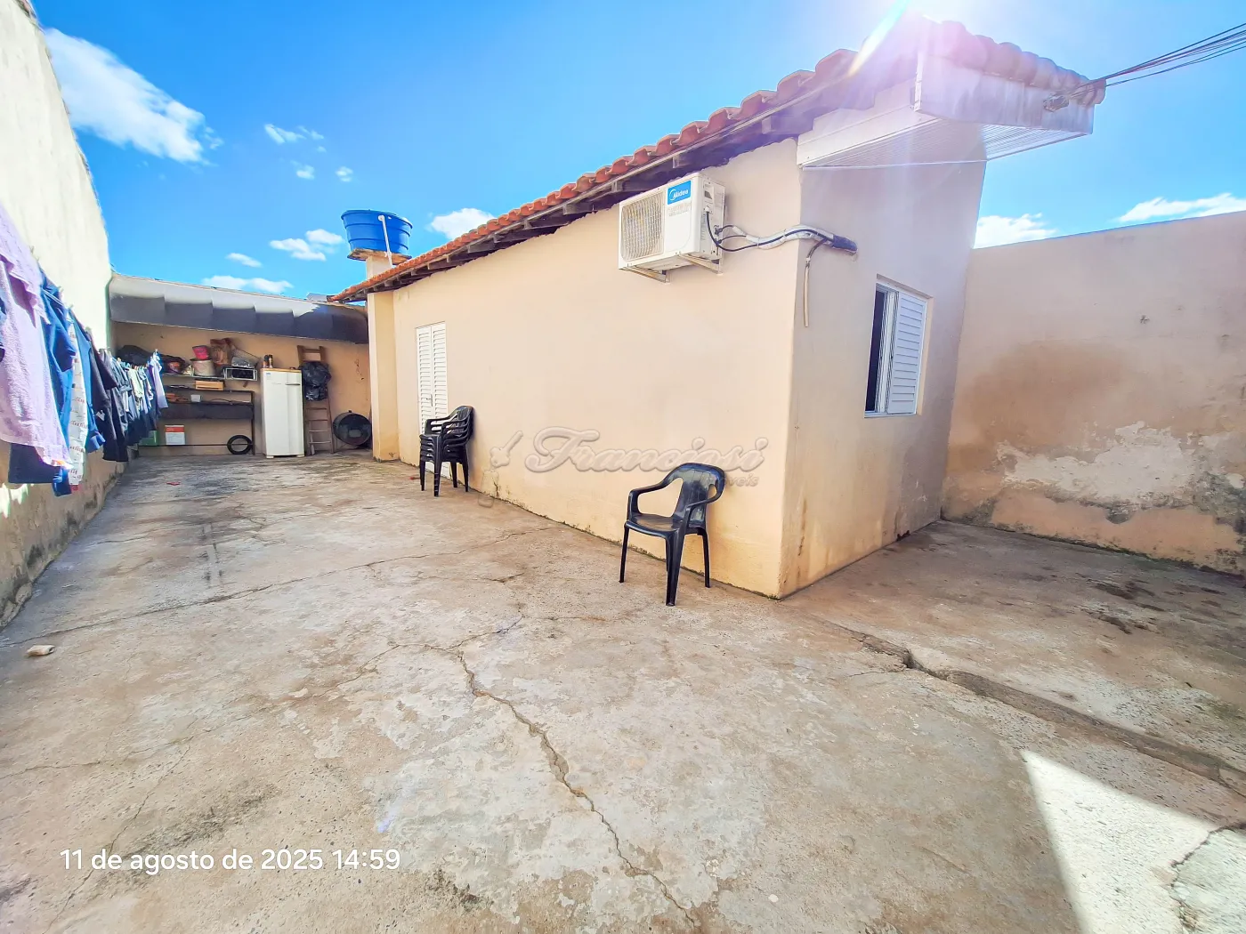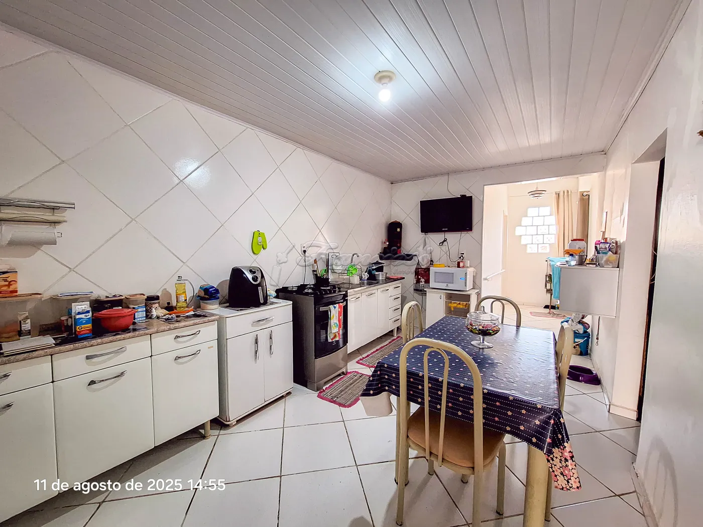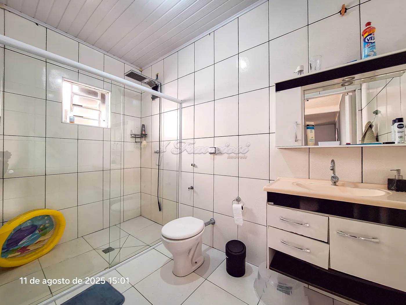 Casa com 3 dormitórios sendo 1 suíte com box blindex, sala de estar, cozinha, 1 banheiro social com box blindex, área de serviço coberta, quintal grande com piso, churrasqueira e garagem coberta para 2 carros e entrada para mais. Acabamento: laje, piso frio, cozinha e banheiro com azulejo até o teto.