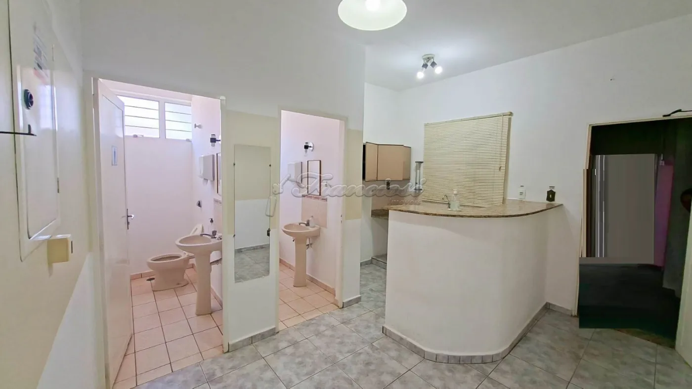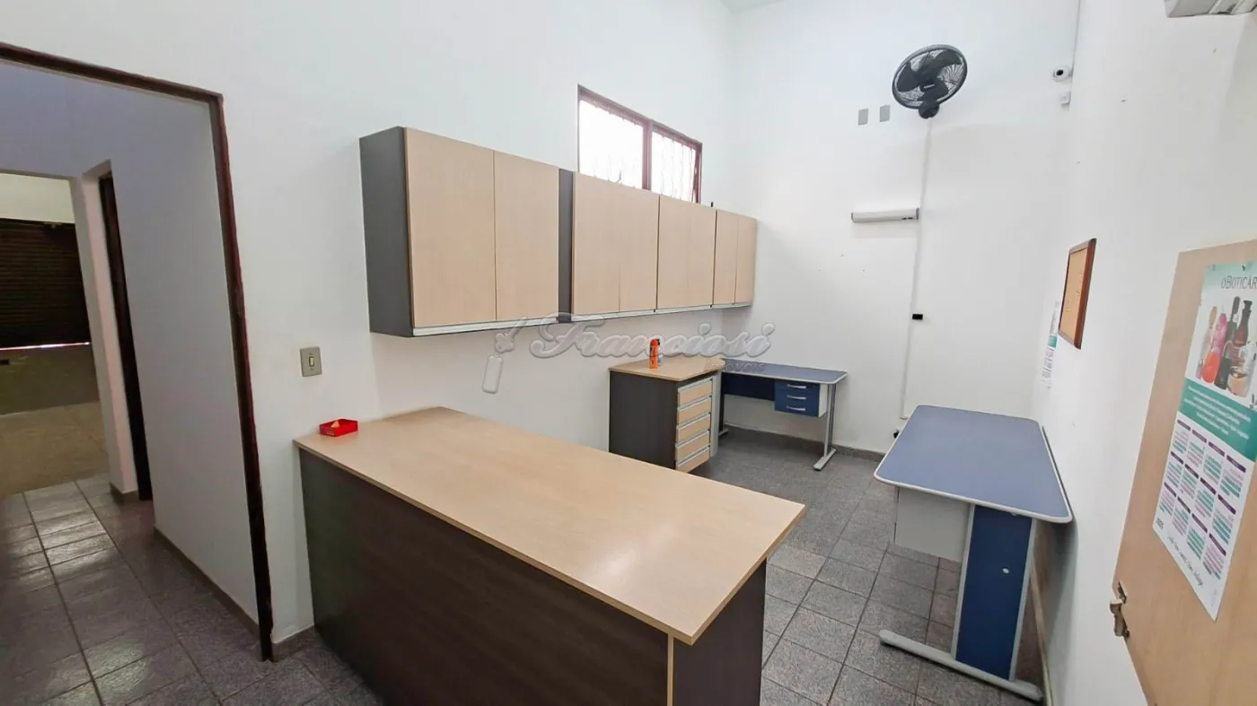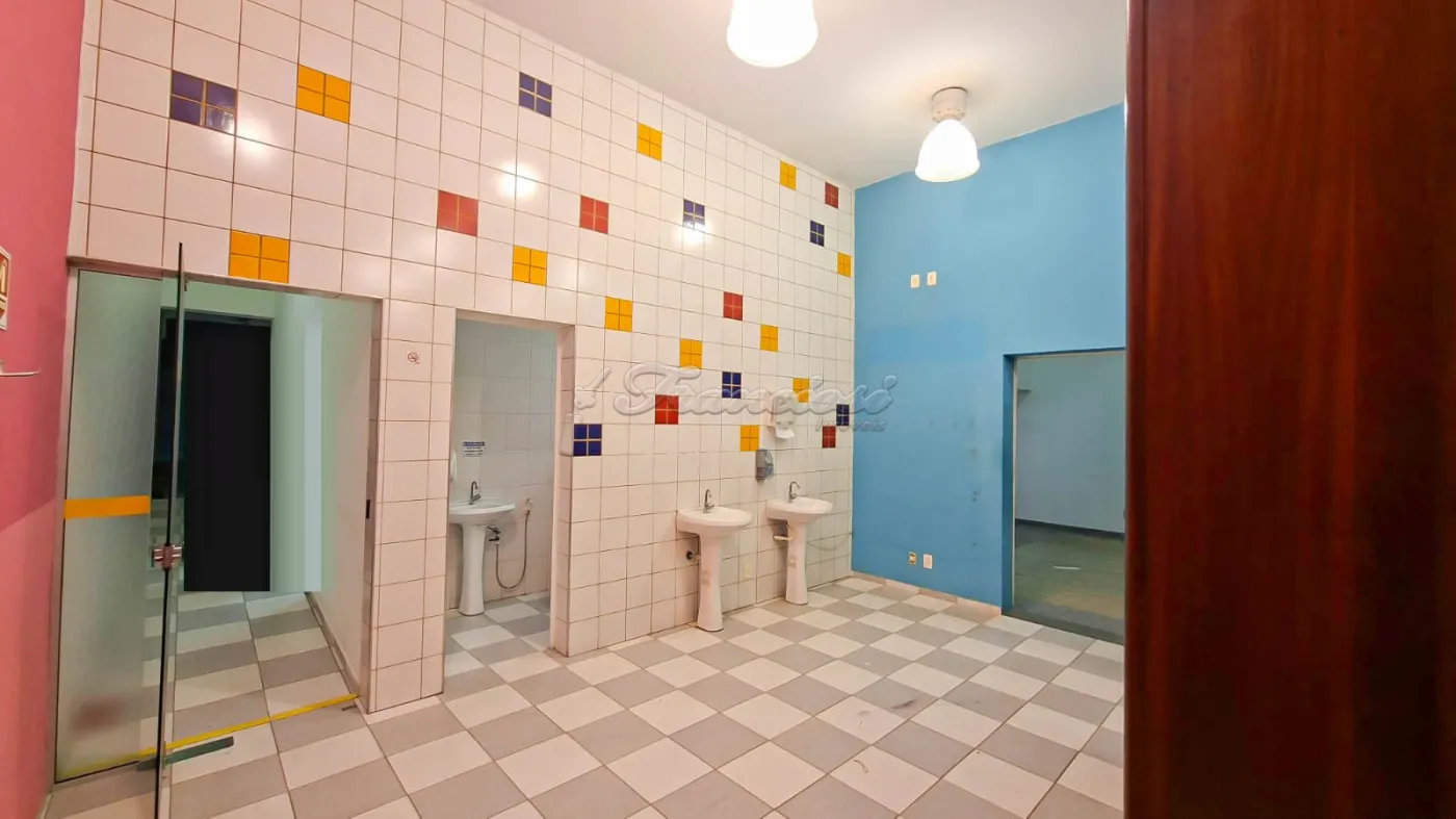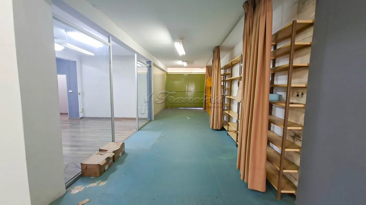 Salão comercial com recepção, 10 salas sendo 9 com ar condicionado, 6 banheiros, 2 salões médios, copa, lavanderia, 1 salão medindo 120 m², recuo para 4 carros e estacionamento coberto. Com porta de ferro automática.