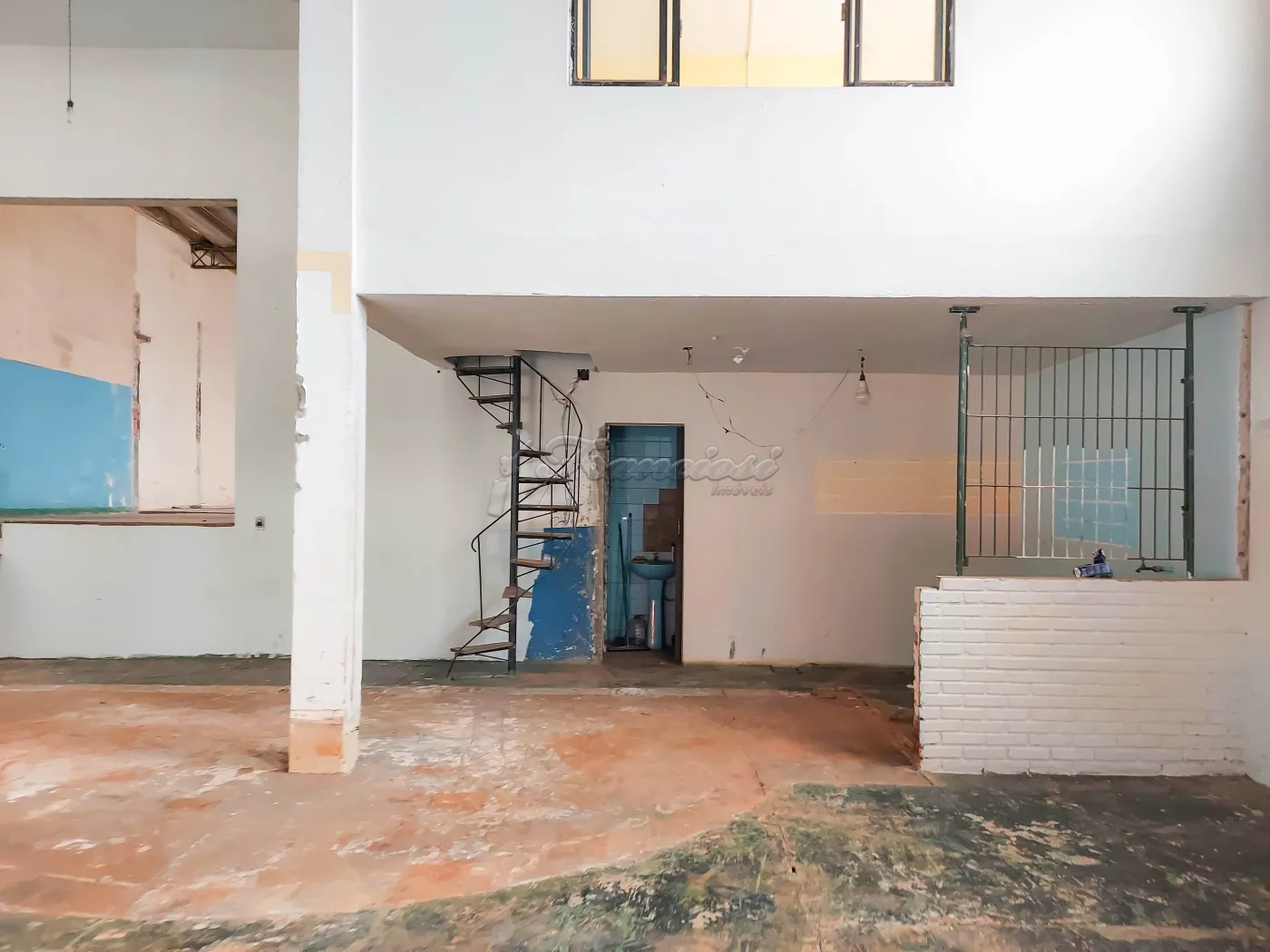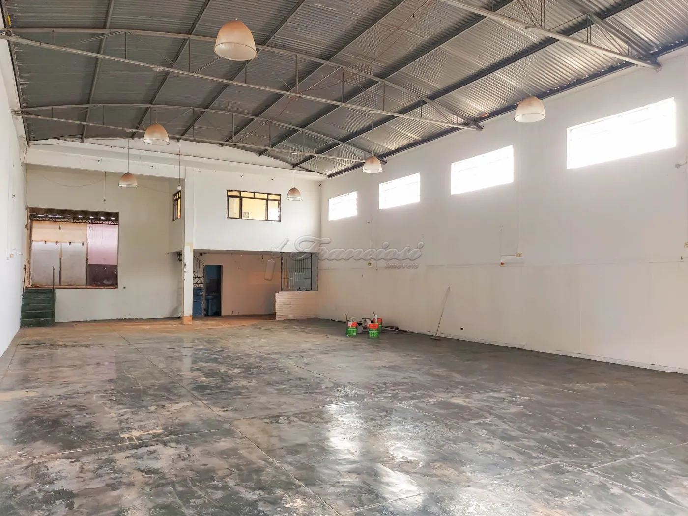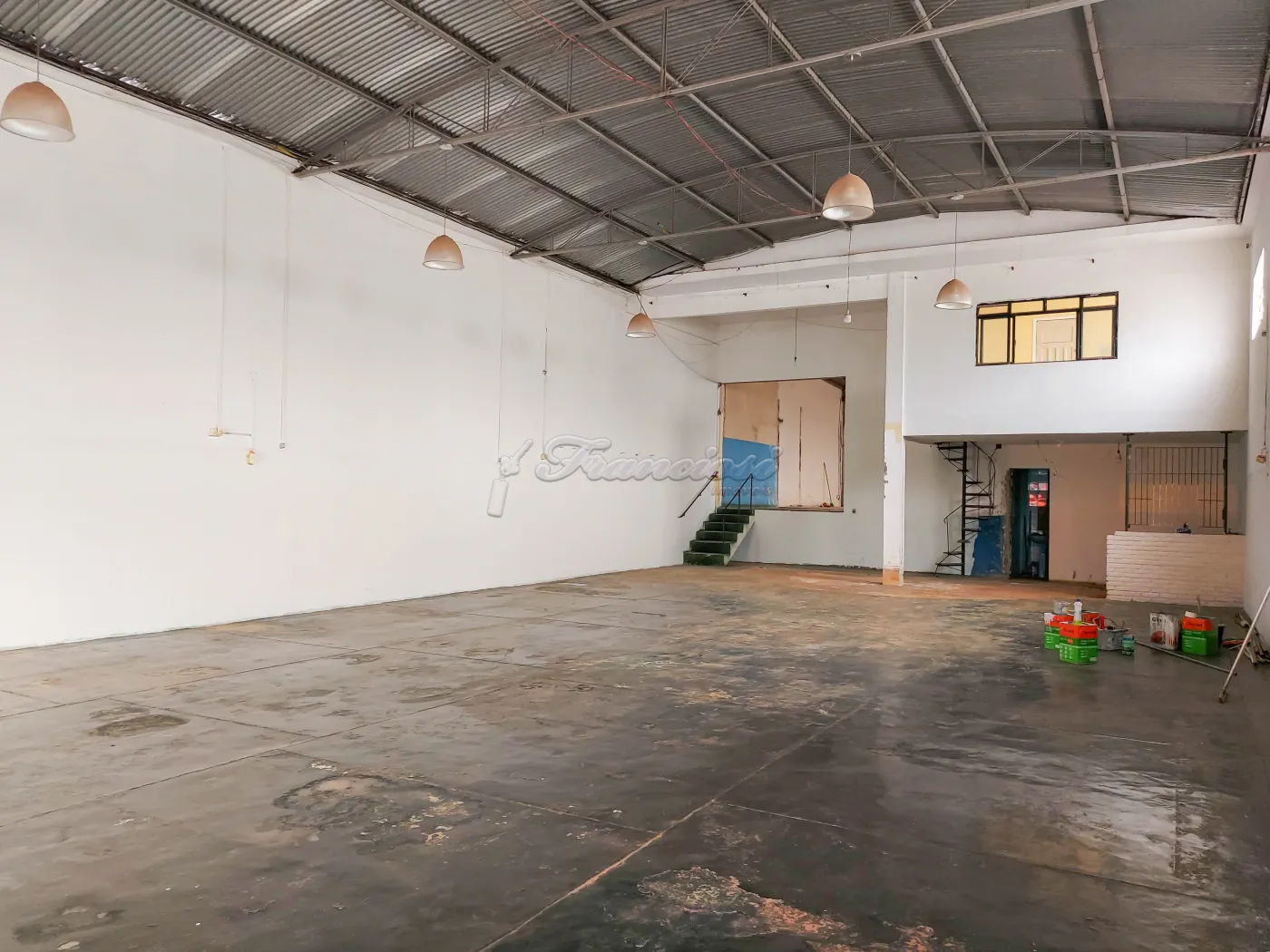 Salão comercial com 250 m² de pé direito, mezanino medindo 50 m², copa, 3 banheiros sendo 1 para deficiente, 1 banheiro fora, escritório, área de serviço. Acabamento: laje, piso frio e paredes com blindex