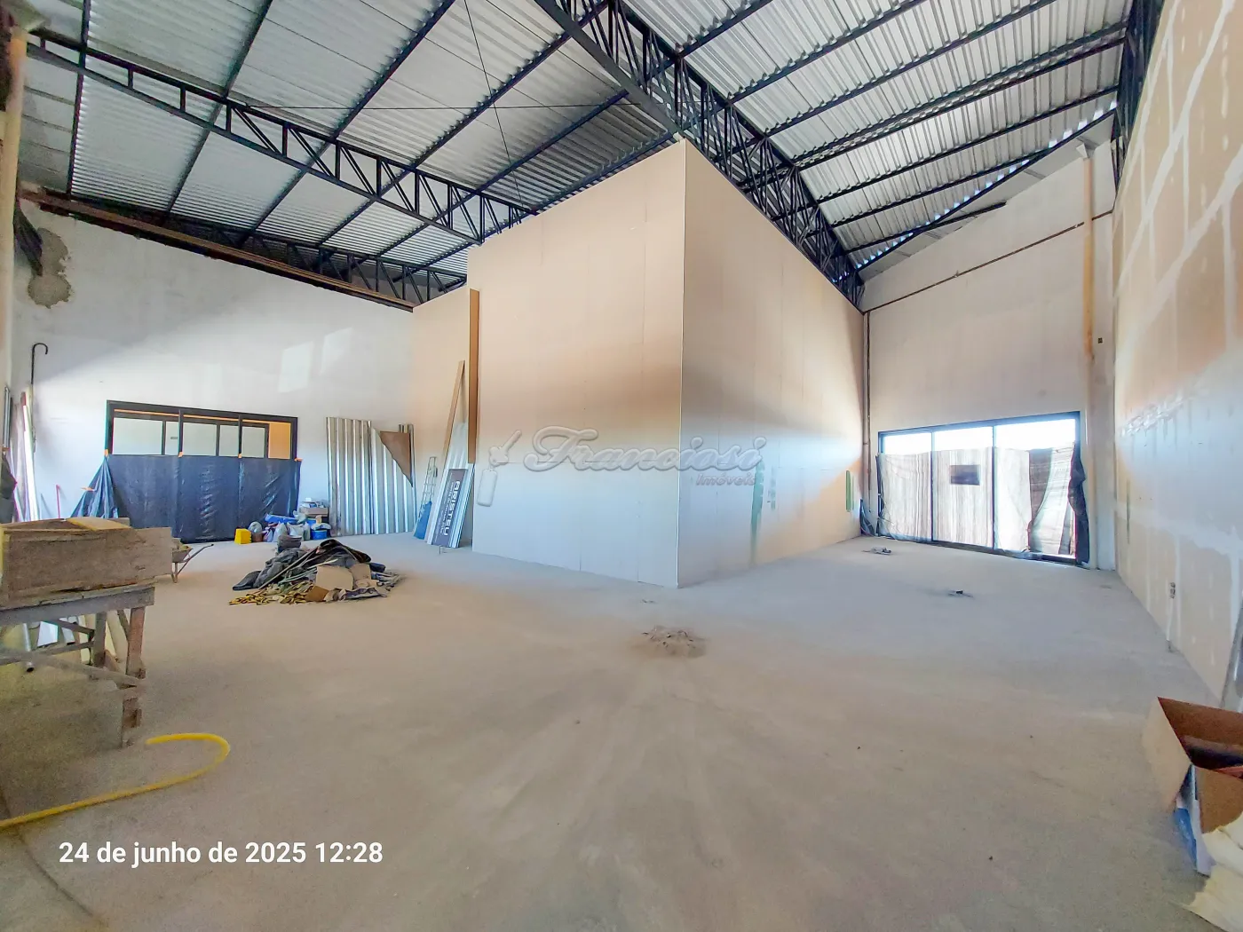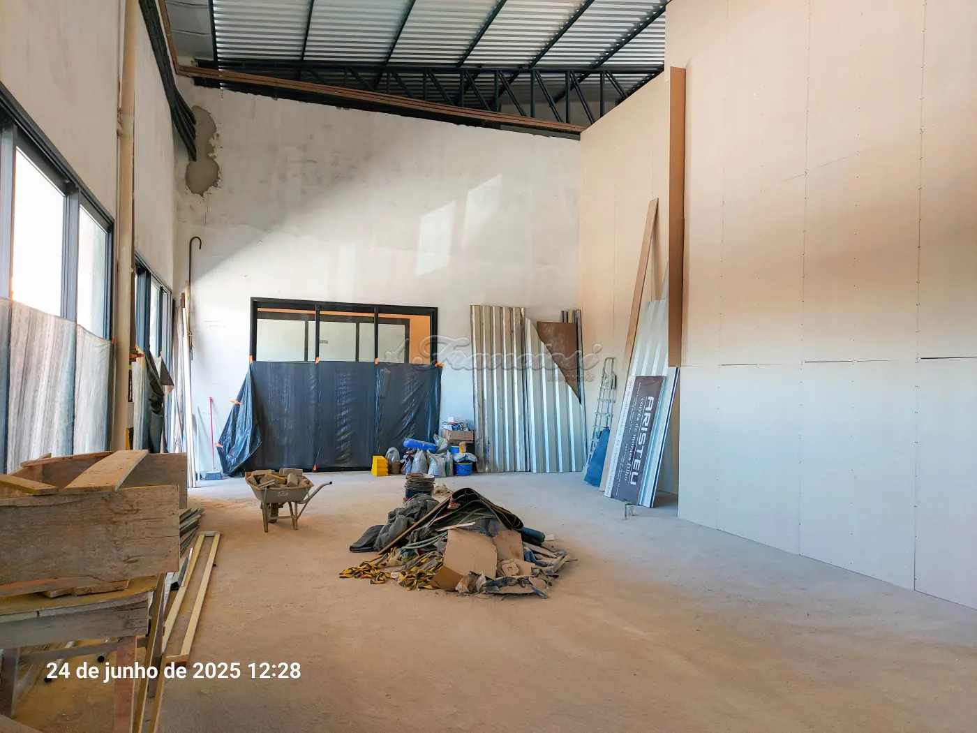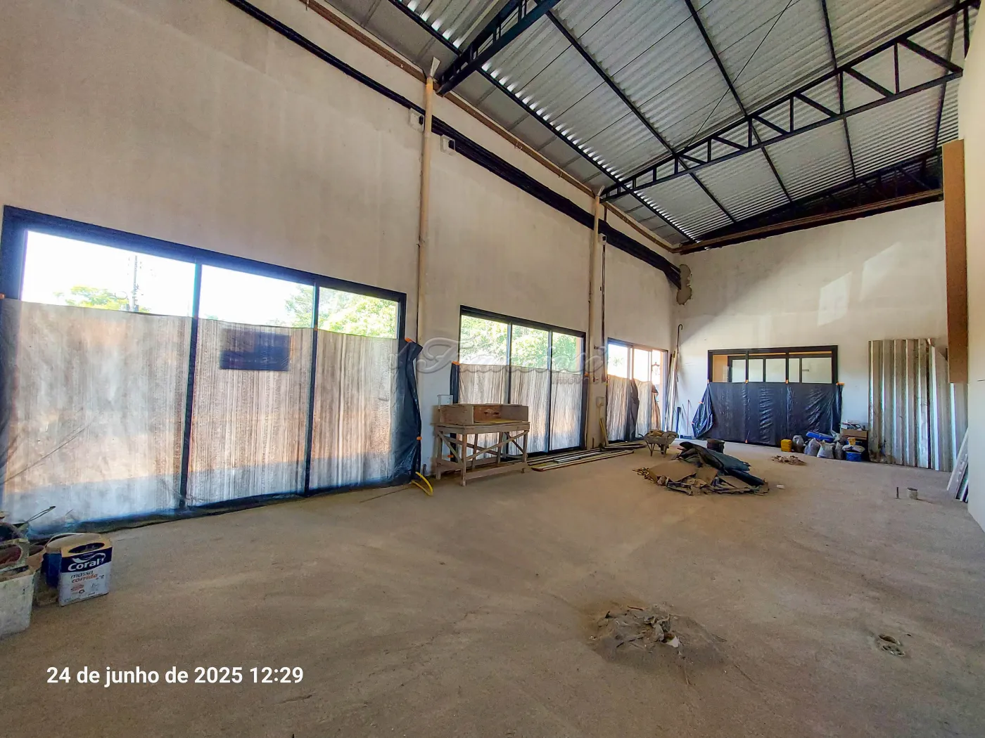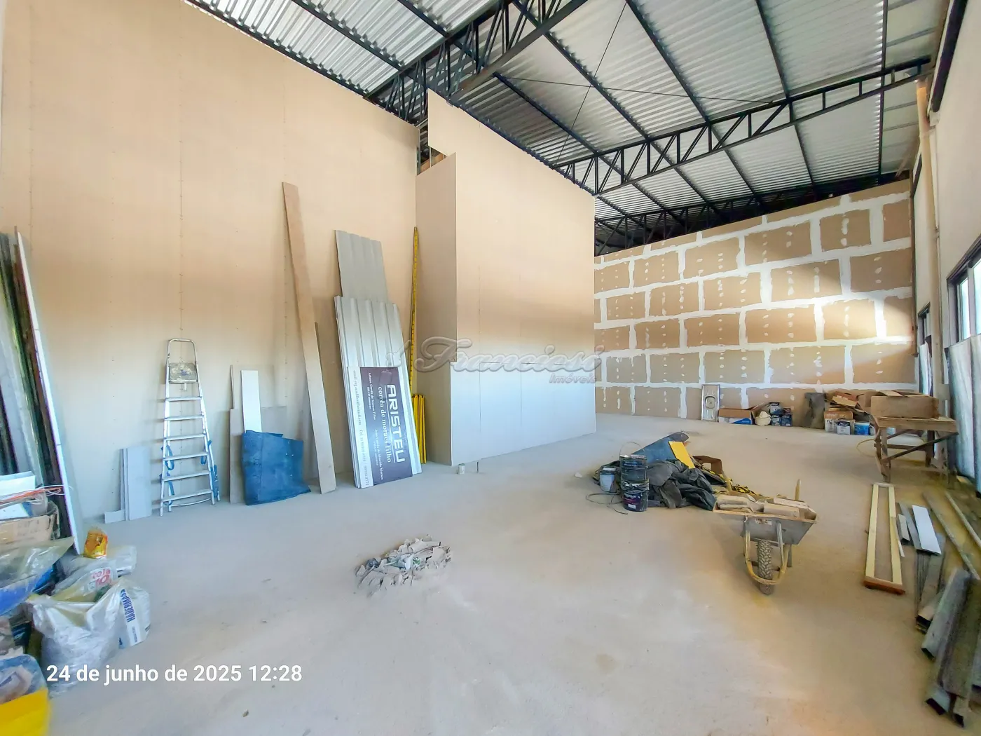 Barracão coberto com área construída total de 435 m², sendo 400 m² de barracão e 35 m² de mezanino. Possui 3 banheiros; 1 pia; área superior para escritório ou afins; salão grande na área inferior. Acabamento: piso frio, laje, banheiro azulejado até o teto e cobertura é com telha térmica.