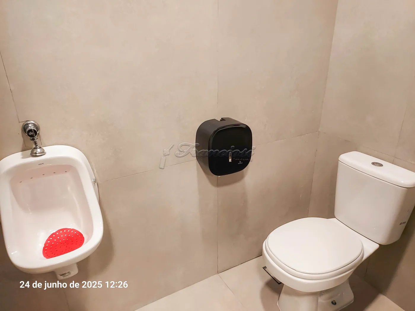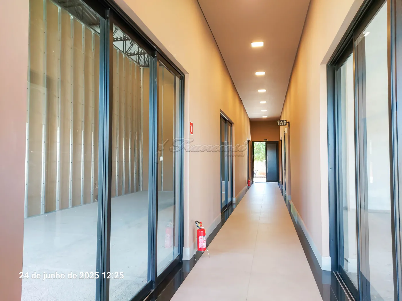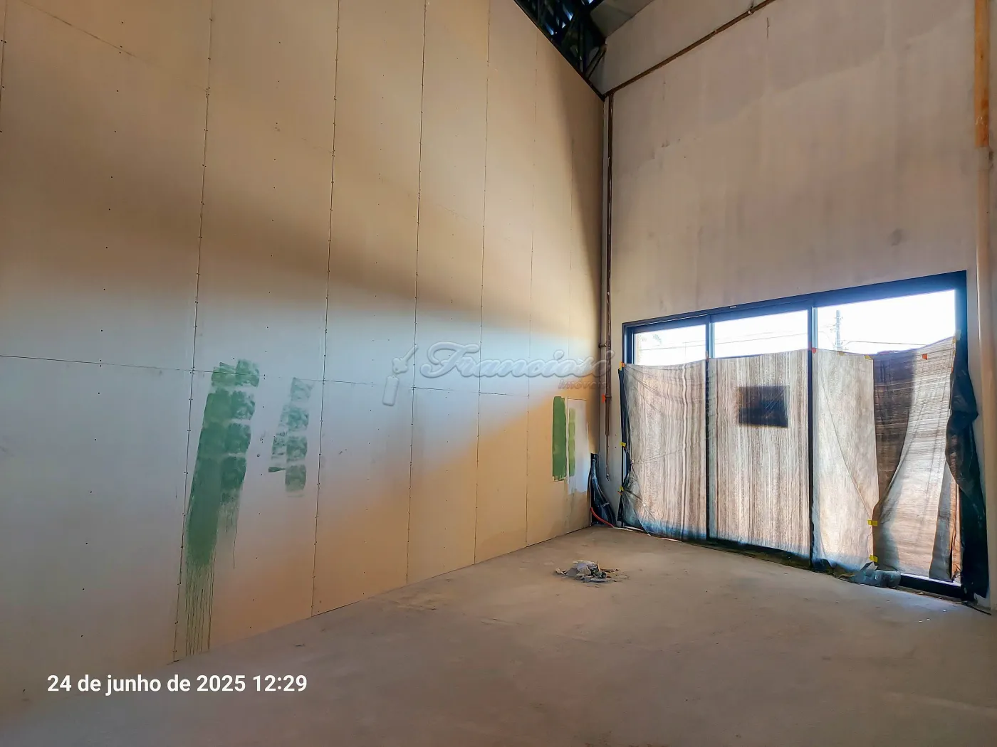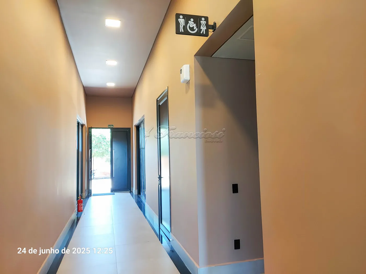 Barracão coberto com área construída total de 435 m², sendo 400 m² de barracão e 35 m² de mezanino. Possui 3 banheiros; 1 pia; área superior para escritório ou afins; salão grande na área inferior. Acabamento: piso frio, laje, banheiro azulejado até o teto e cobertura é com telha térmica.