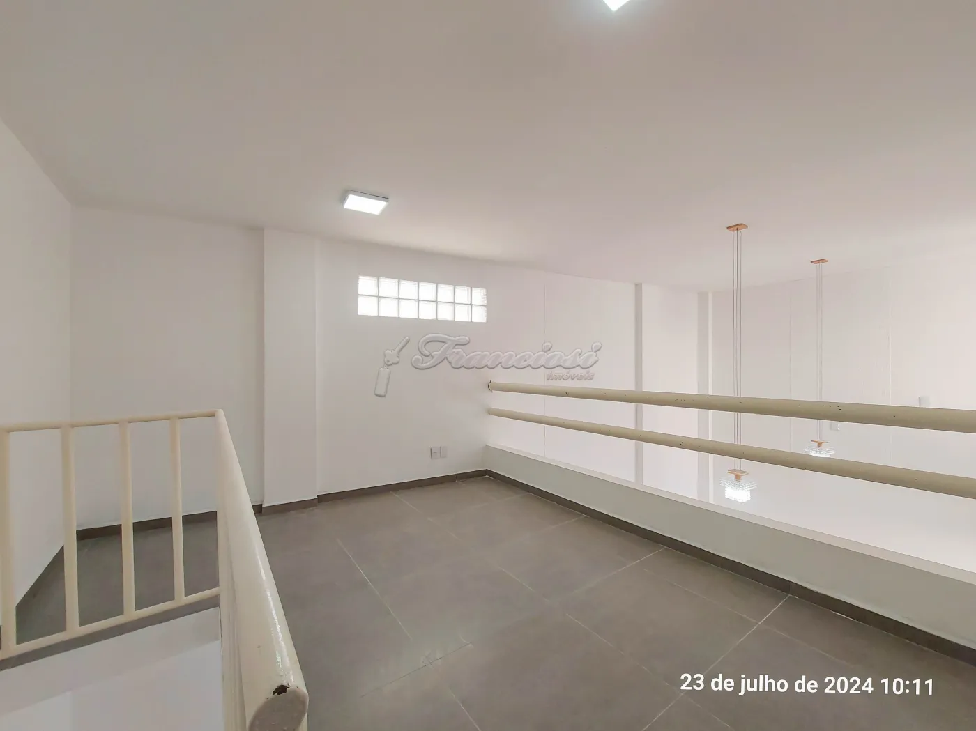 Salão comercial medindo 106,00 m² com prateleiras de vidro, hall de entrada, área de serviço coberta. Parte superior: 3 Salas sendo 1ª Sala (9 m²), 2ª Sala (15 m²), 3ª Sala (18 m²), 1 Banheiro com 5 m². Acabamento: laje, piso frio, porta de ferro e porta de blindex. Na parte superior 1 vitrine de blindex.