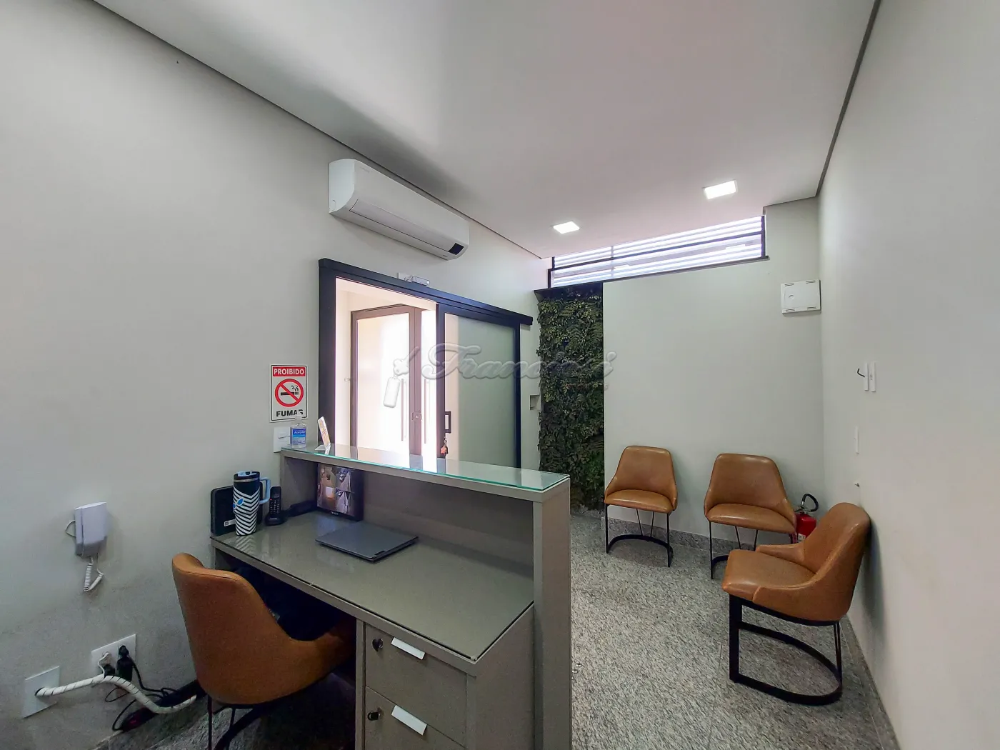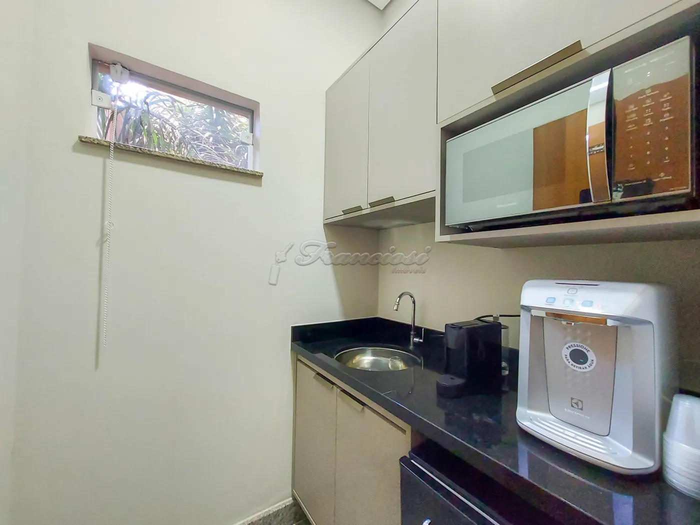 Recepção com mesa, ar condicionado, copa com pia e armário embutido, micro-ondas, filtro de água, maquininha de café e frigobar; banheiro de uso comum com acessibilidade para PCD e sala pequena medindo aproximadamente 10 m² para área da saúde contendo ar condicionado e pia.