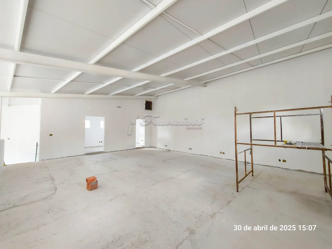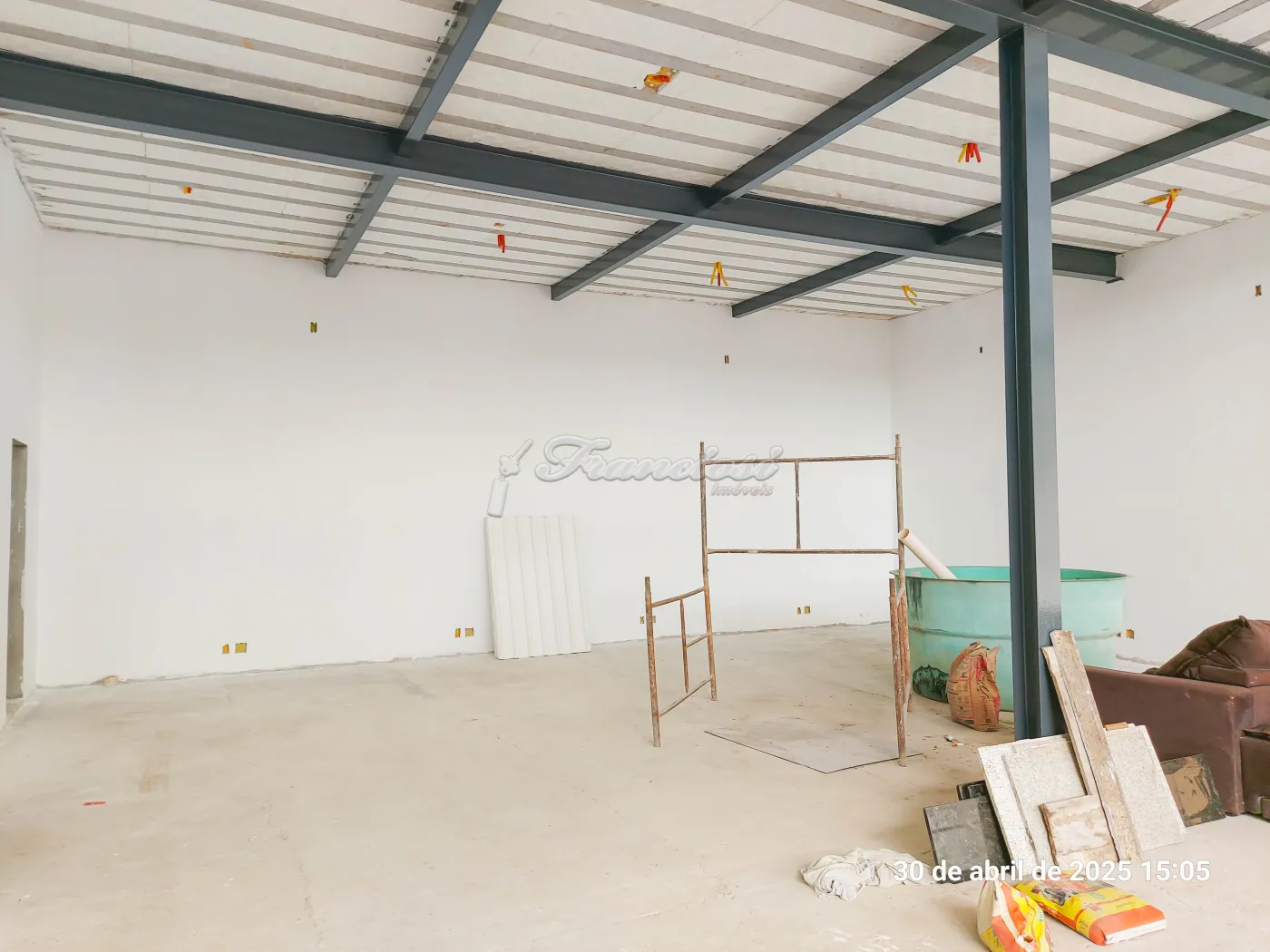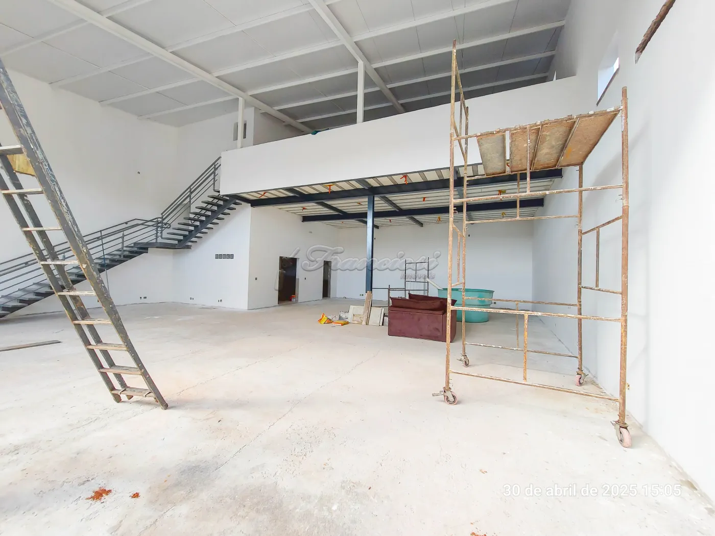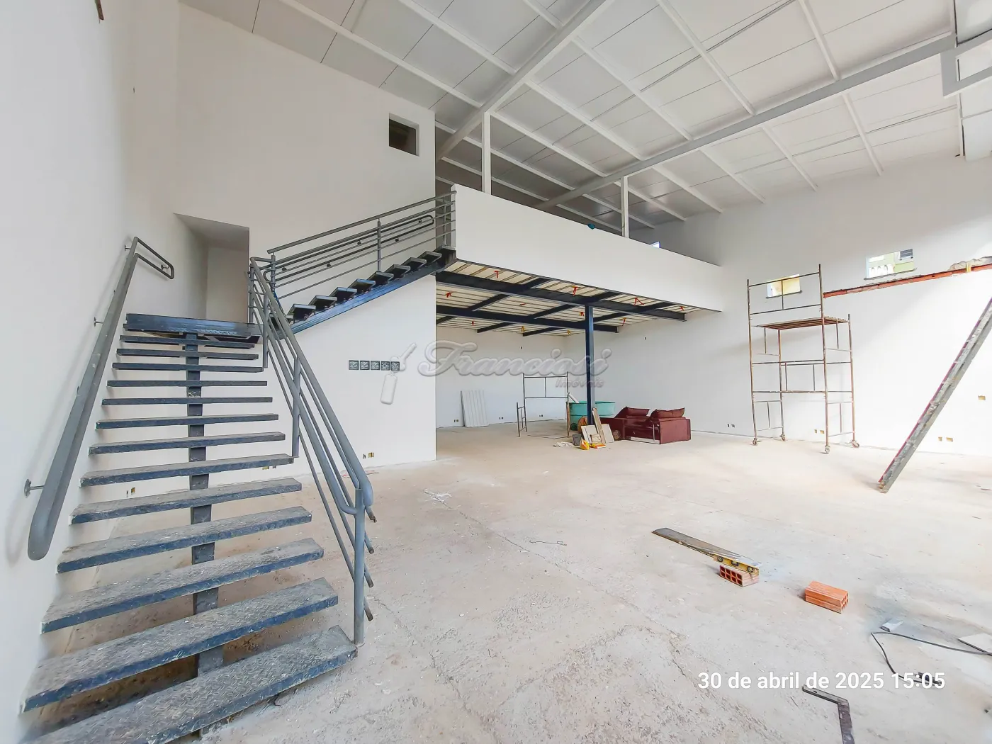 Salão comercial medindo aproximadamente 220 m² com 2 banheiros, cozinha, área de serviço e recuo para 6 carros no piso inferior e mezanino medindo 80 m² com depósito medindo 20 m², 2 banheiros e escritório no piso superior.