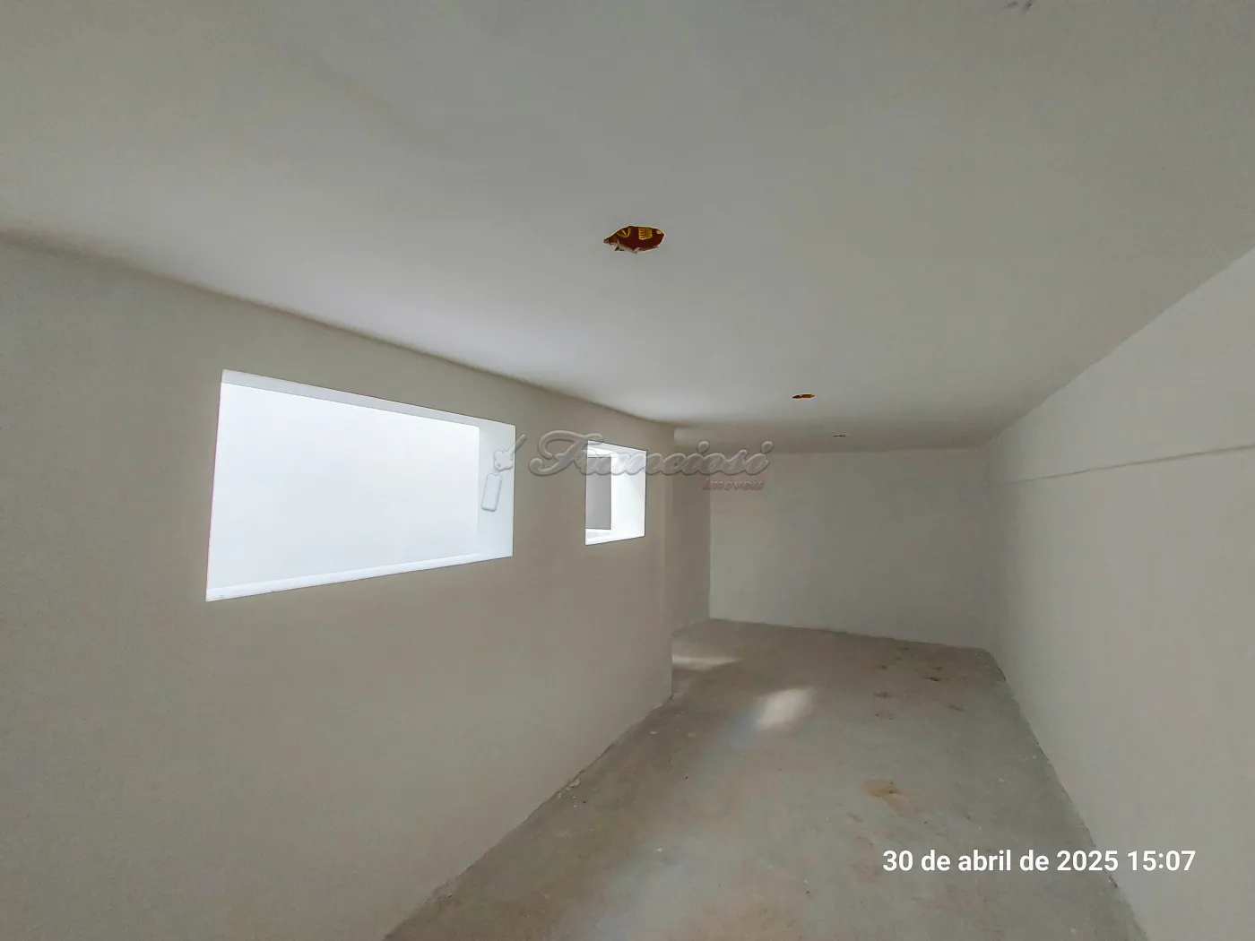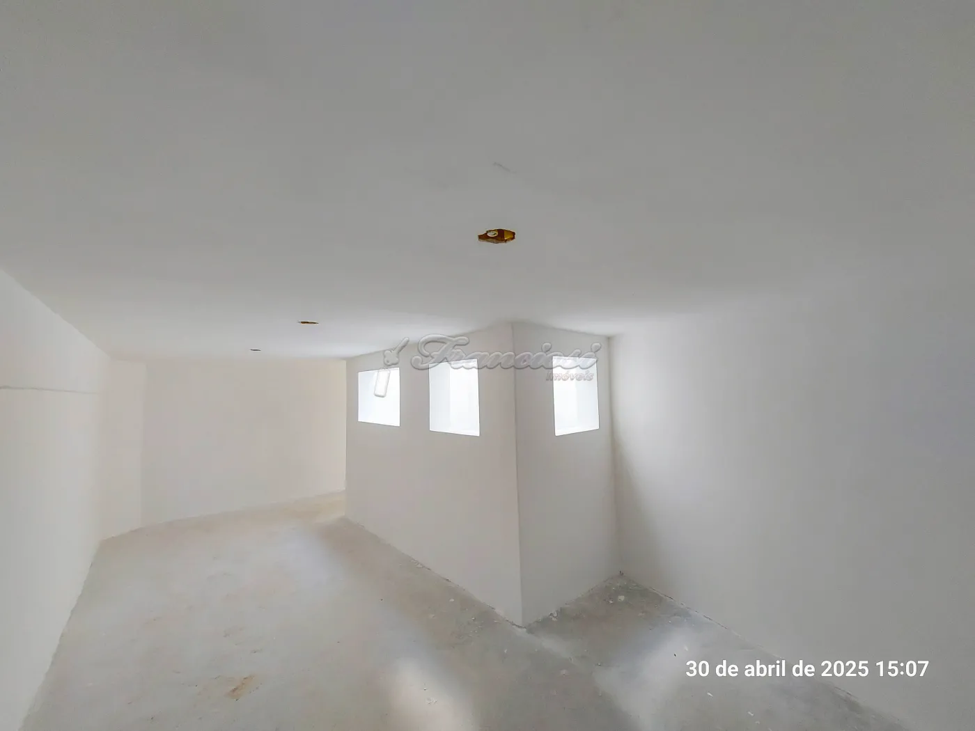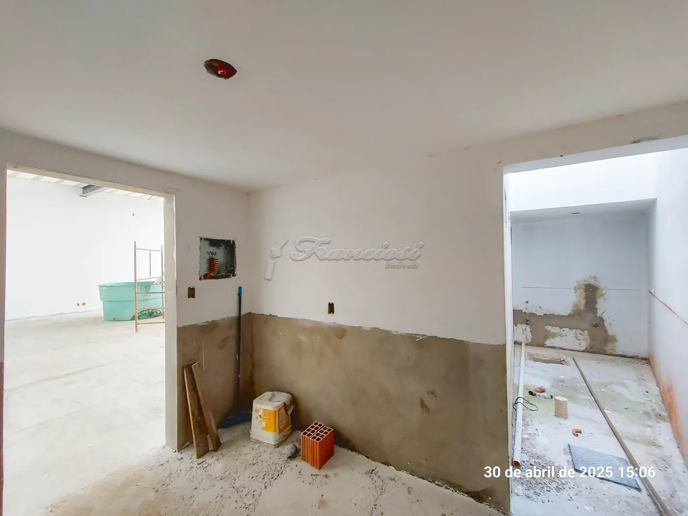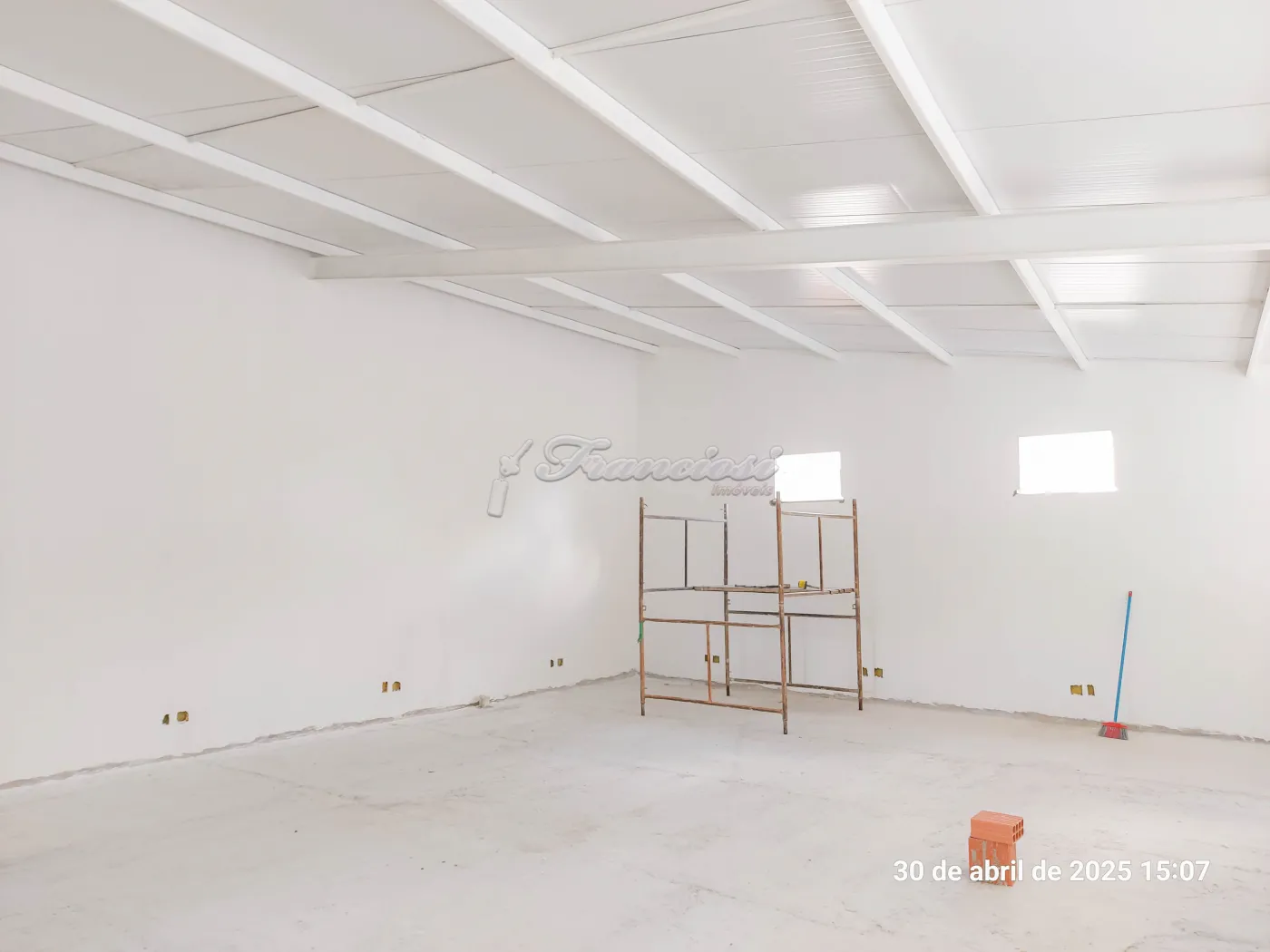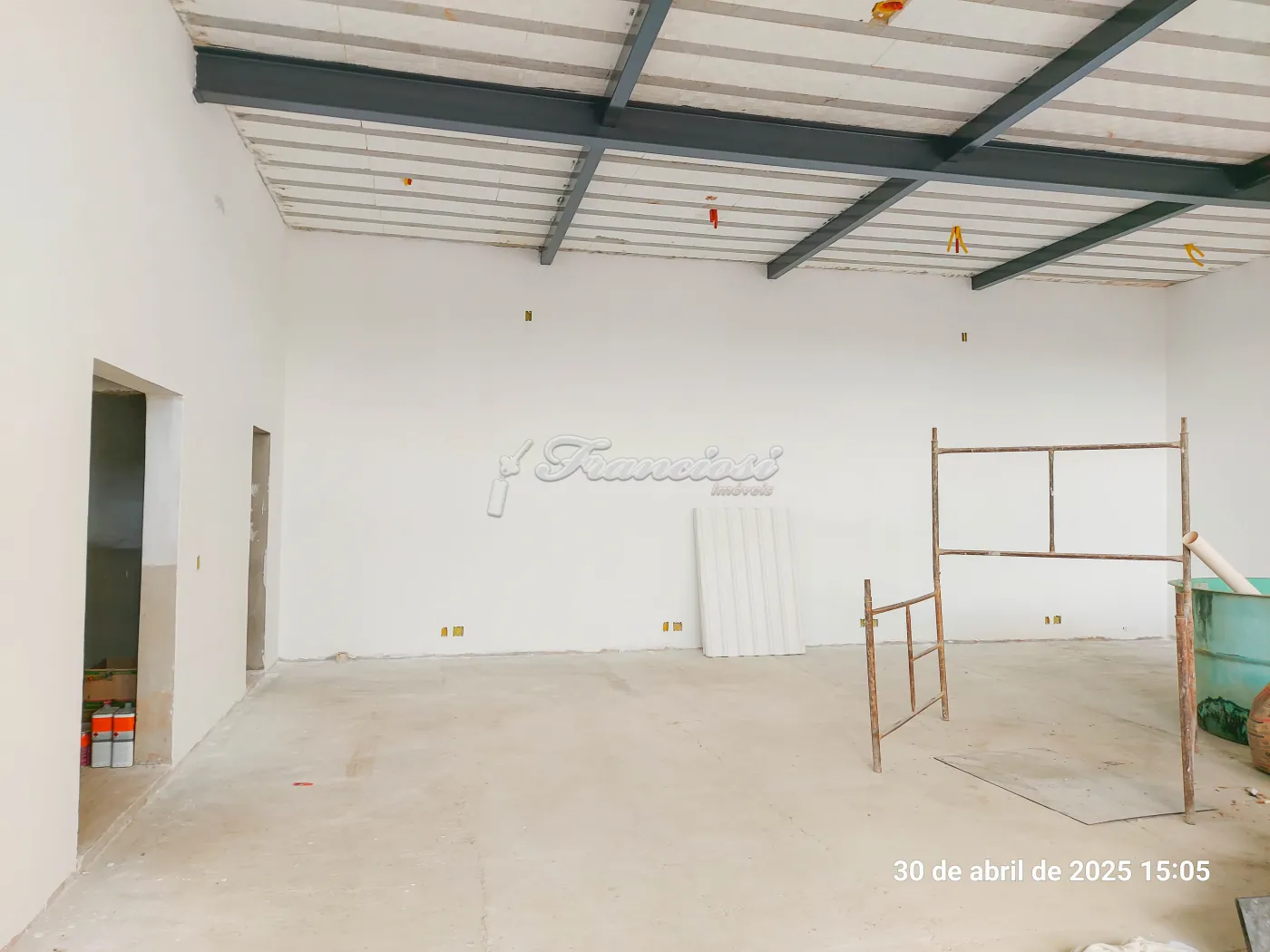 Salão comercial medindo aproximadamente 220 m² com 2 banheiros, cozinha, área de serviço e recuo para 6 carros no piso inferior e mezanino medindo 80 m² com depósito medindo 20 m², 2 banheiros e escritório no piso superior.