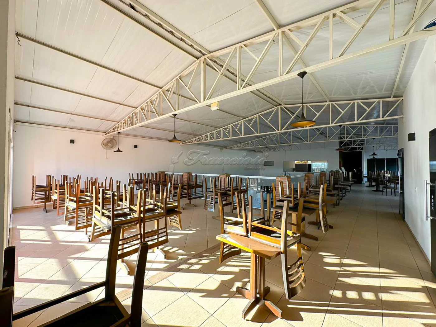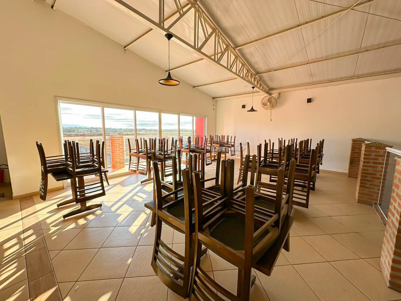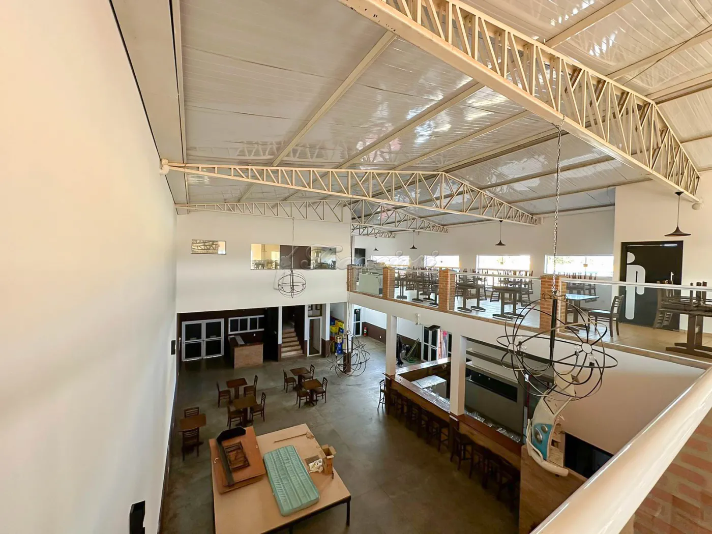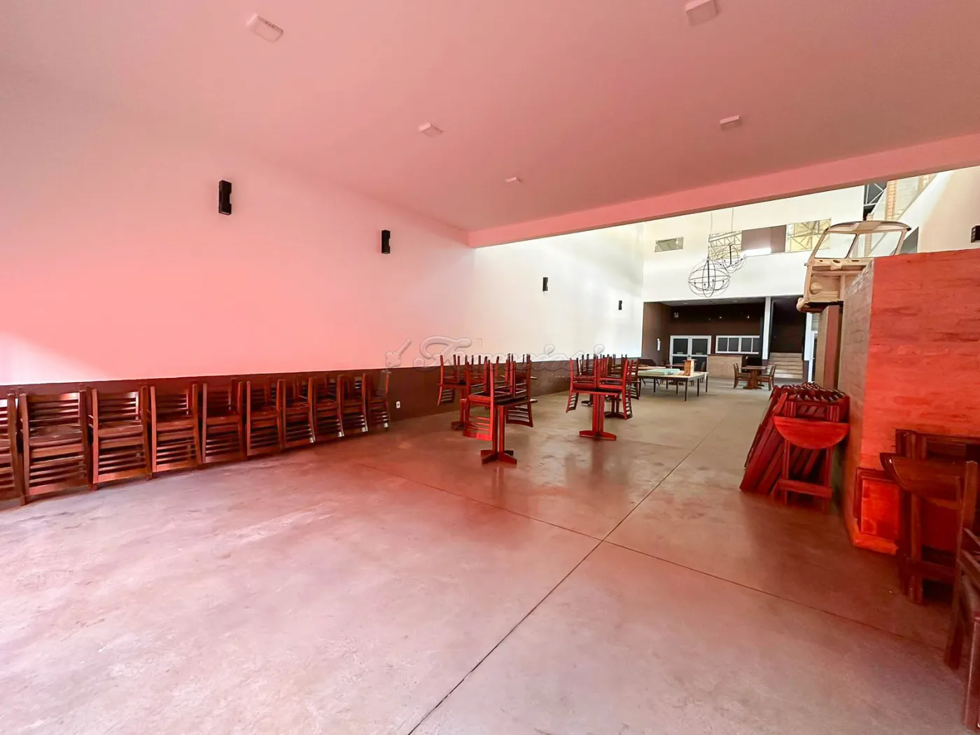 Salão comercial amplo com mesas e cadeiras, deck amplo, recepção, espaço para bar equipado, área de luz, cozinha industrial toda equipada, 2 banheiros com acessibilidade, mezanino com escritório, 2 banheiros, mesas e cadeiras, 1 sala, copa e varanda. Recuo para vários carros.