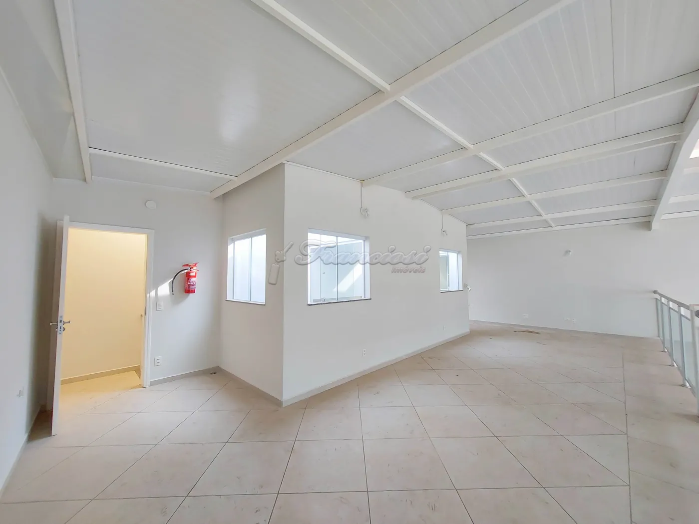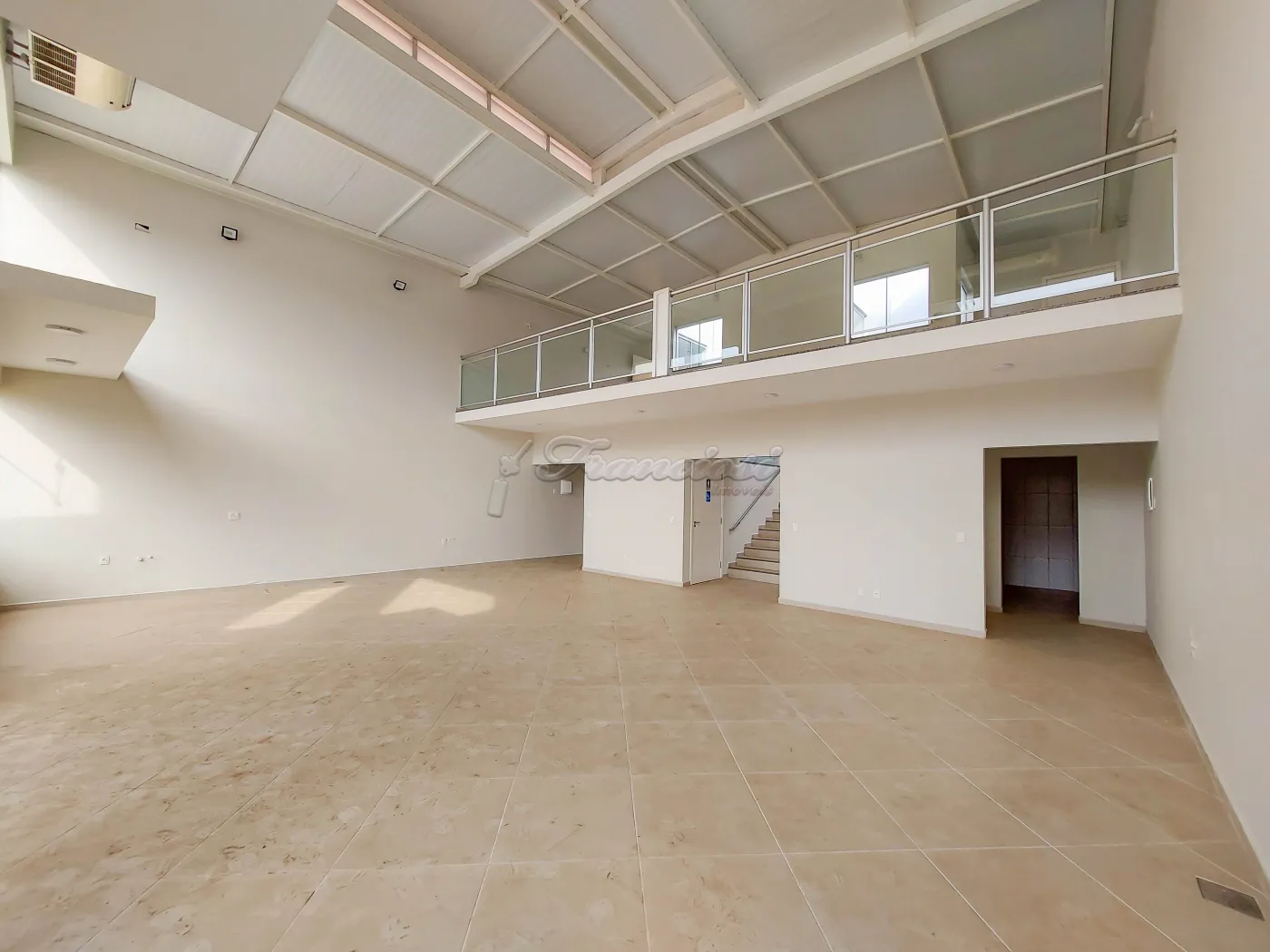 Salão comercial medindo 140 m², 2 banheiros com acessibilidade, cozinha, 1 sala, despensa, mezanino e recuo para 2 carros.