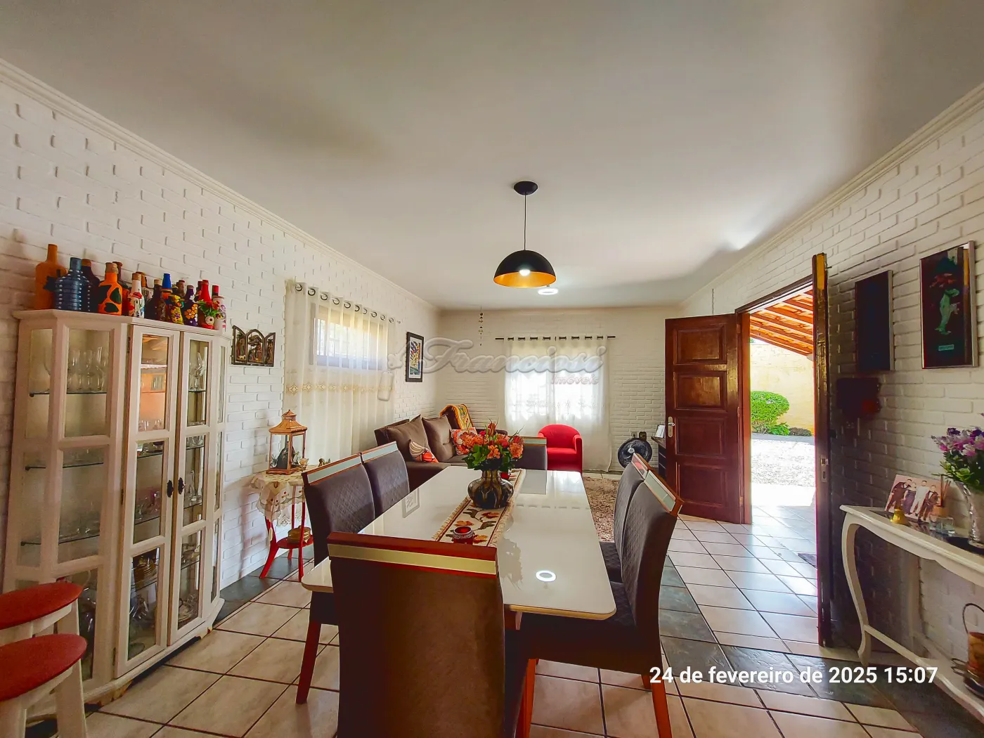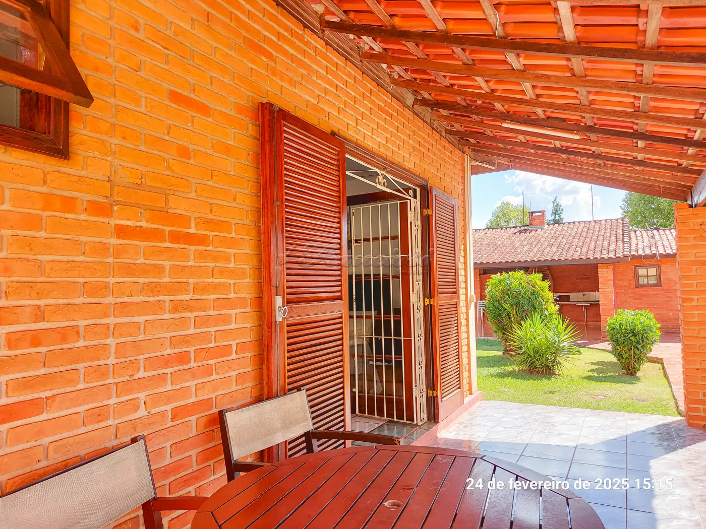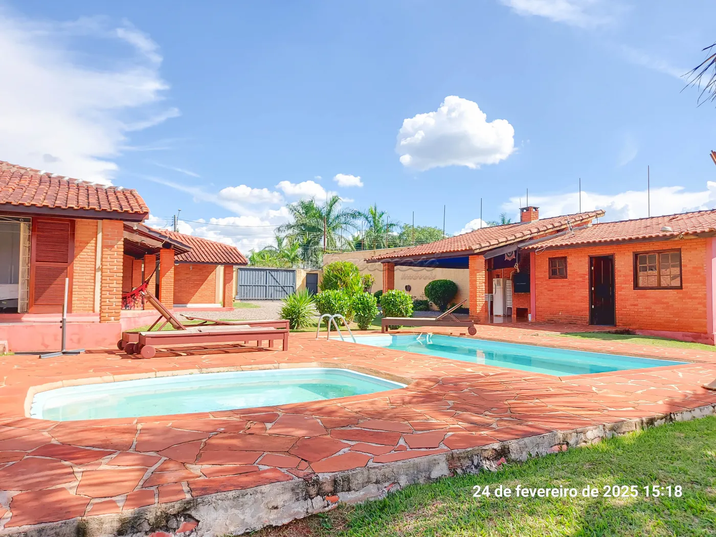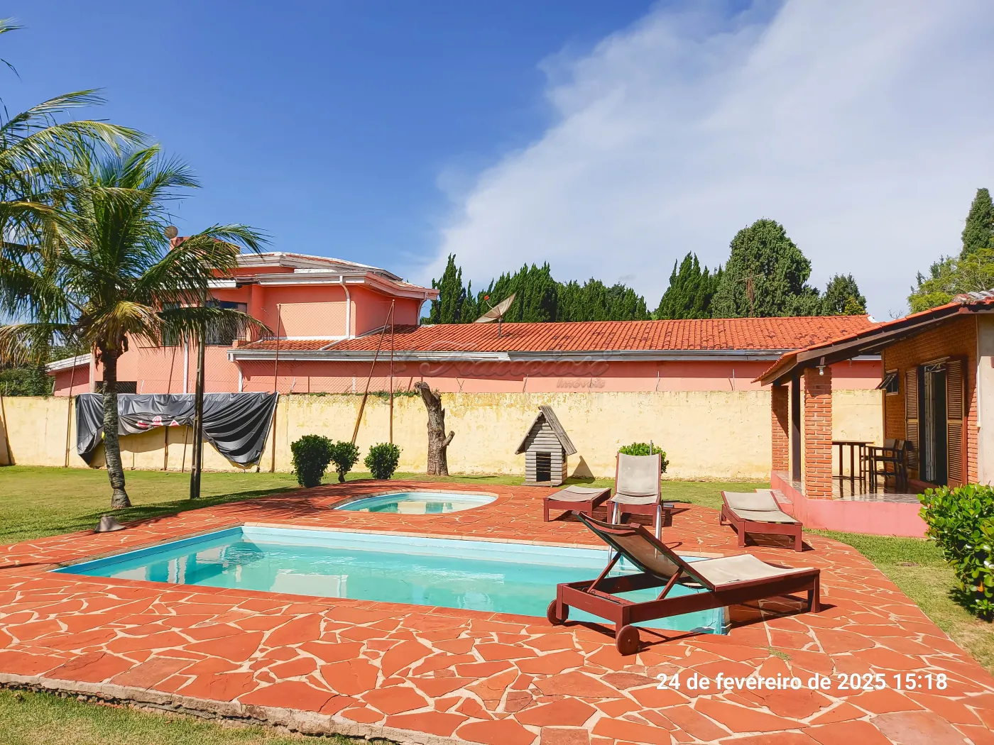 Casa com 3 suítes, sala de estar para 2 ambientes, cozinha, 1 banheiro social, despensa, área de serviço, edícula com 1 cômodo e banheiro, quintal grande, pomar, varanda, canil, campo de futebol, churrasqueira, salão de festas, piscina, sauna, garagem coberta para 2 carros e entrada para mais.