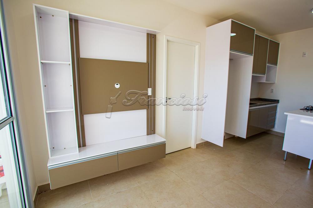 Apartamento mobiliado com sala, cozinha, 1 dormitório suíte com ar condicionado, lavanderia, varanda e vaga para 1 carro.