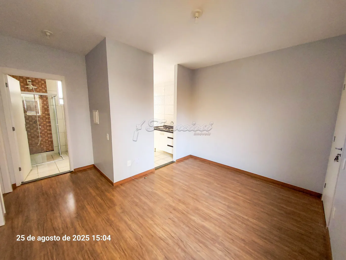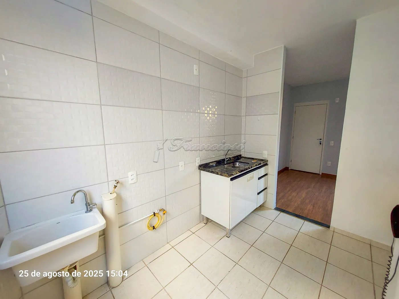 Acabamento em laje, piso laminado e piso frio. Cozinha e banheiro com revestimento em azulejo até o teto, ambos com gabinete, e pia da cozinha com gabinete instalado.
