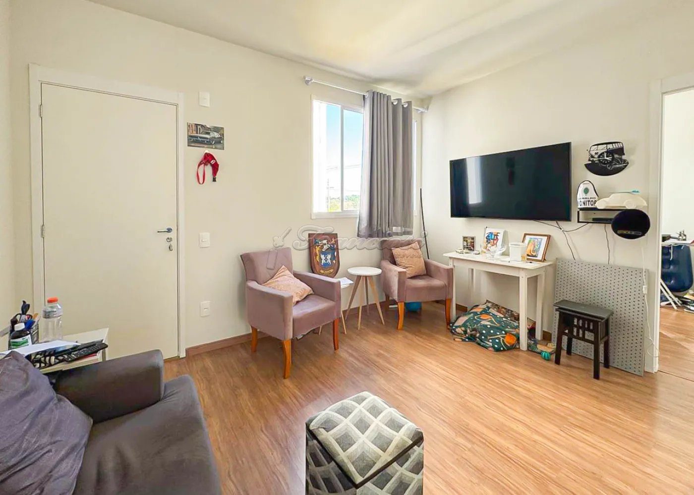 Apartamento dispõe de 02 dormitórios, sala de estar, cozinha com gabinete, 01 banheiro social e 01 vaga de garagem. Imóvel perto da portaria, com 01 lance de escada.