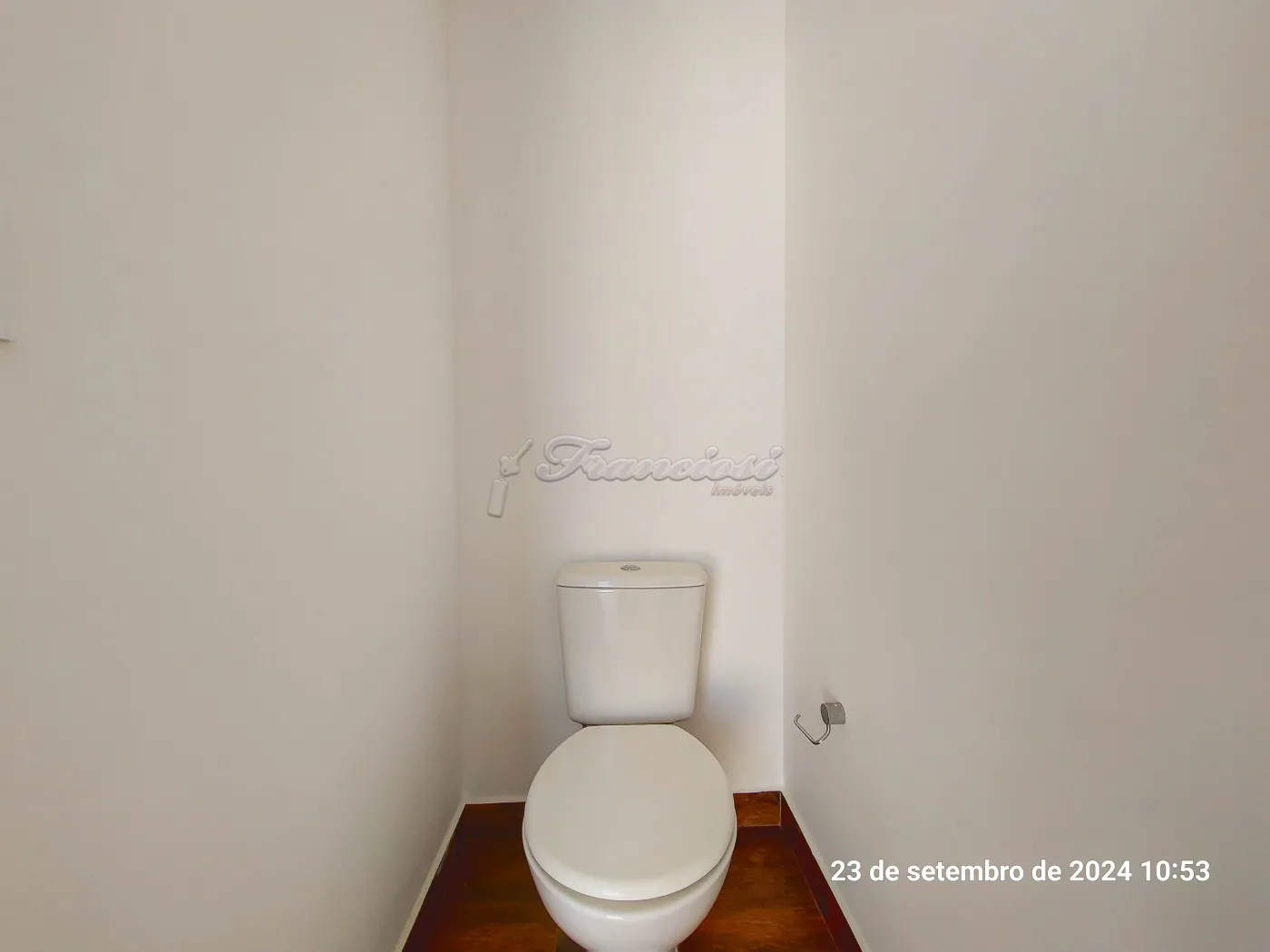 Parte superior com sala, lavabo, área gourmet com churrasqueira e pia.