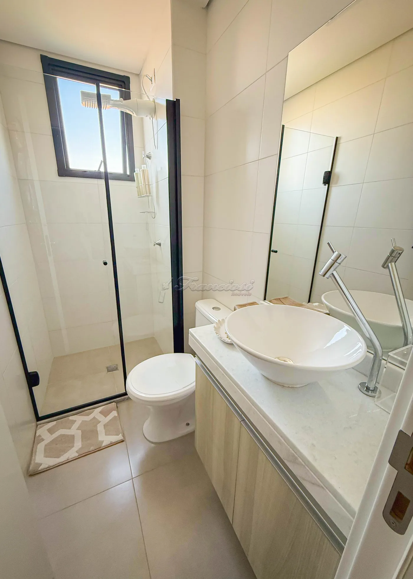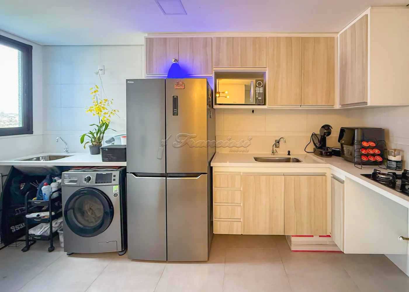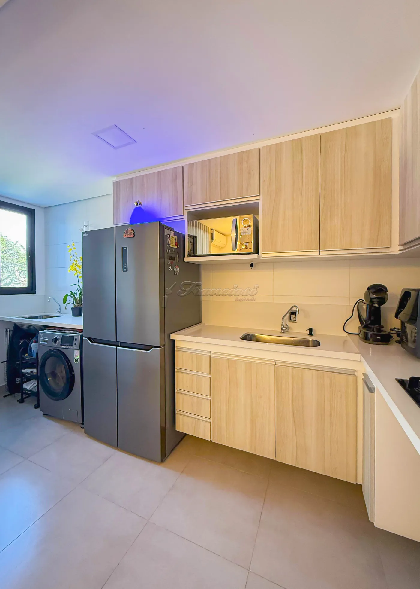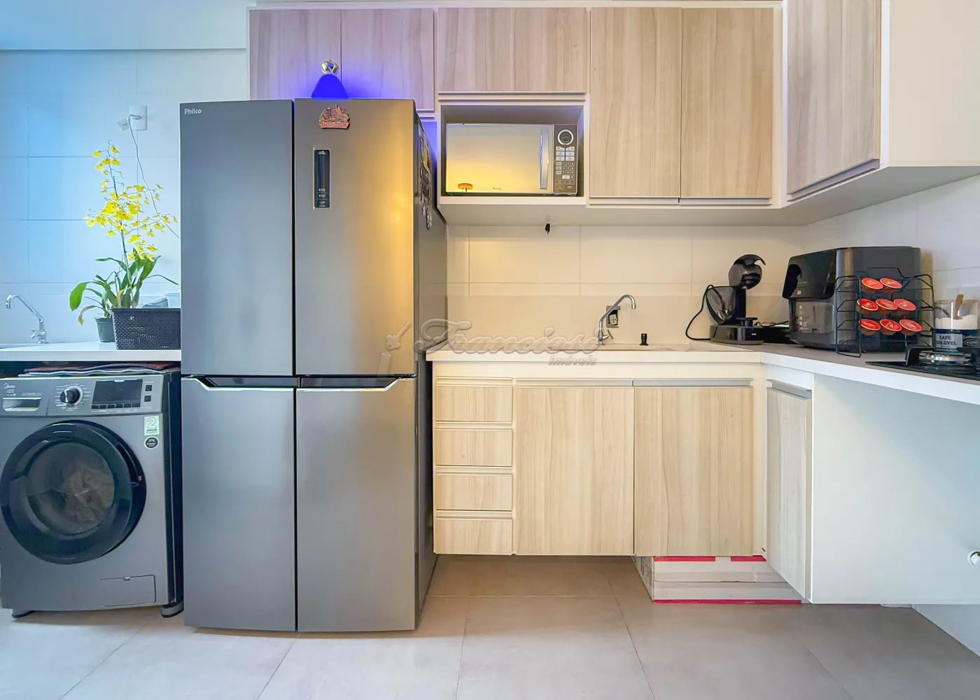 Acabamento e mobiliário: bancada em quartzo branco, armários planejados, mesa de jantar para 04 lugares, sofá modulado, cama box king, 01 cama queen, 02 mesas de cabeceira, 02 duchas, além de ar-condicionado de 12.000 e 9.000 e piso frio.