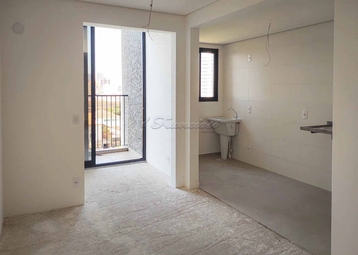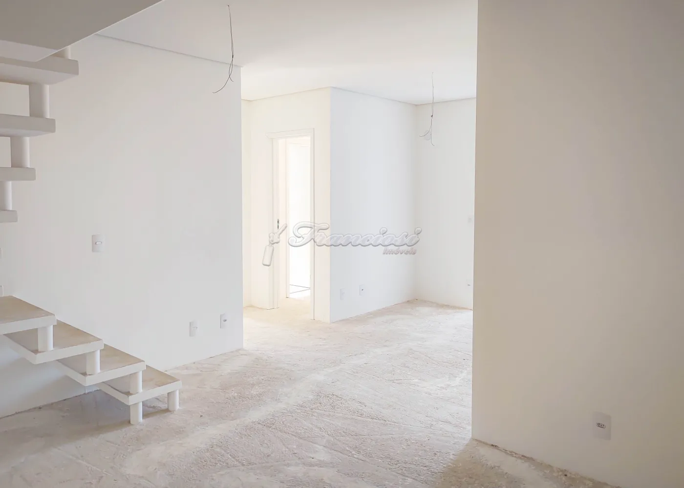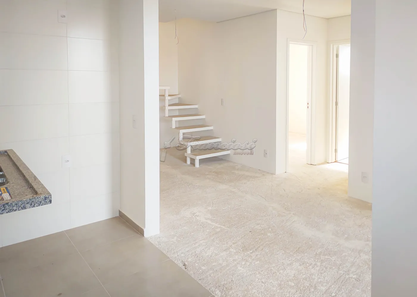 Apartamento duplex, sendo no piso inferior uma sala de estar e de jantar, varanda, cozinha integrada à lavanderia, dois dormitórios, sendo uma suíte e um banheiro social. Uma escada conduz ao segundo pavimento, o qual oferece espaço gourmet, um lavabo e quintal privativo. O imóvel também dispõe de duas vagas de garagem.