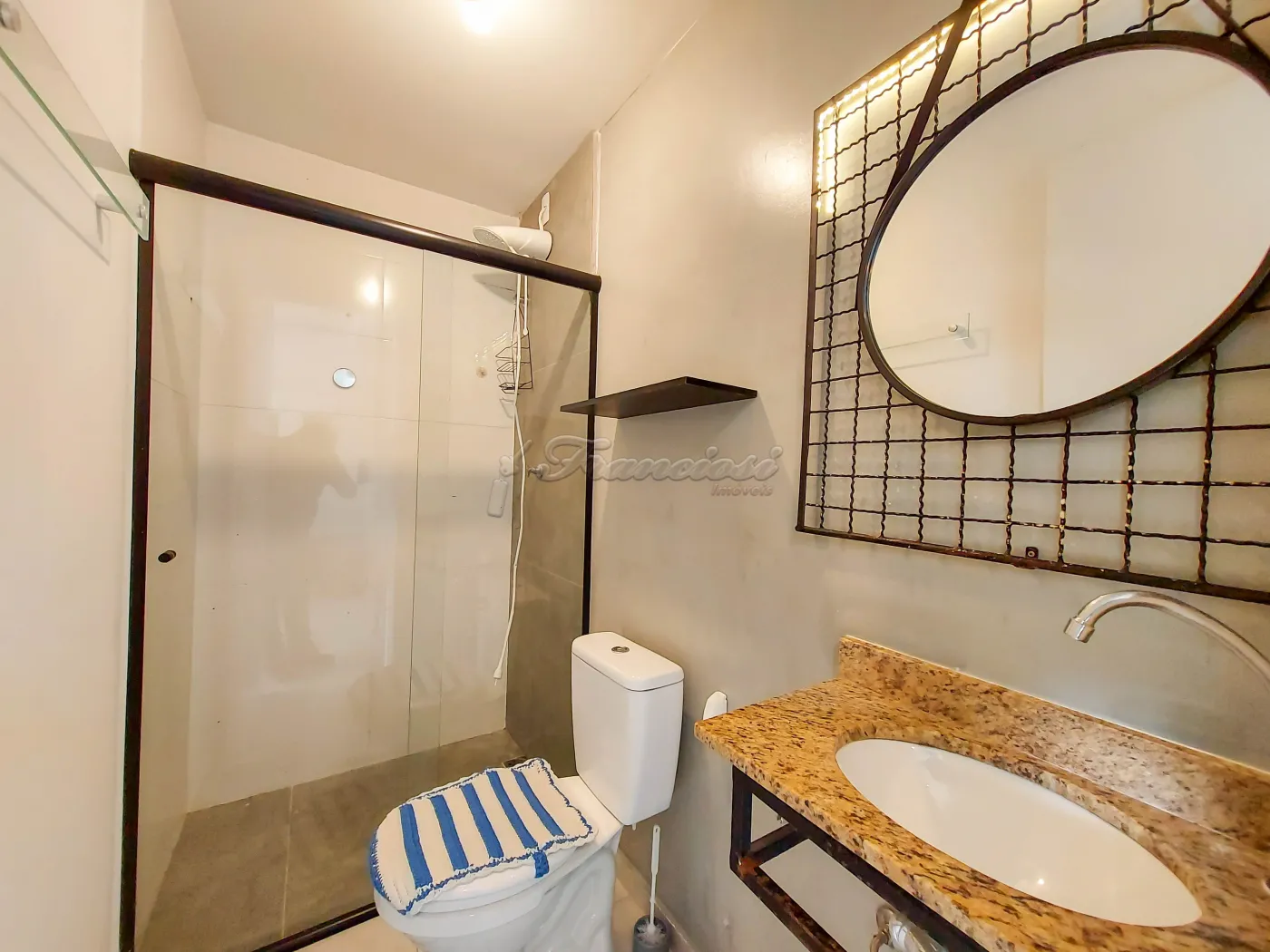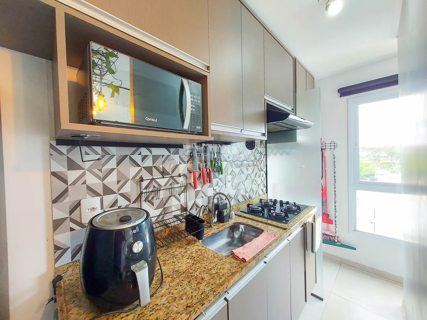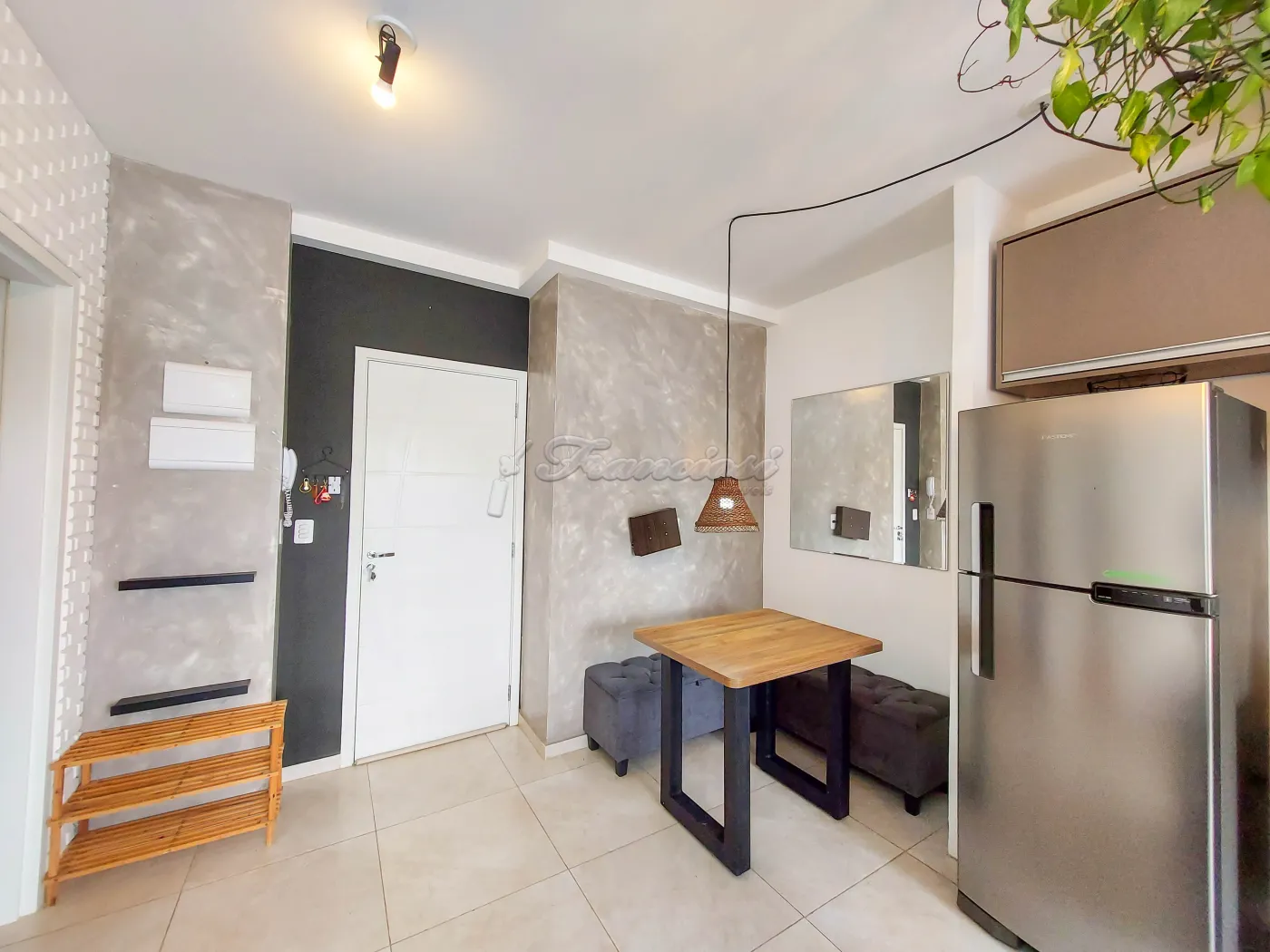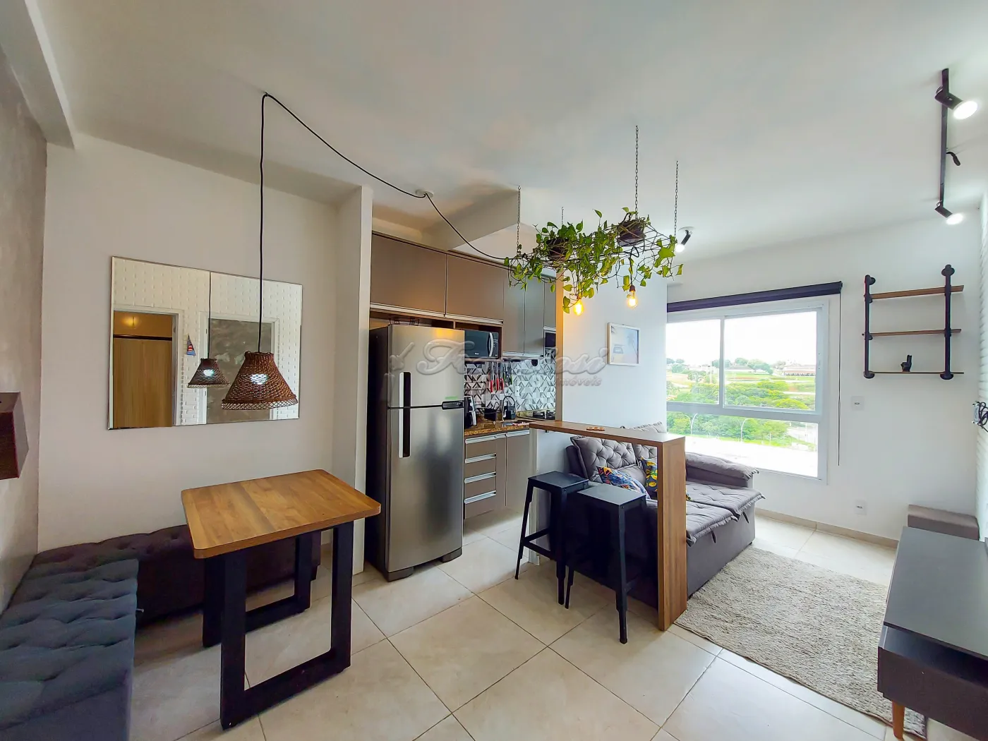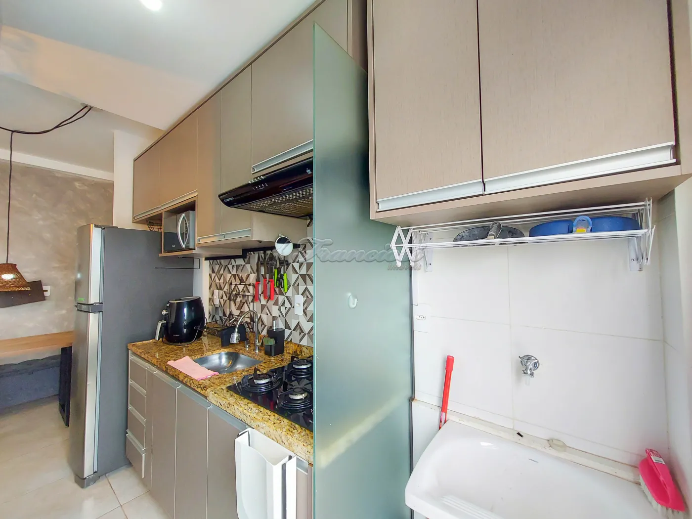 Apartamento semi mobiliado com 1 dormitório com guarda roupa, sala com sofá e rack, mesa e bancos, cozinha com geladeira, micro-ondas, air fryer e armários, 1 banheiro social com box blindex, área de serviço e vaga descoberta para 1 carro.