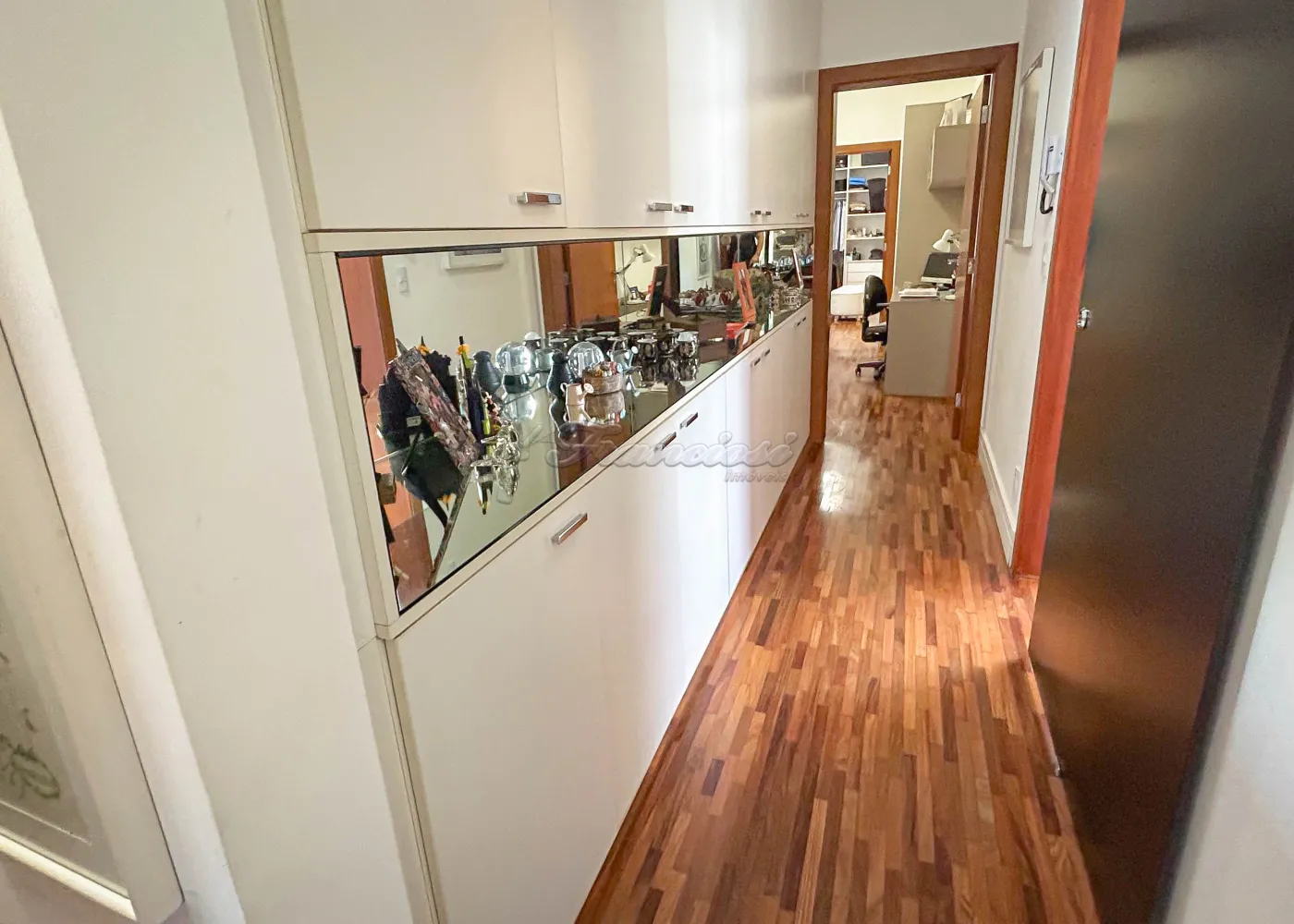 Janelas automatizadas, esquadrias linha gold, taco de madeira, porcelanato, espelho e vidro.
