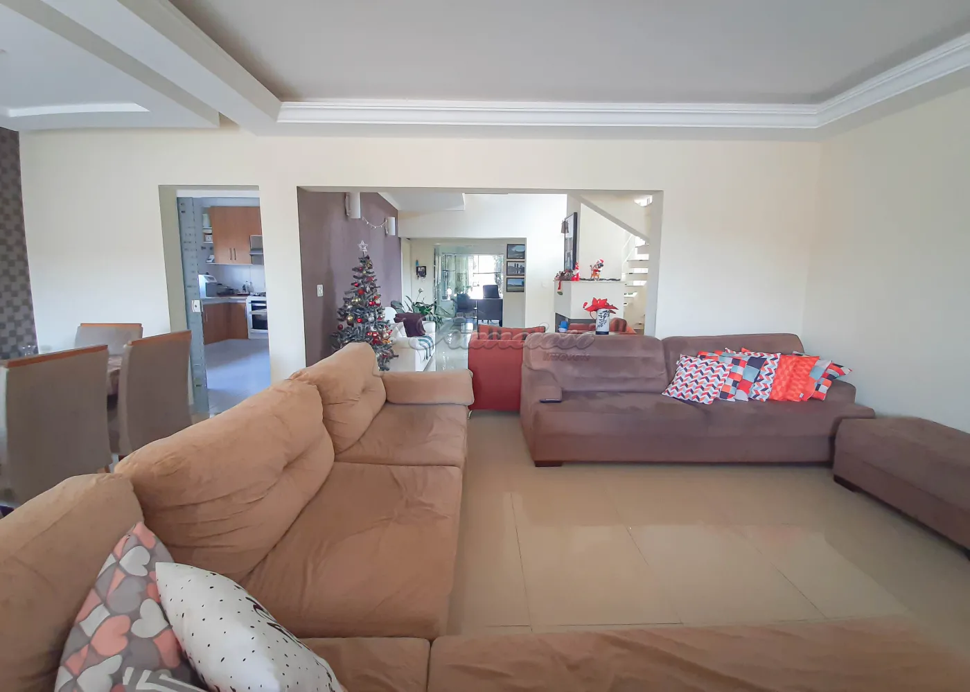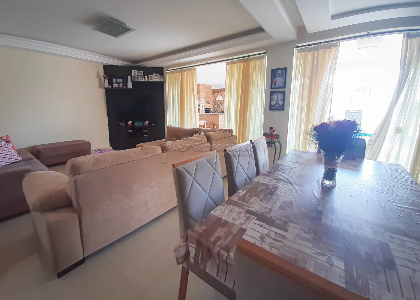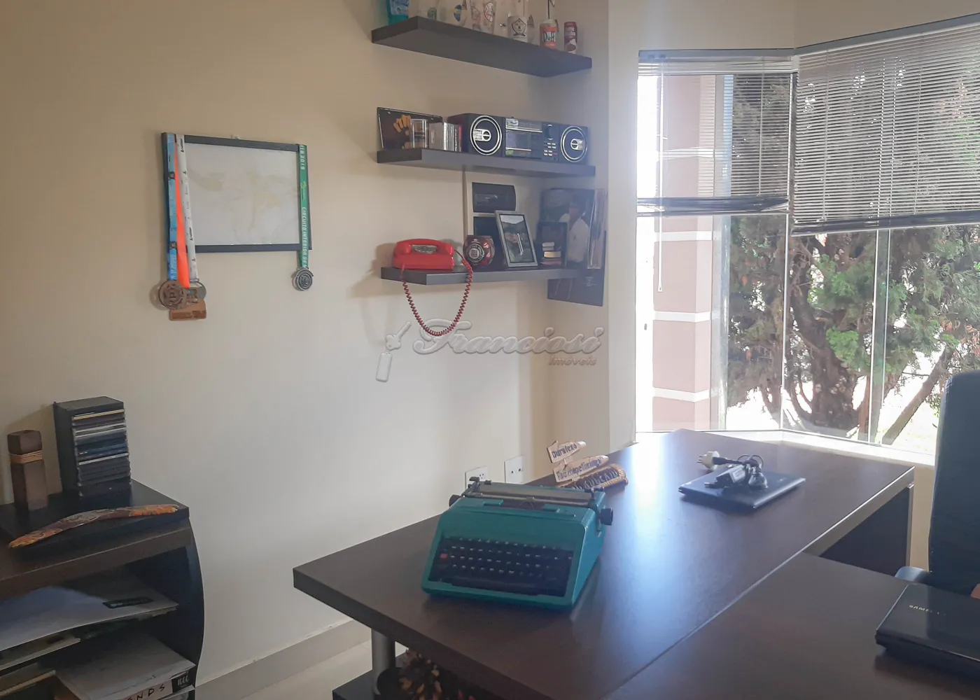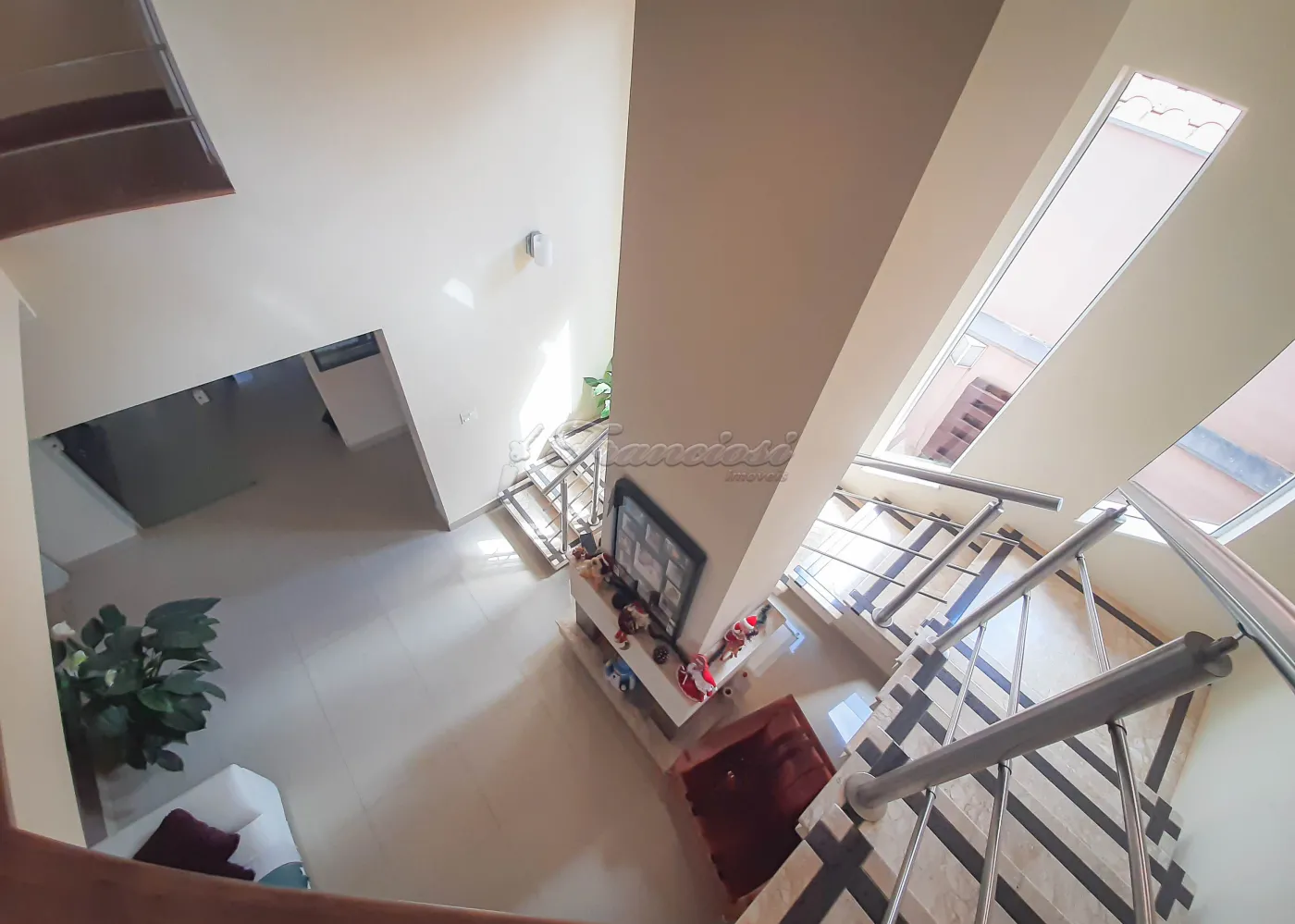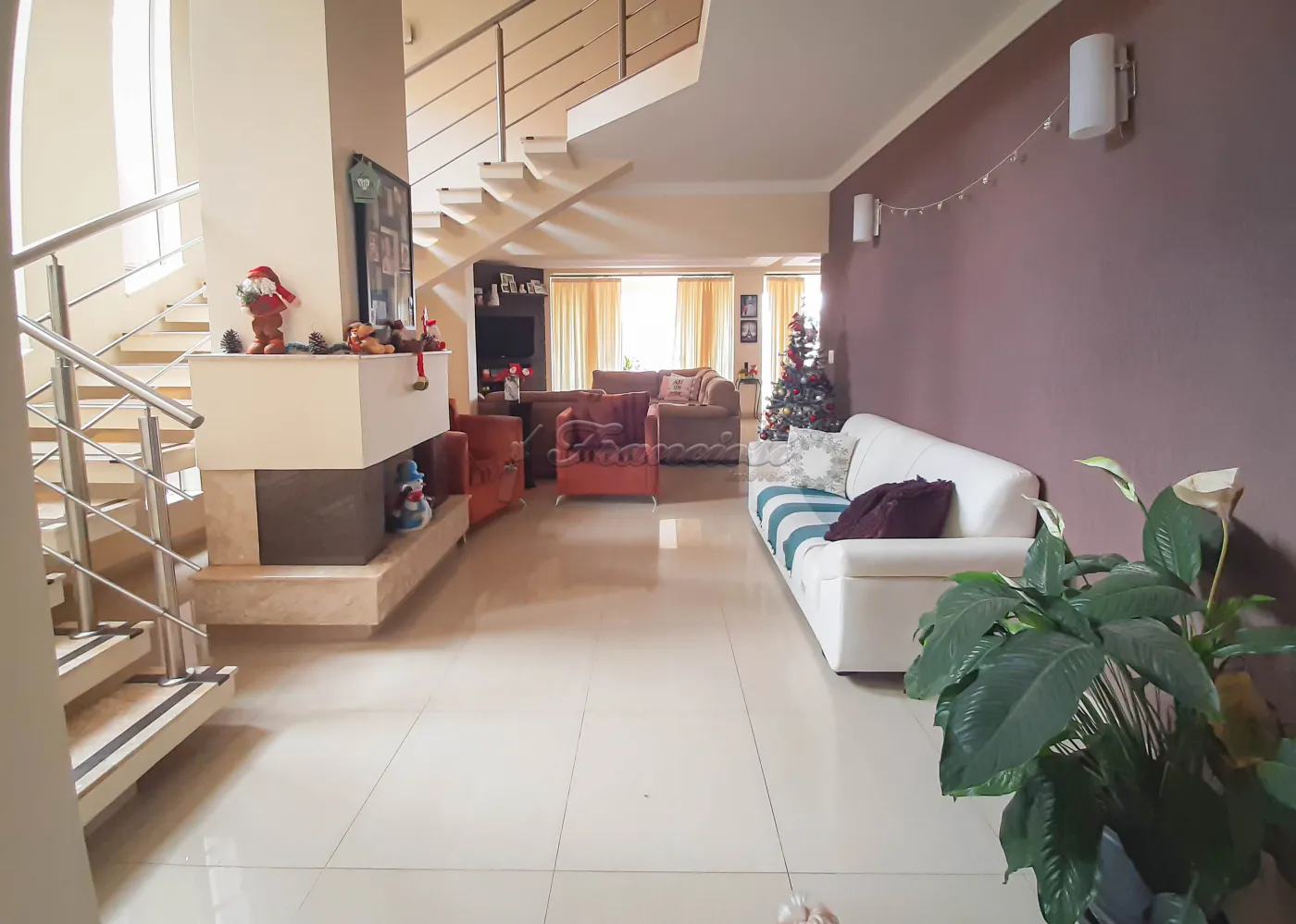 Parte inferior: sala 3 ambientes com lareira, escritório, lavabo, cozinha com armário embutido, lavanderia, área gourmet , piscina e garagem para 2 carros.